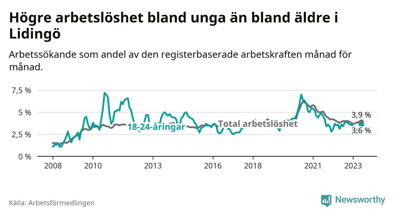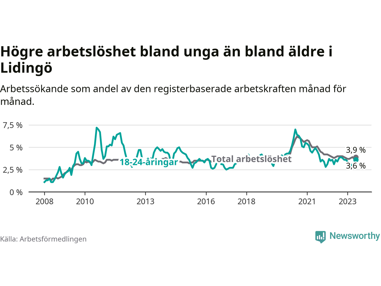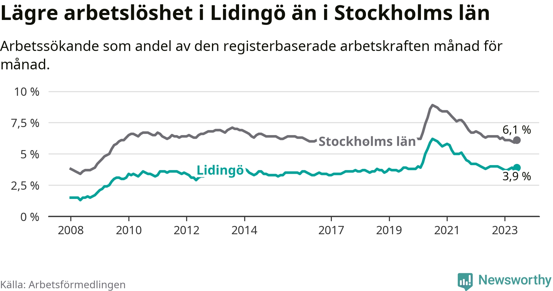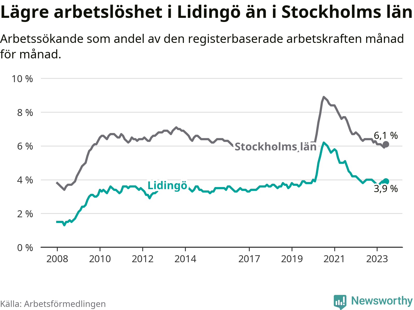 Lidingö går därmed mot strömmen i förhållande till andra kommuner i Stockholms län. I de flesta andra kommuner i länet går arbetslösheten nedåt. Störst är minskningen i Södertälje, där arbetslösheten sjunker med 1,2 procentenheter. I tabellen längre ner ser du utvecklingen i samtliga kommuner i länet.