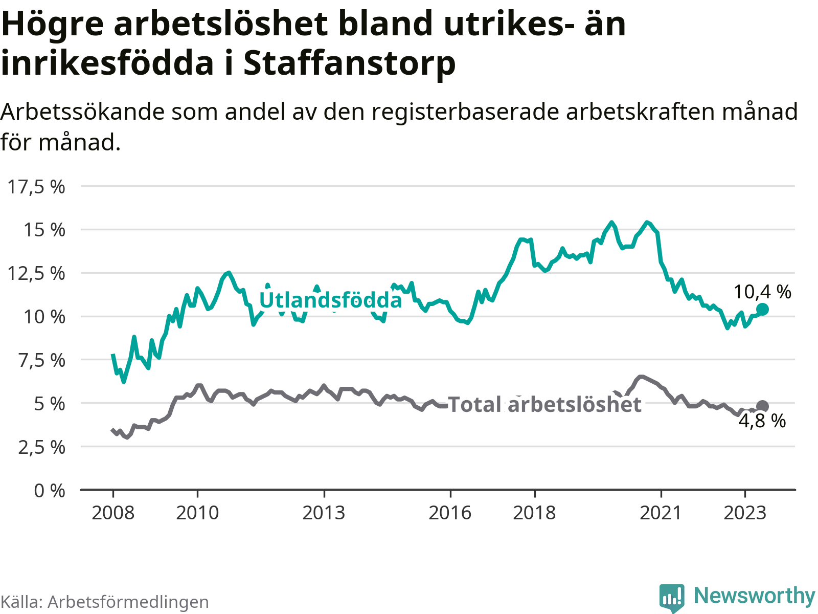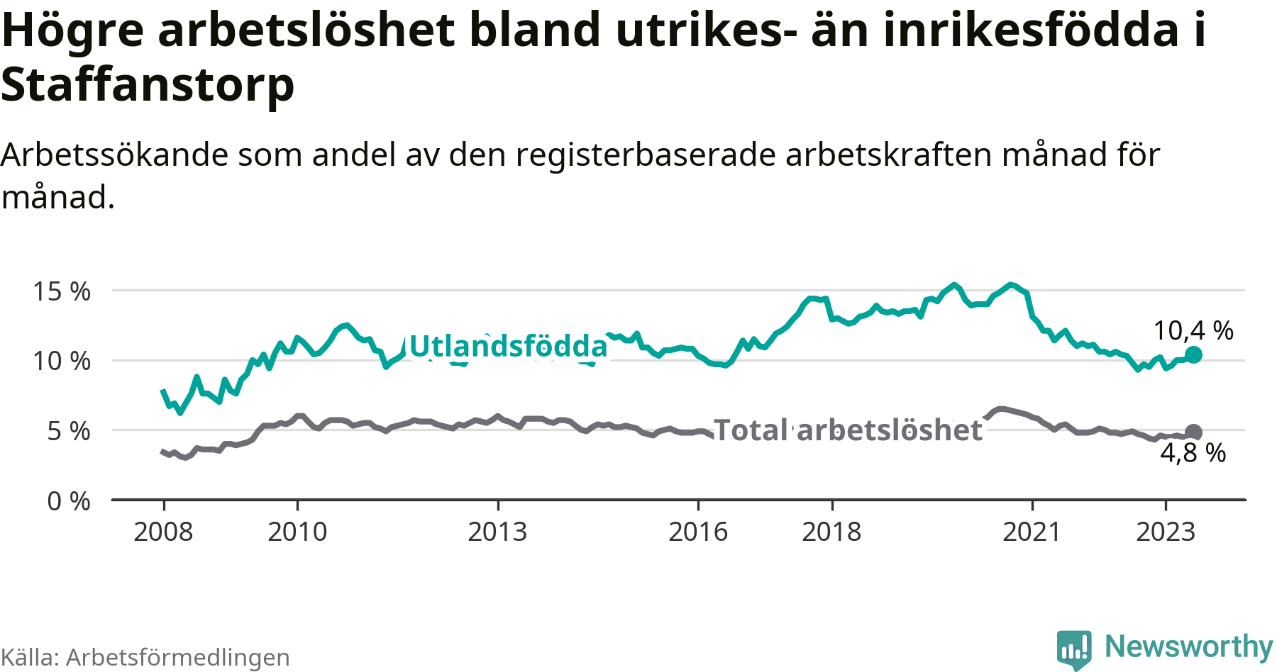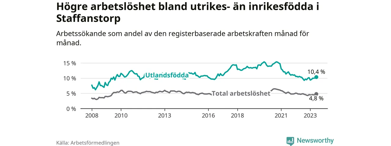 Arbetslösheten bland utlandsfödda var 10,4 procent i Staffanstorp under juni månad, motsvarande 253 av 2 433 personer. Det är 0,1 procentenheter fler än vid samma tidpunkt i fjol (+23 om man räknar personer). Den senaste månadens uppgång innebär ett trendbrott. Under de 31 föregående månaderna hade arbetslösheten bland utlandsfödda varit lägre än motsvarande tidpunkt året innan.
