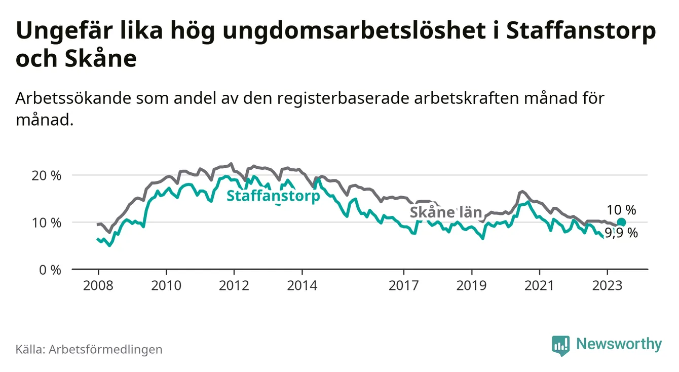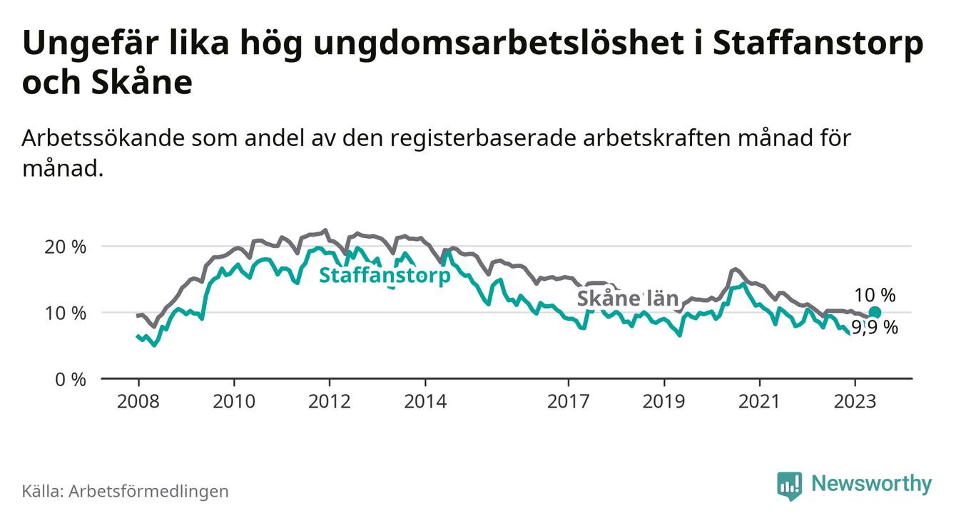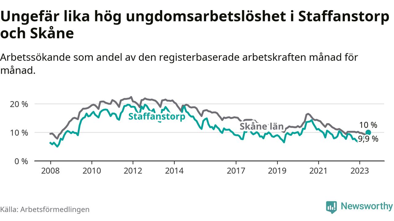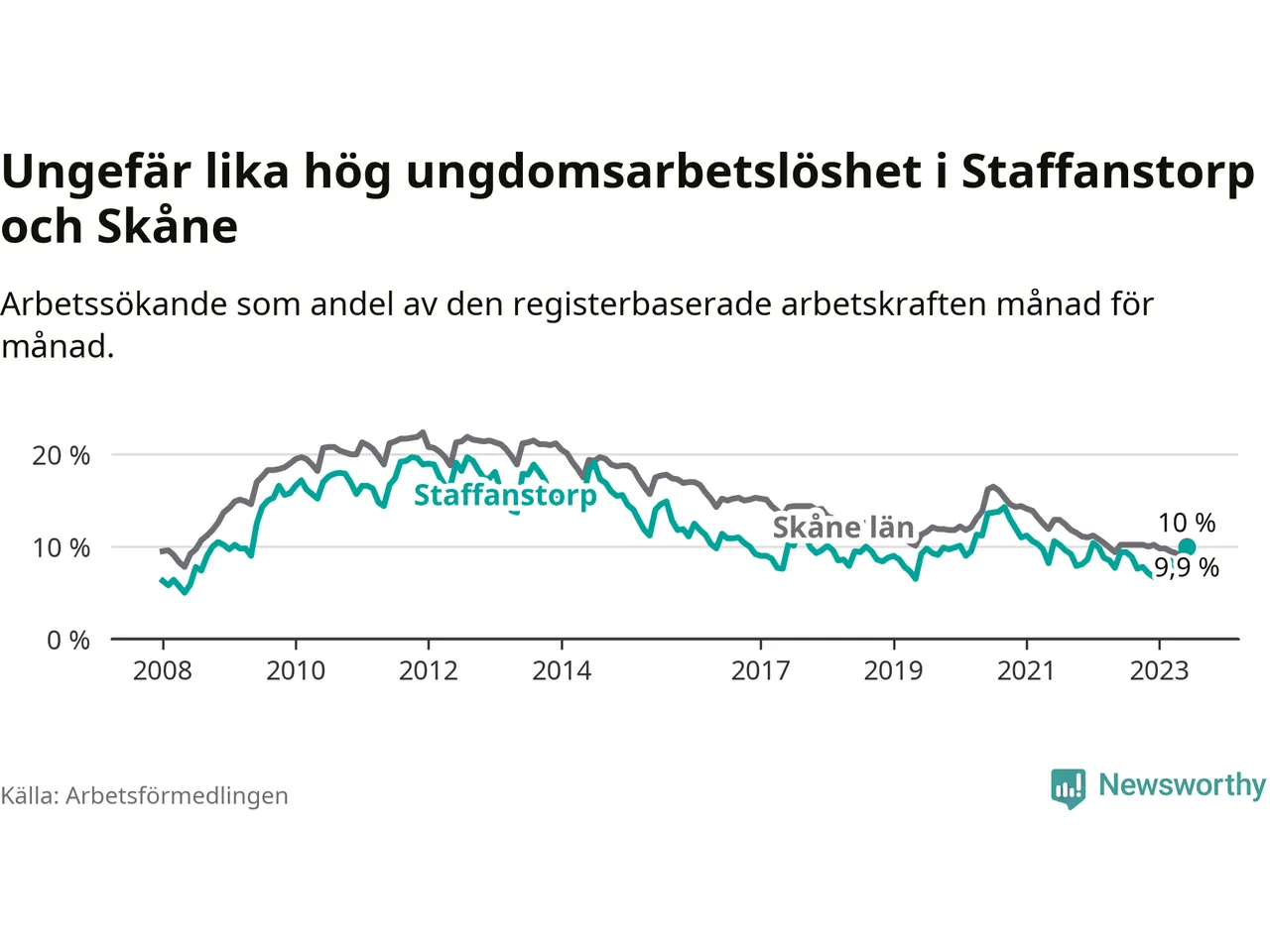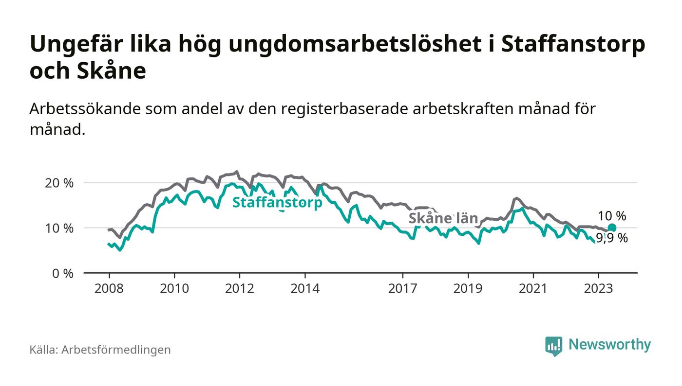 Medan Staffanstorp har lägre total arbetslöshet än Skåne, ligger ungdomsarbetslösheten på i stort sett samma nivå.
