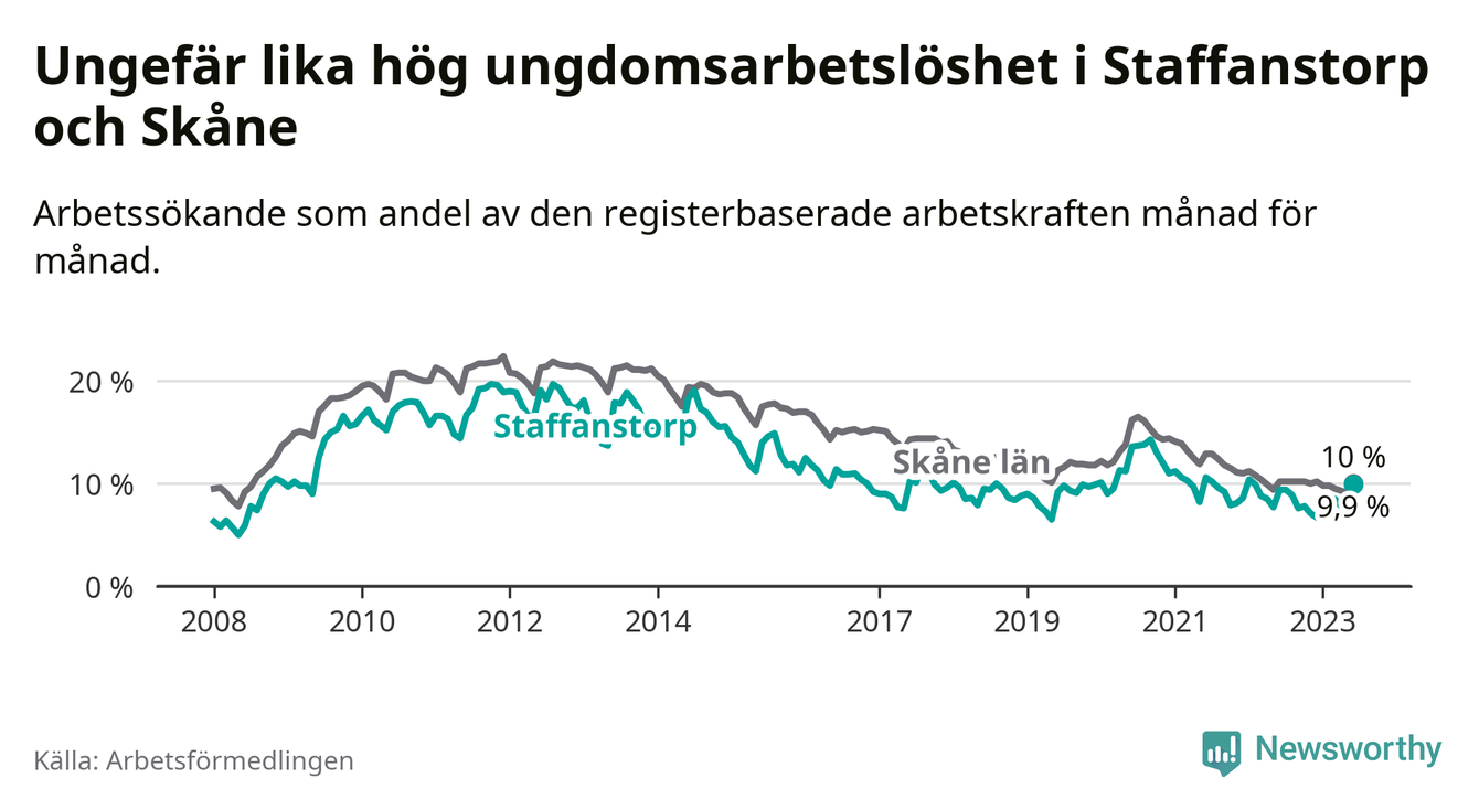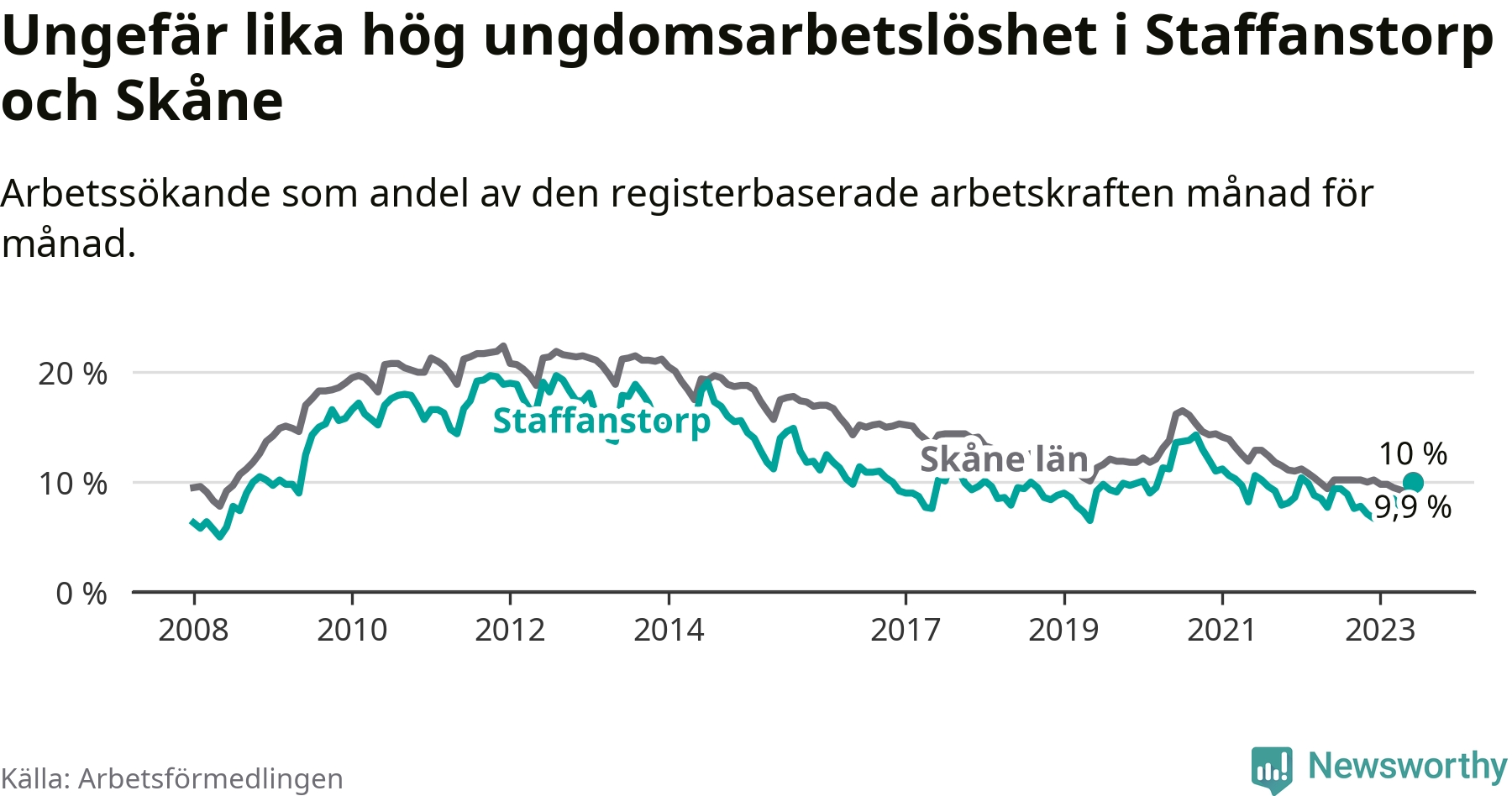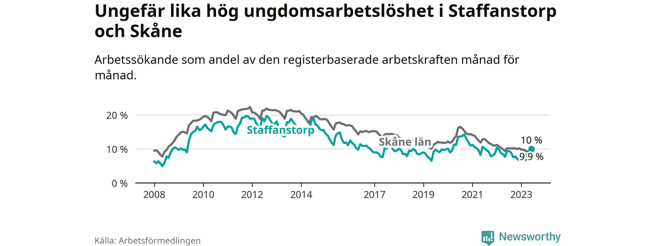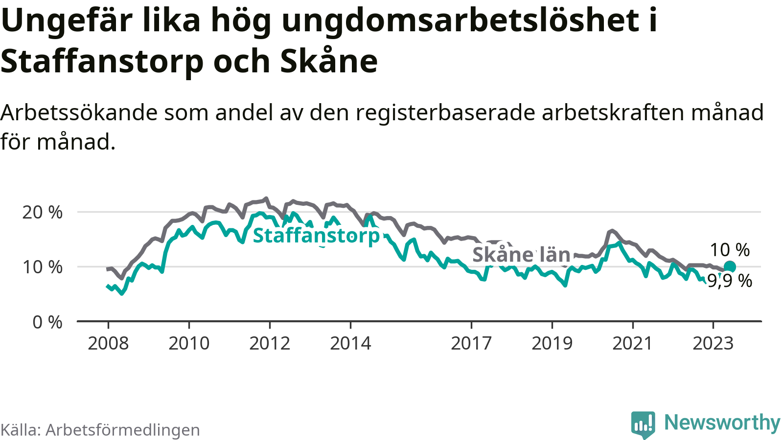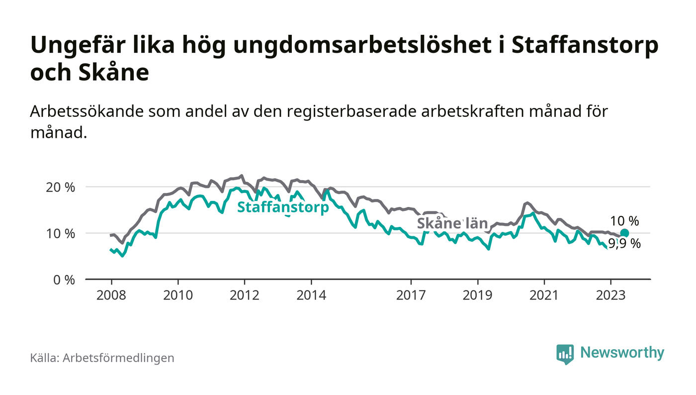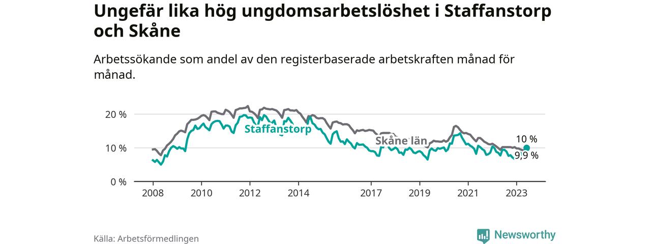 Medan Staffanstorp har lägre total arbetslöshet än Skåne, ligger ungdomsarbetslösheten på i stort sett samma nivå.