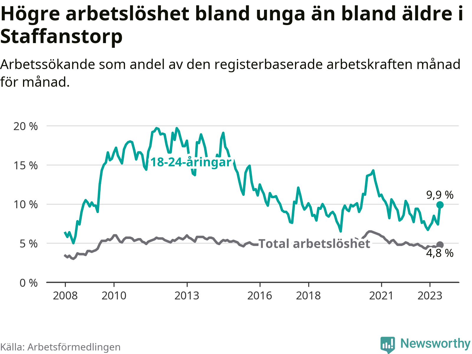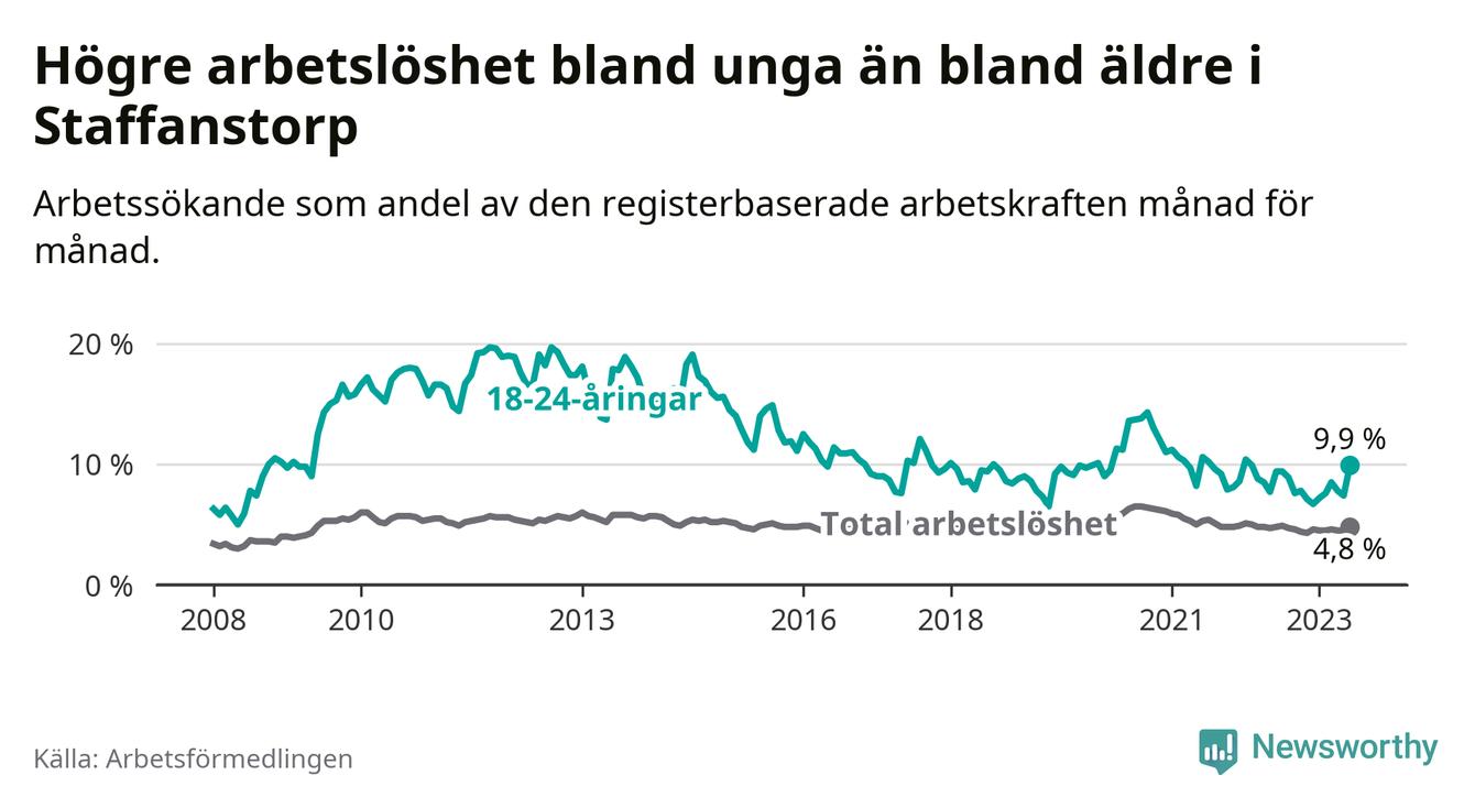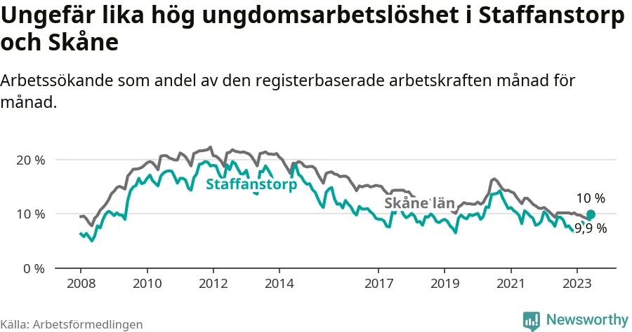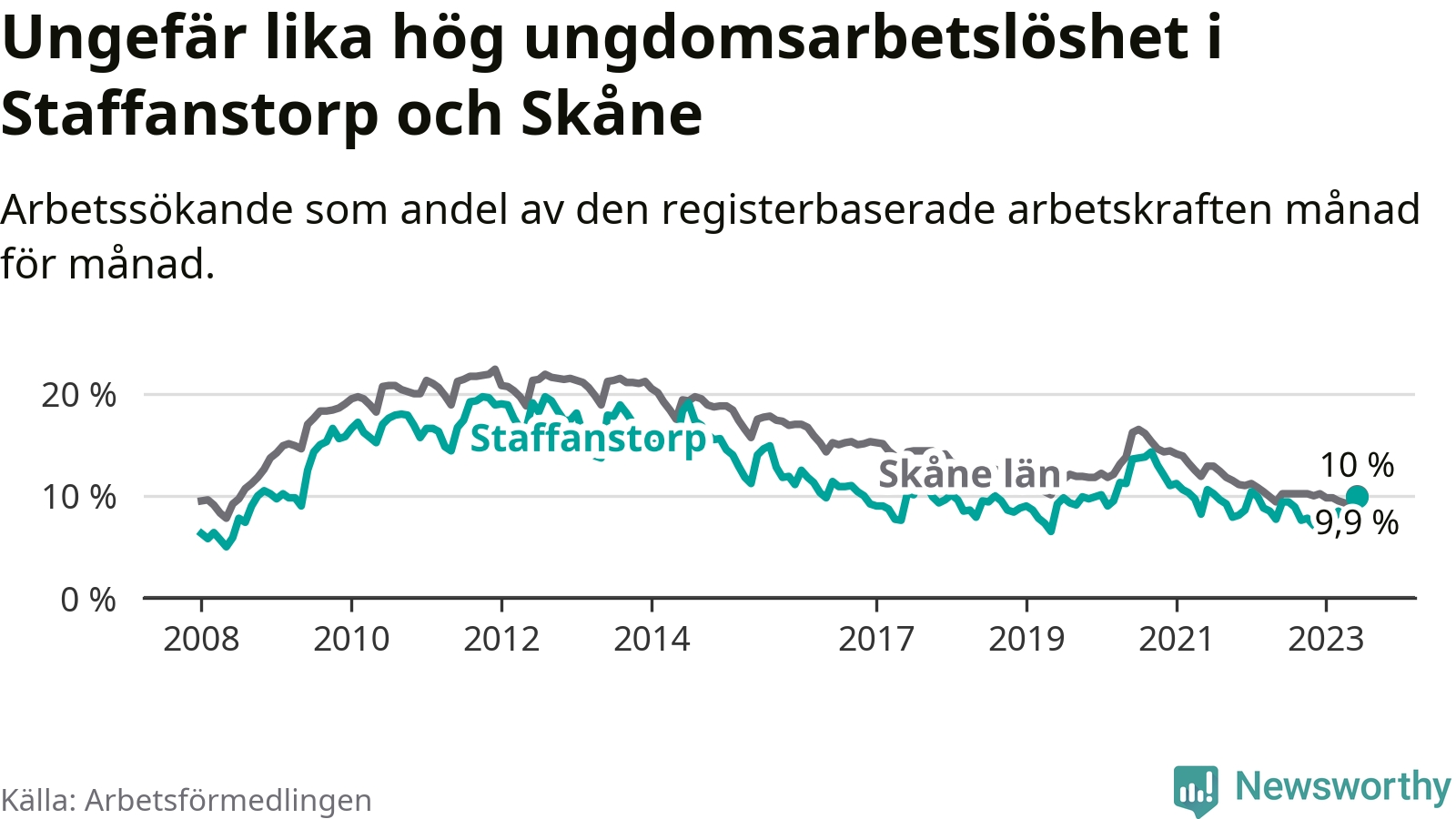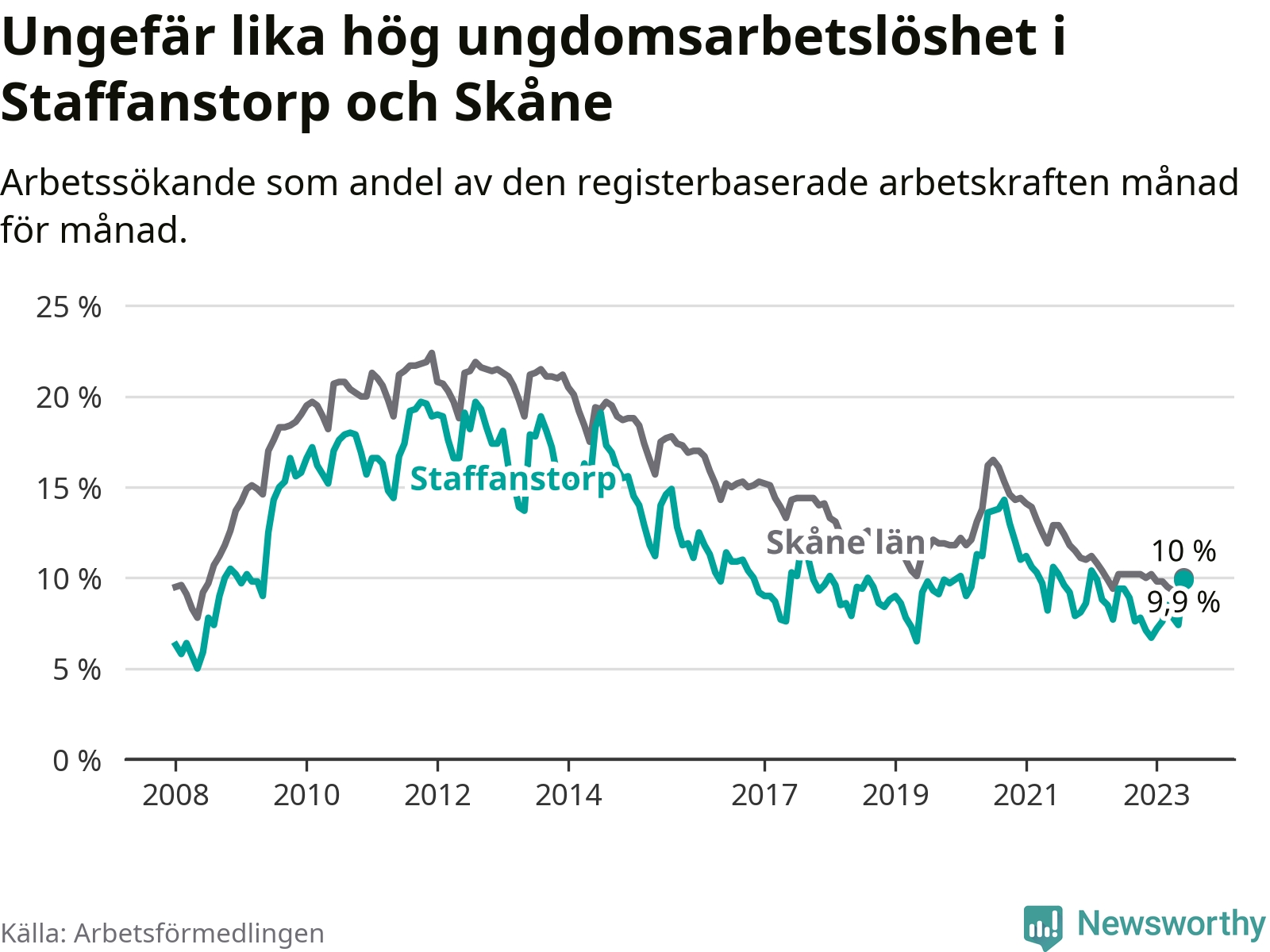 Medan Staffanstorp har lägre total arbetslöshet än Skåne, ligger ungdomsarbetslösheten på i stort sett samma nivå.