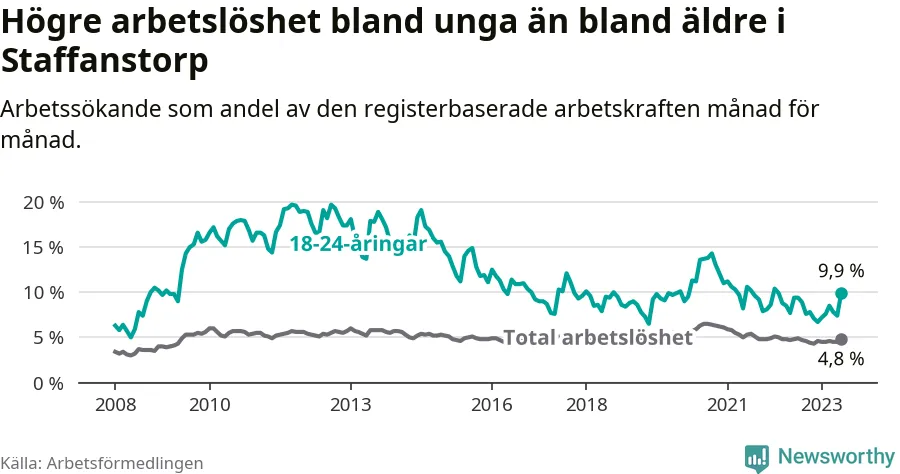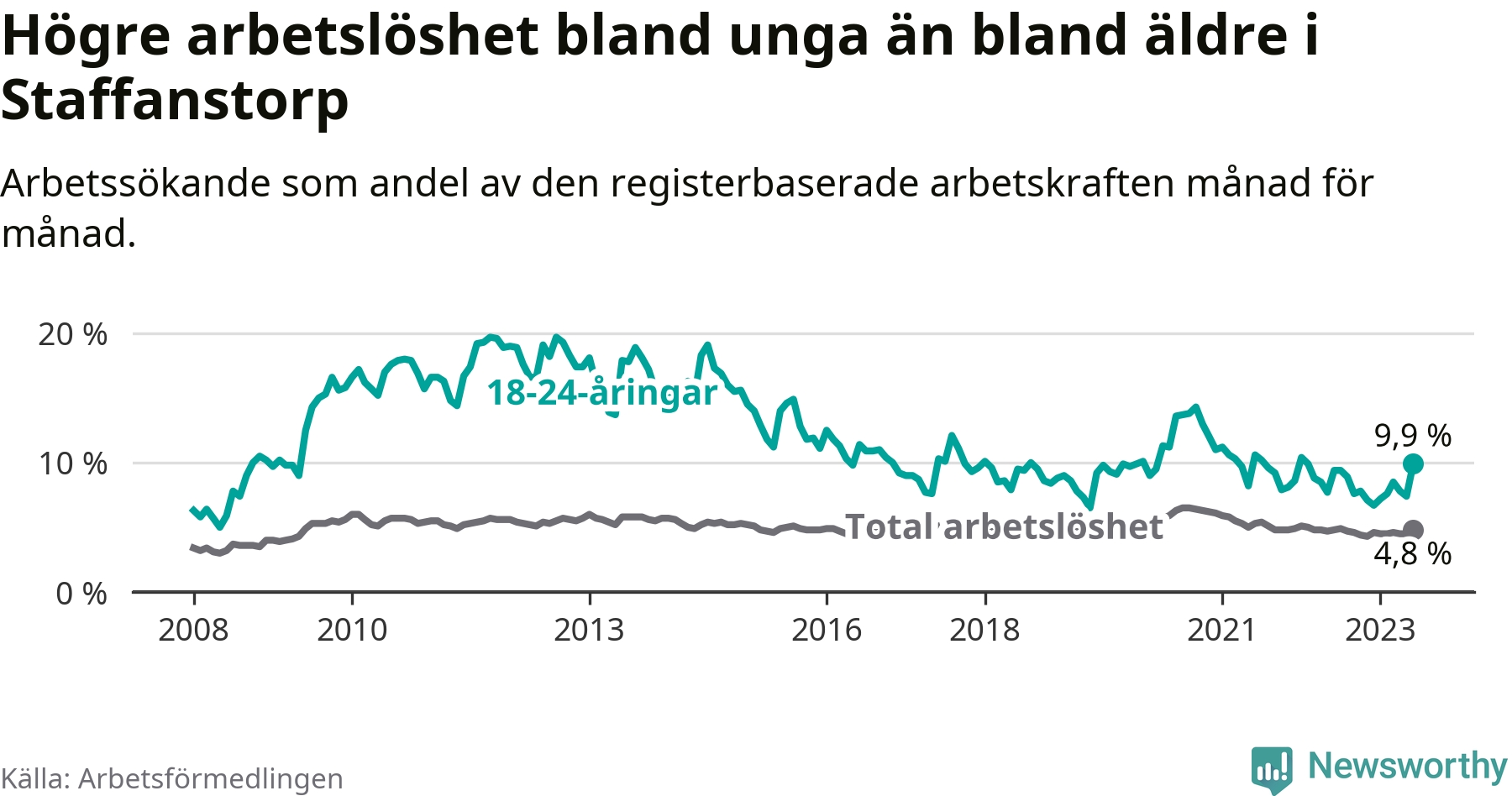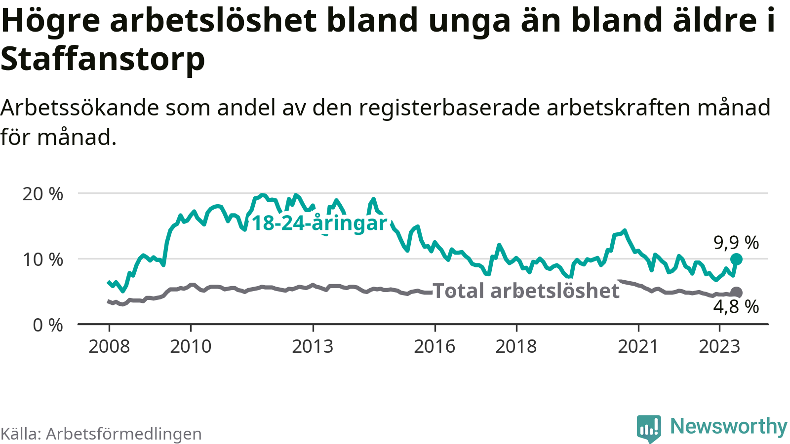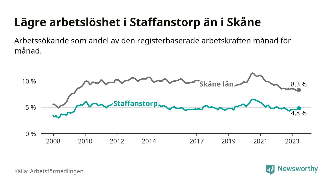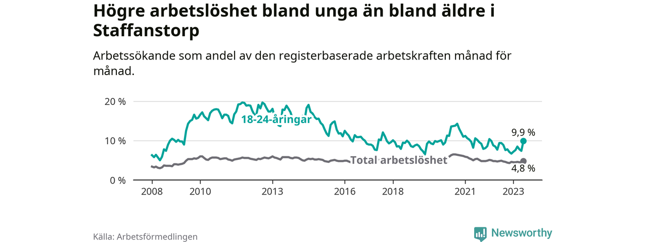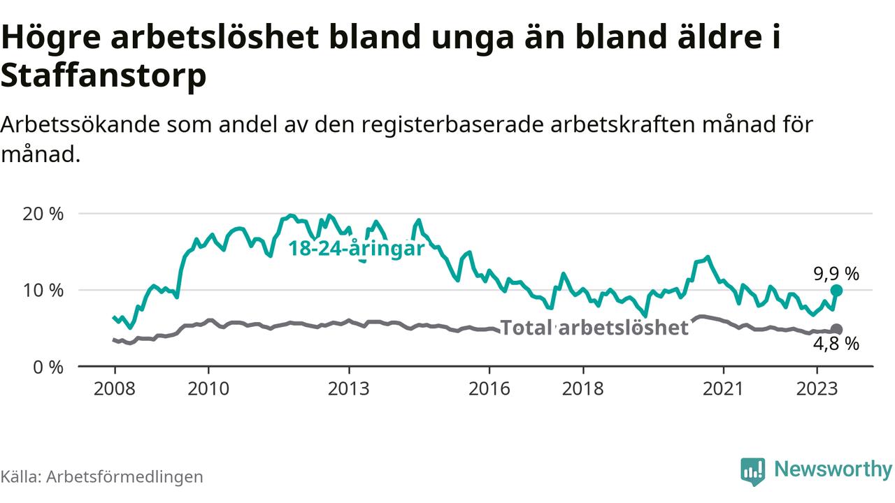 Medan Staffanstorp har lägre total arbetslöshet än Skåne, ligger ungdomsarbetslösheten på i stort sett samma nivå.
