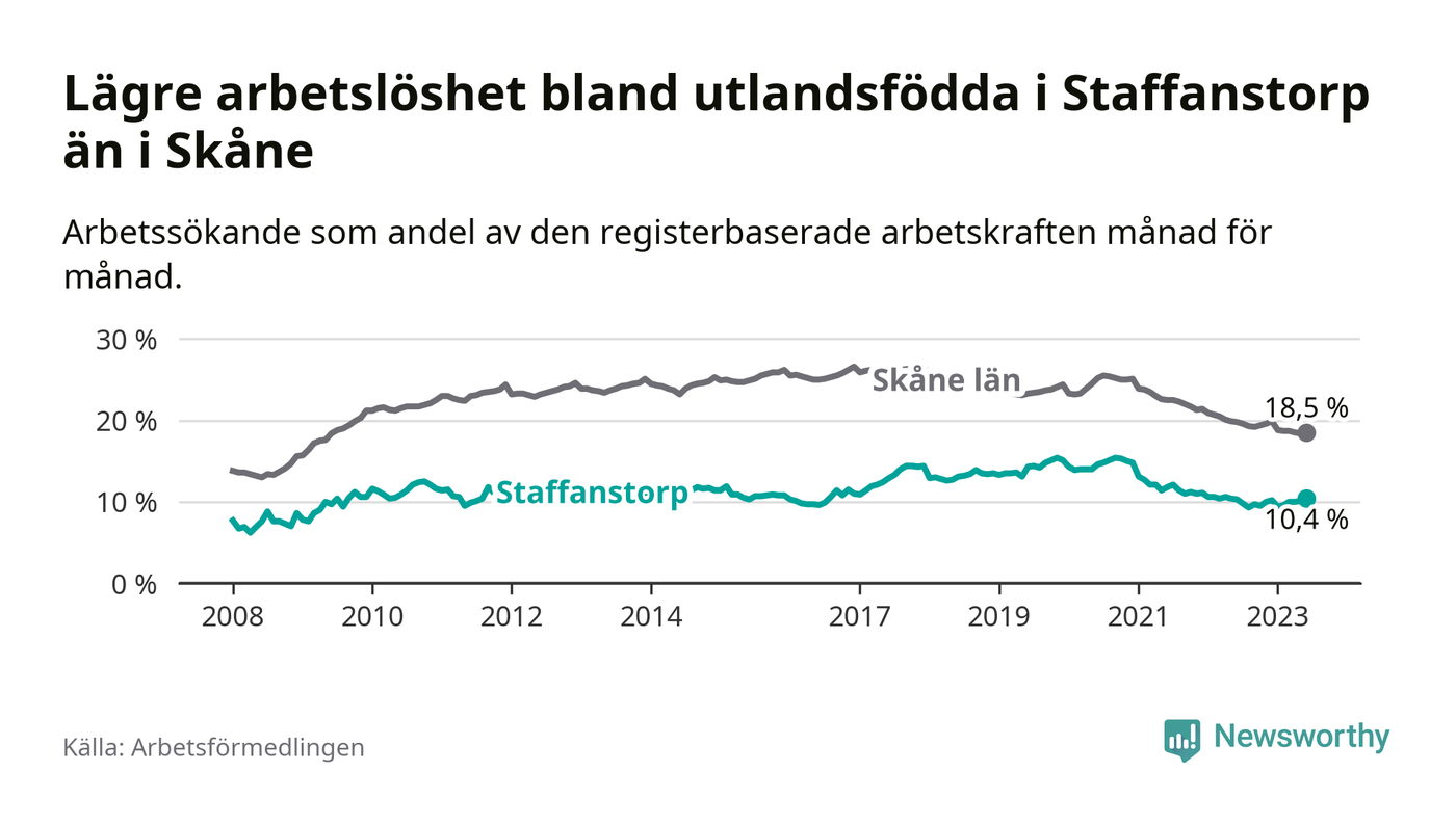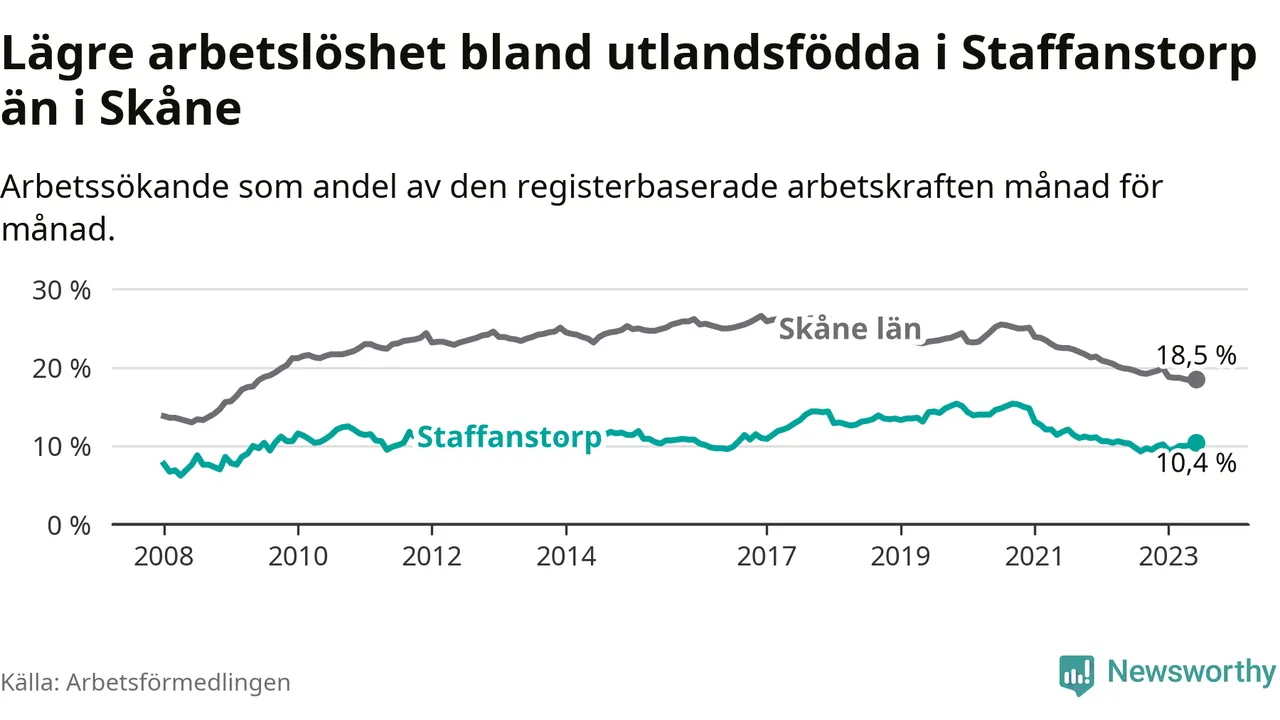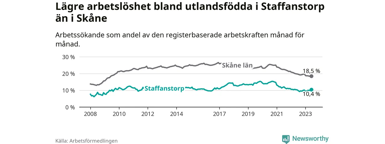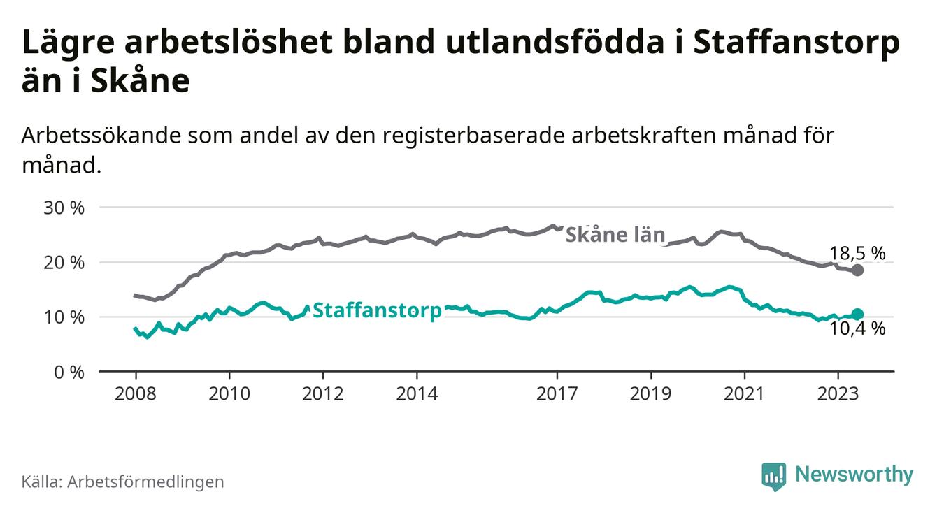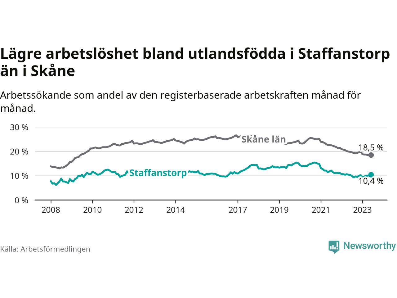Medan arbetslösheten bland utlandsfödda alltså ökar i Staffanstorp så minskar den i Skåne. Jämfört med juni förra året har andelen arbetslösa utlandsfödda i länet minskat med 1,3 procentenheter (till 18,5 procent). Trots den senaste uppgången har Staffanstorp med andra ord fortfarande lägre arbetslöshet bland utlandsfödda än Skåne.