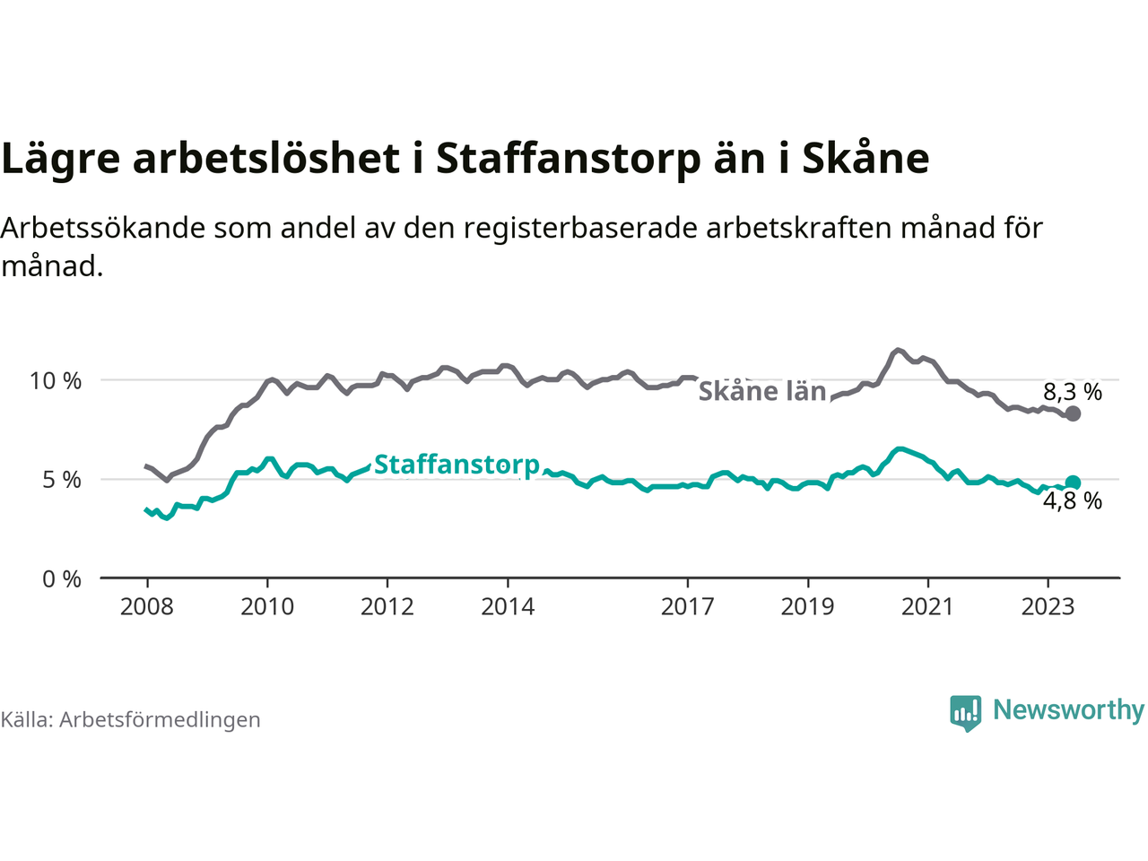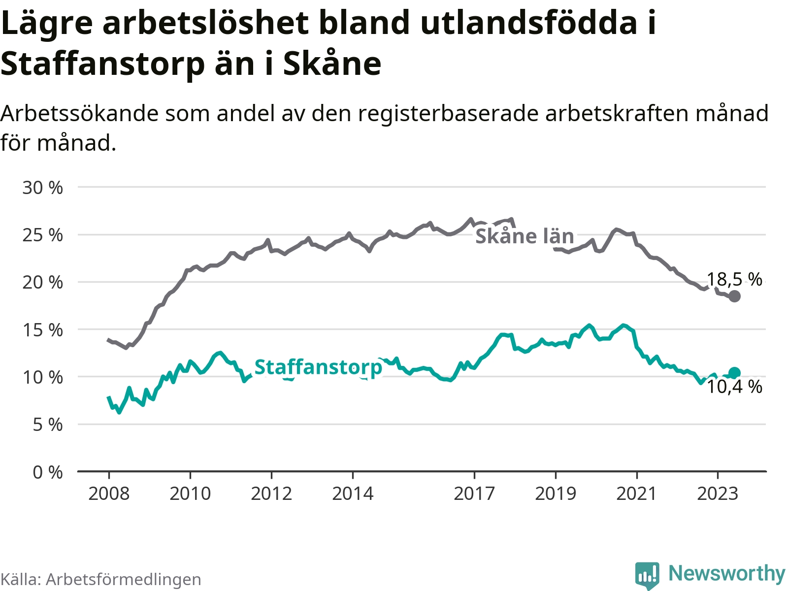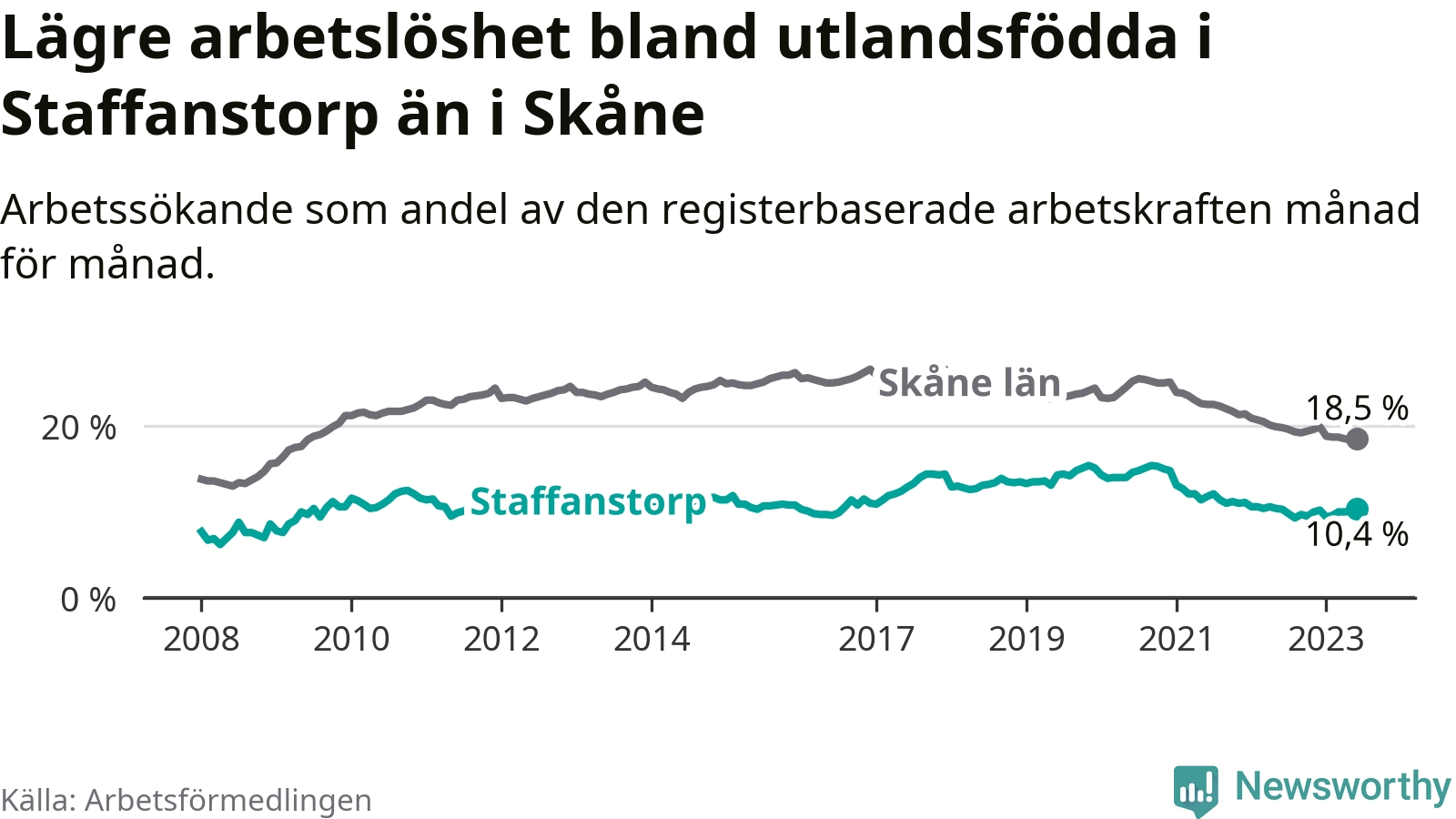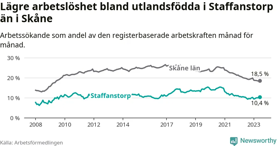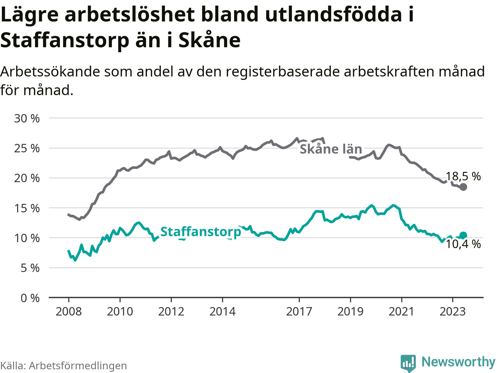 Medan arbetslösheten bland utlandsfödda alltså ökar i Staffanstorp så minskar den i Skåne. Jämfört med juni förra året har andelen arbetslösa utlandsfödda i länet minskat med 1,3 procentenheter (till 18,5 procent). Trots den senaste uppgången har Staffanstorp med andra ord fortfarande lägre arbetslöshet bland utlandsfödda än Skåne.