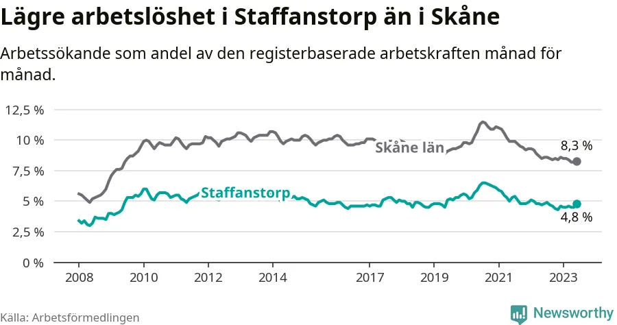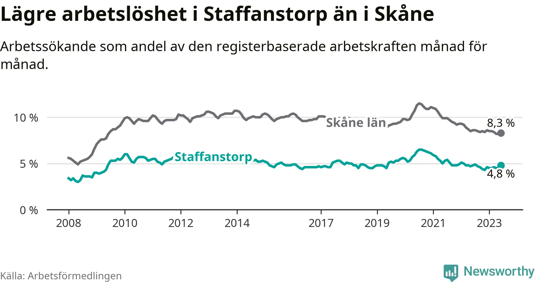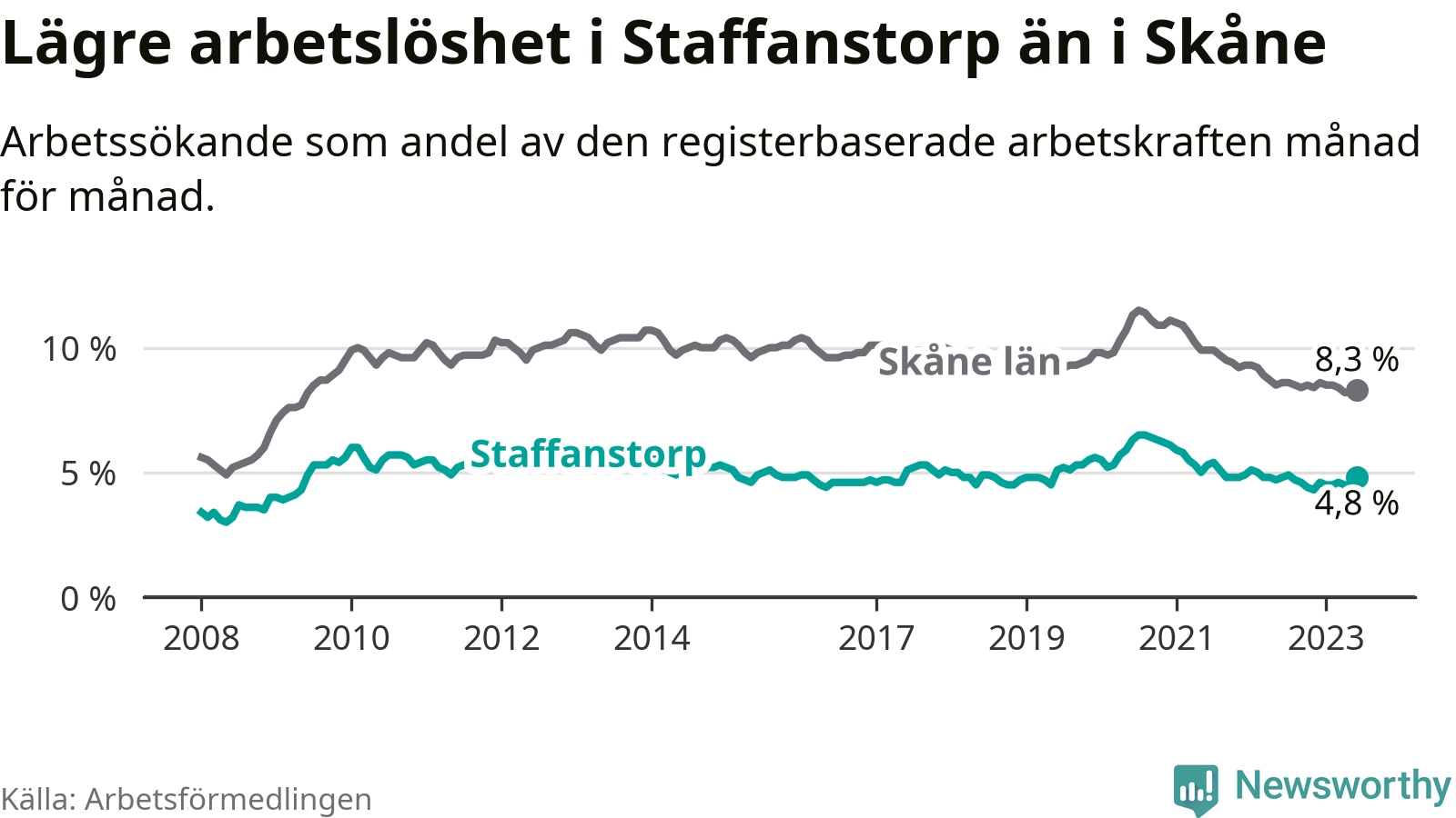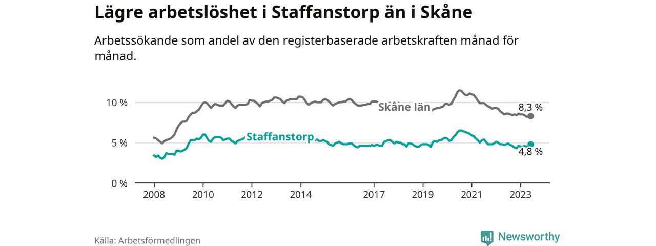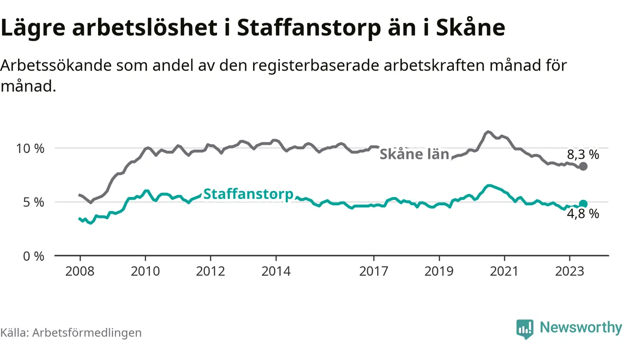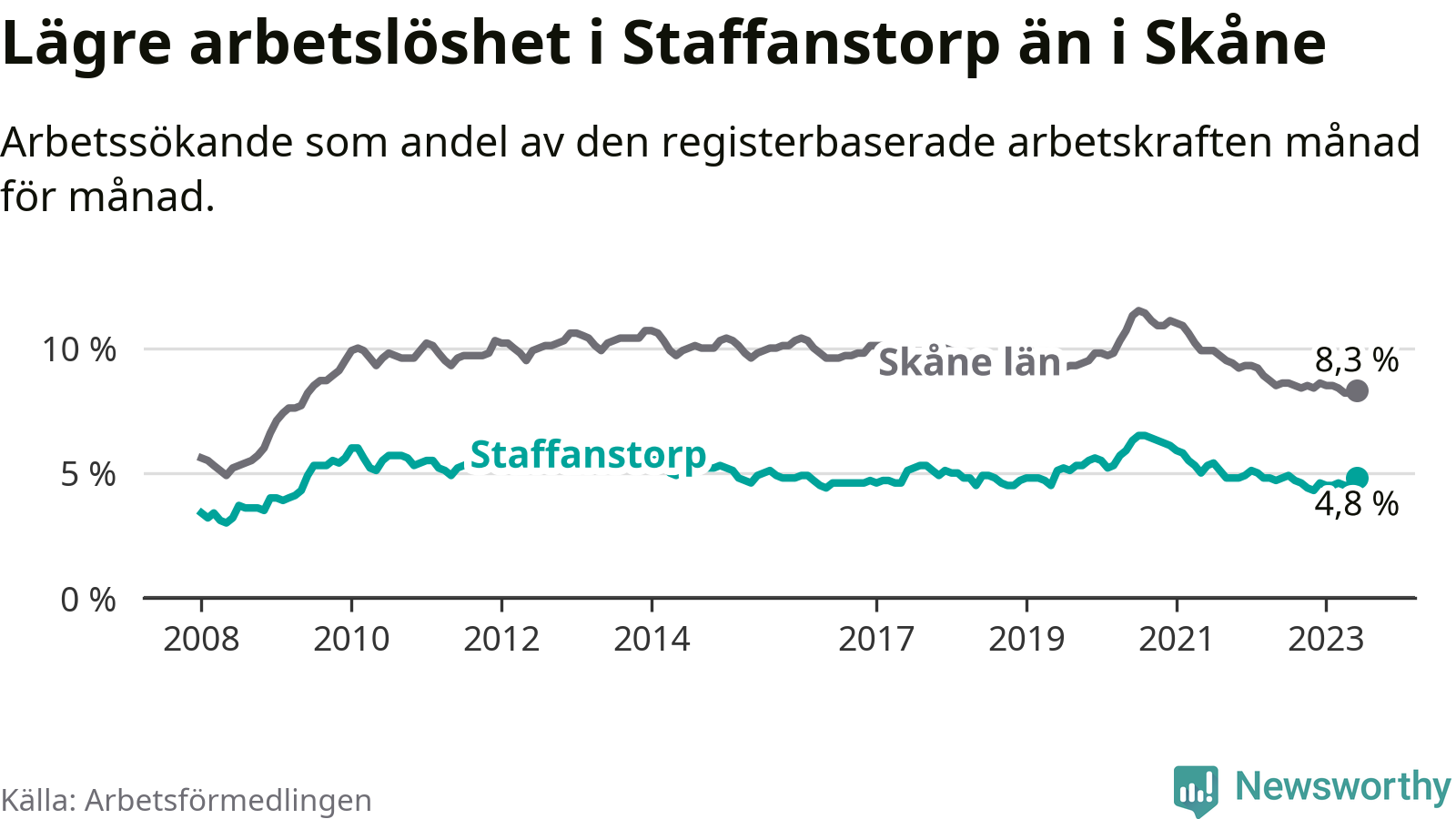 Medan arbetslösheten bland utlandsfödda alltså ökar i Staffanstorp så minskar den i Skåne. Jämfört med juni förra året har andelen arbetslösa utlandsfödda i länet minskat med 1,3 procentenheter (till 18,5 procent). Trots den senaste uppgången har Staffanstorp med andra ord fortfarande lägre arbetslöshet bland utlandsfödda än Skåne.