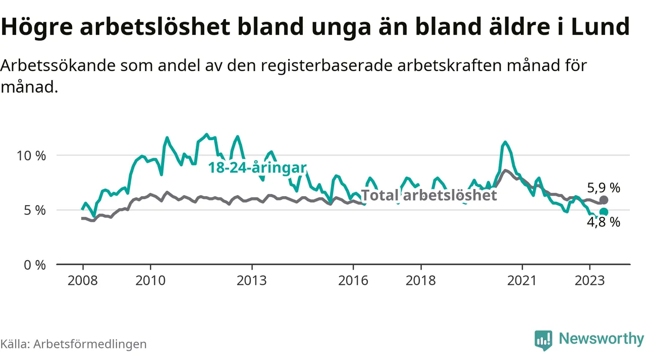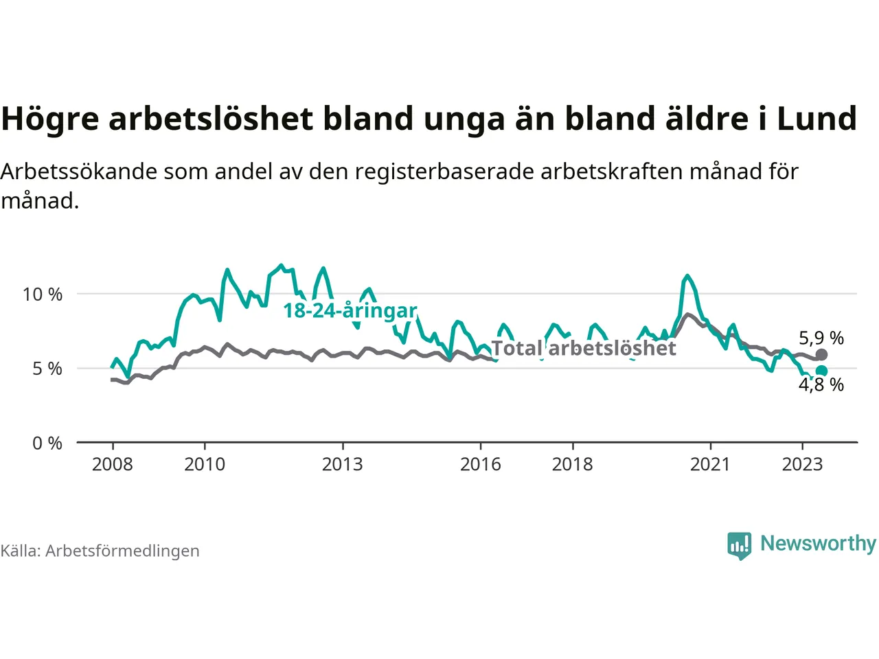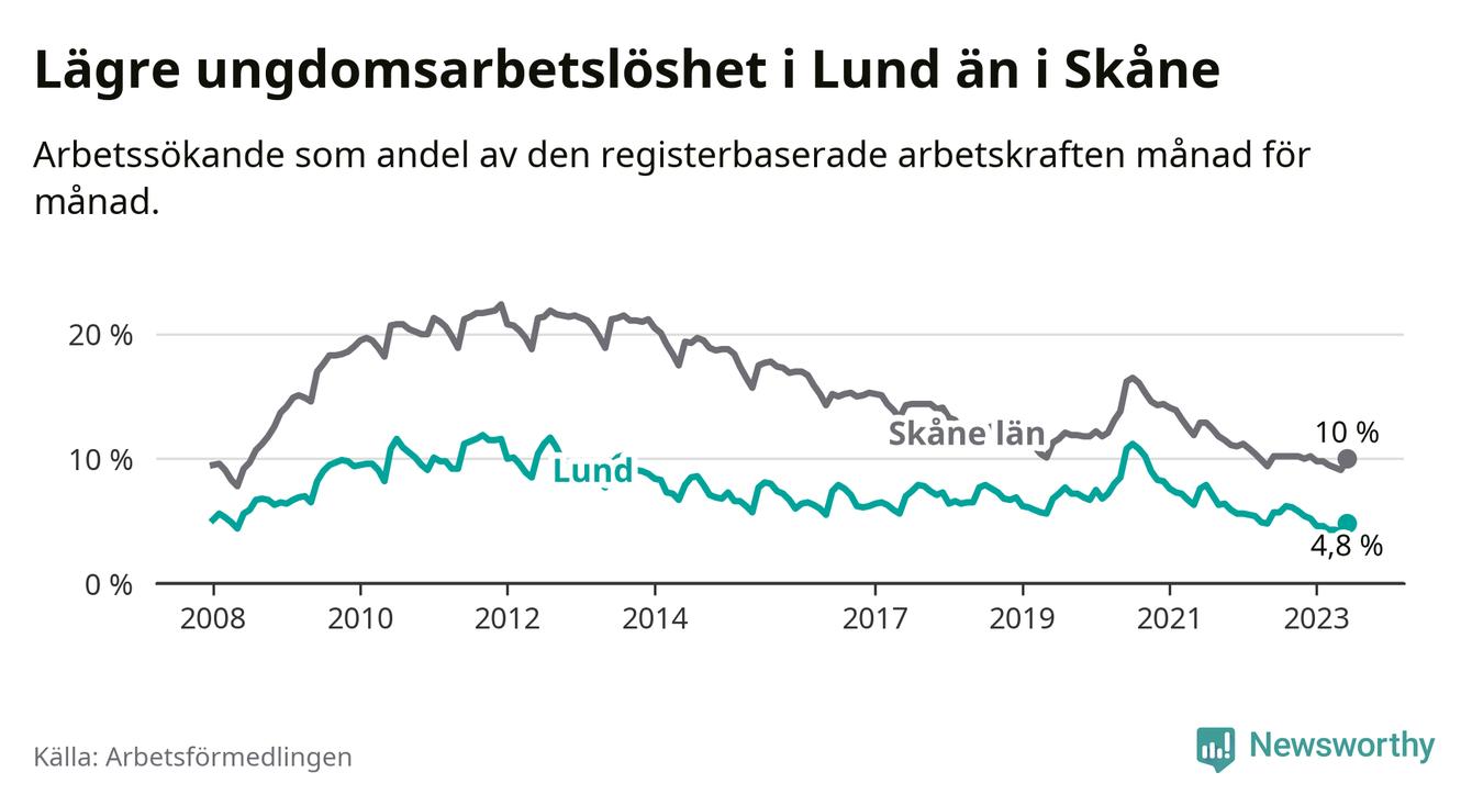 I och med den senaste månadens nedgång har de ungas arbetslöshet i Lund sjunkit över två år i sträck (ner från 7,2 procent i mars 2021 till 4,8 procent nu).