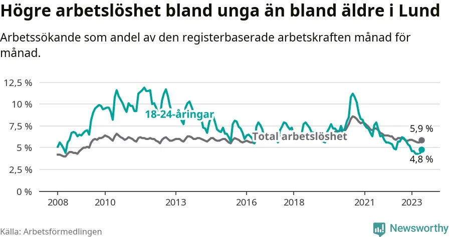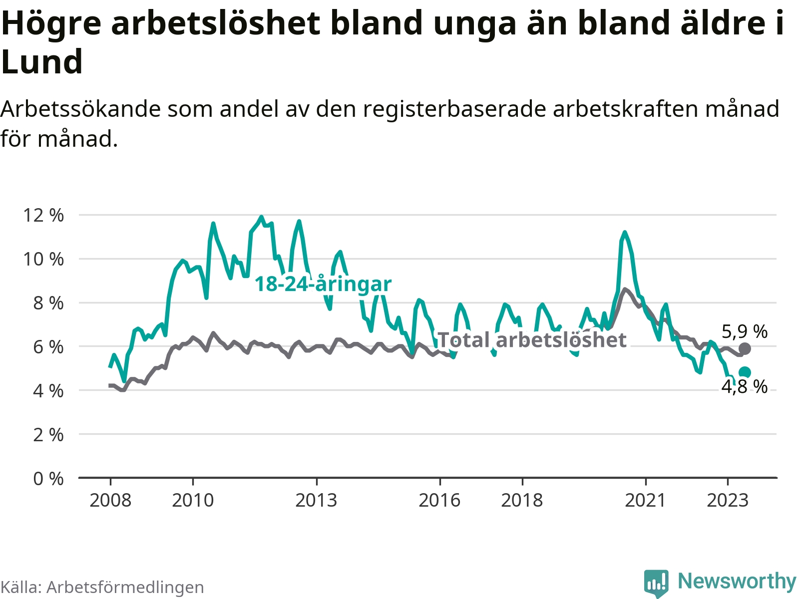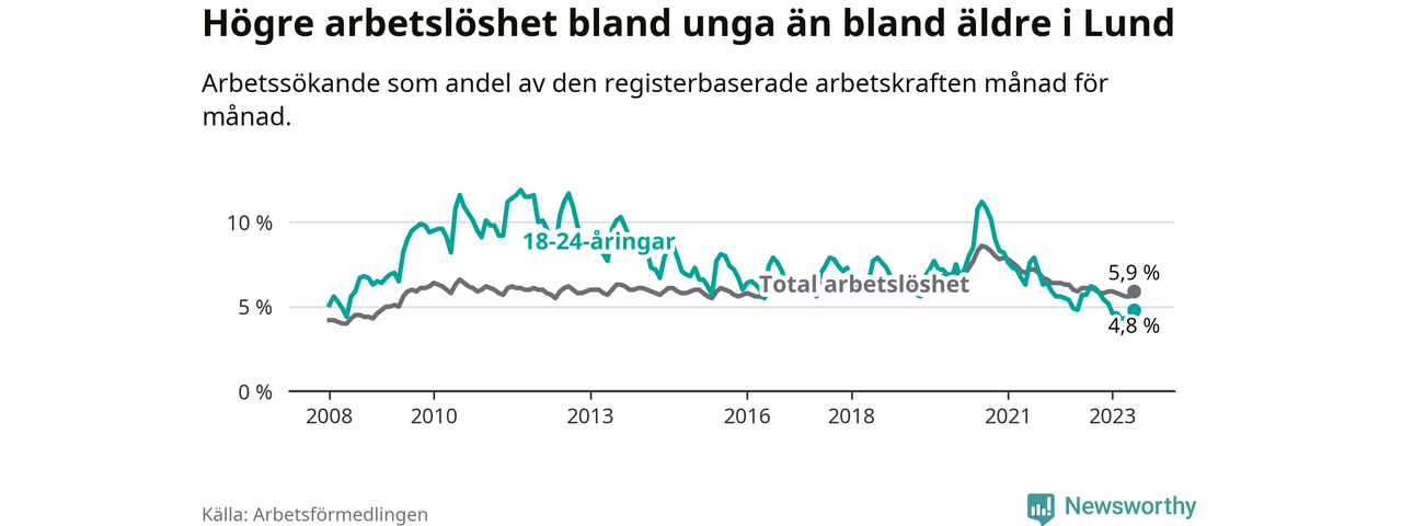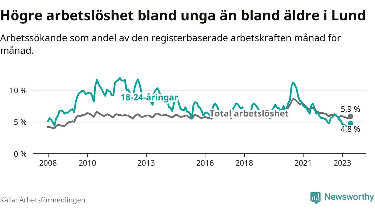 I och med den senaste månadens nedgång har de ungas arbetslöshet i Lund sjunkit över två år i sträck (ner från 7,2 procent i mars 2021 till 4,8 procent nu).