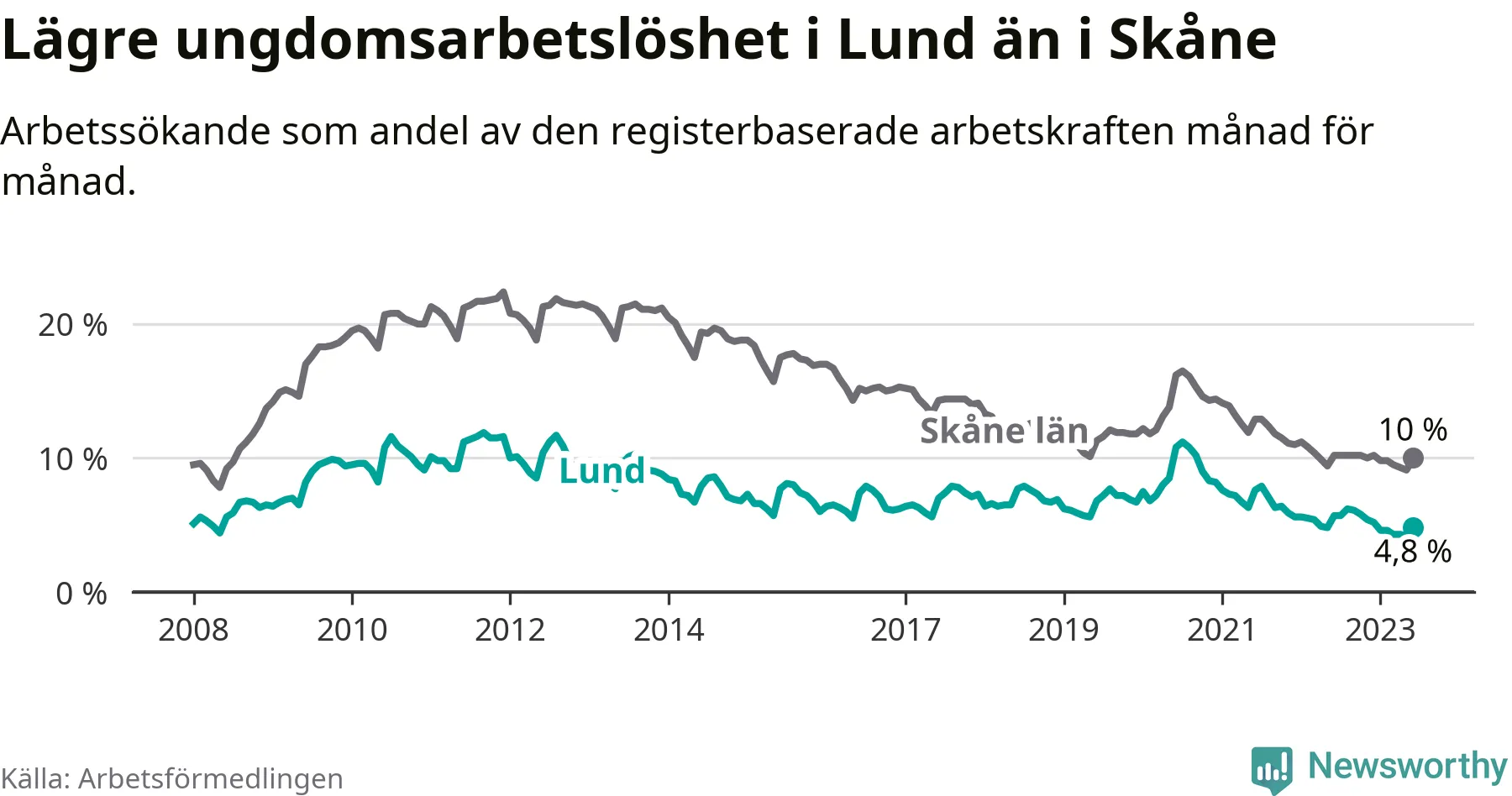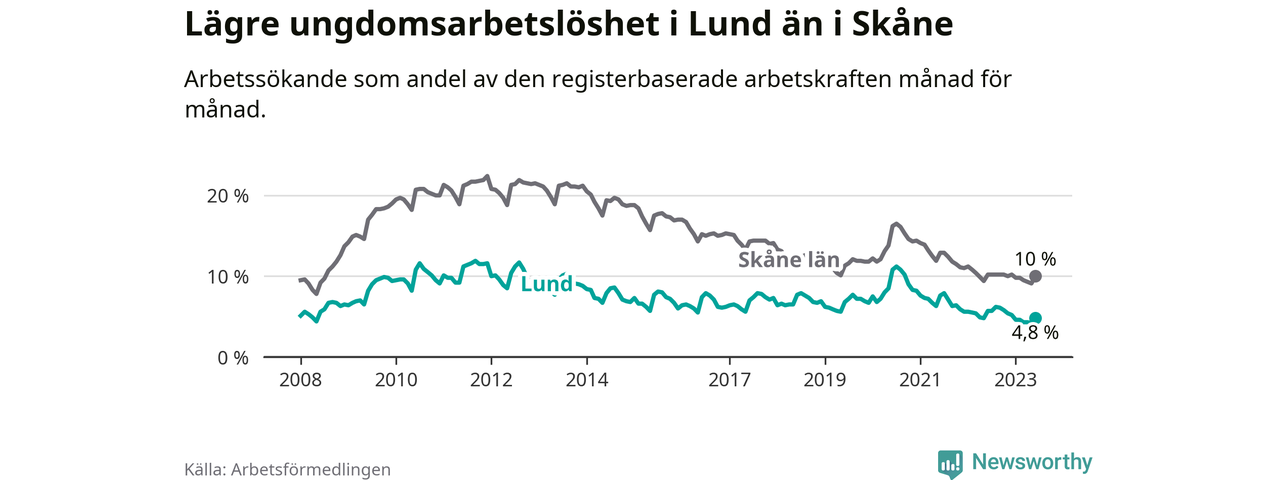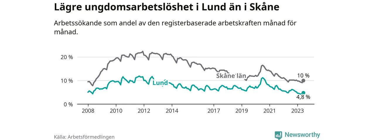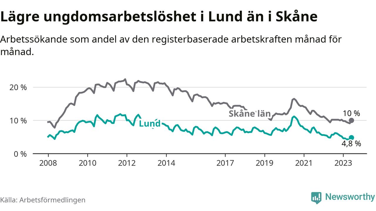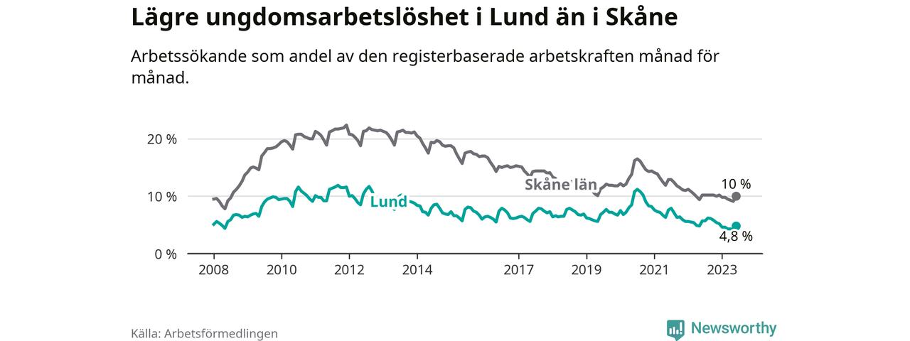 Precis som den totala arbetslösheten ligger ungdomsarbetslösheten i Lund lägre än i Skåne som helhet. Skillnaden mellan kommunen och länet är 5,2 procentenheter.