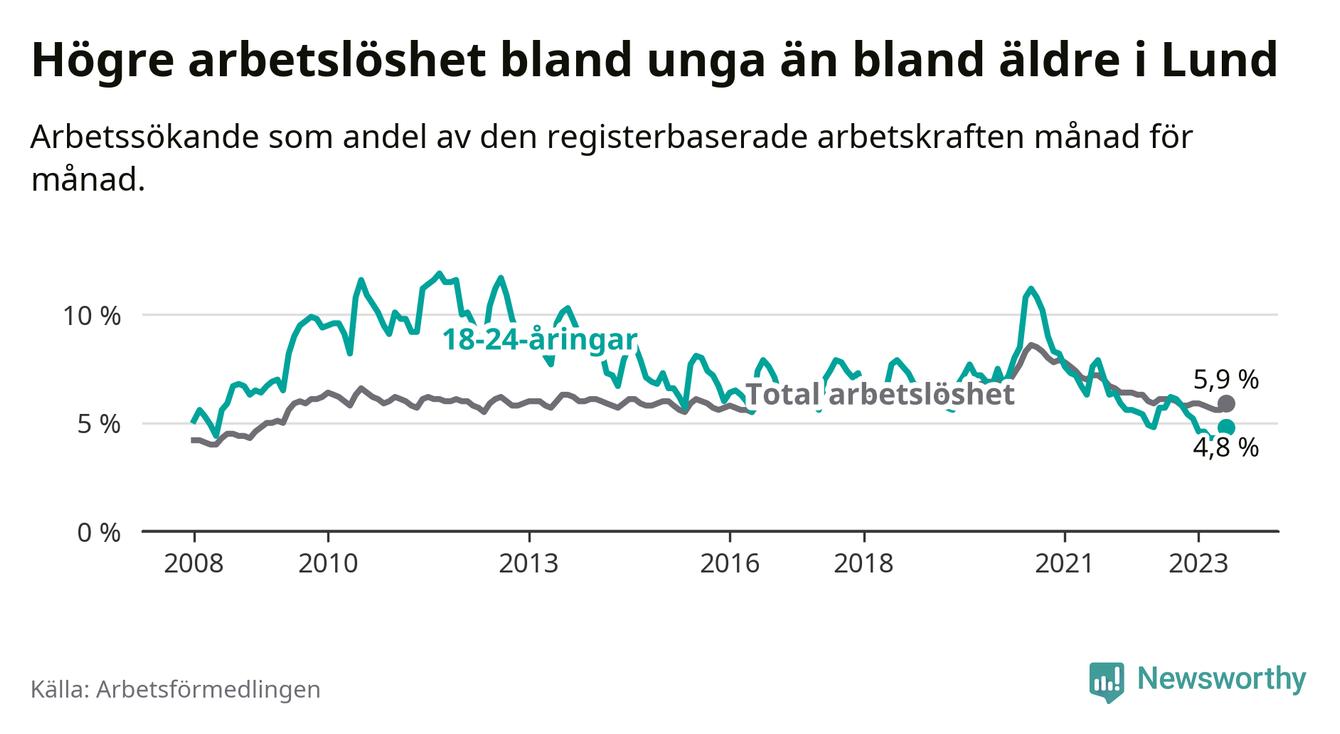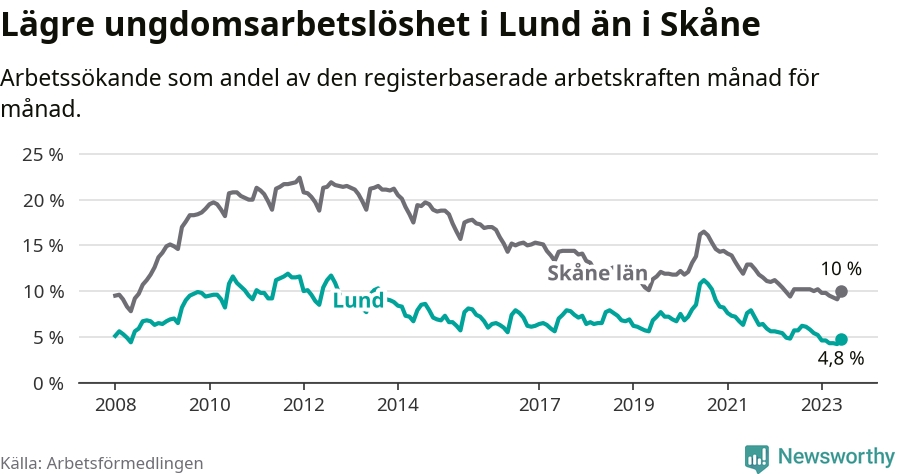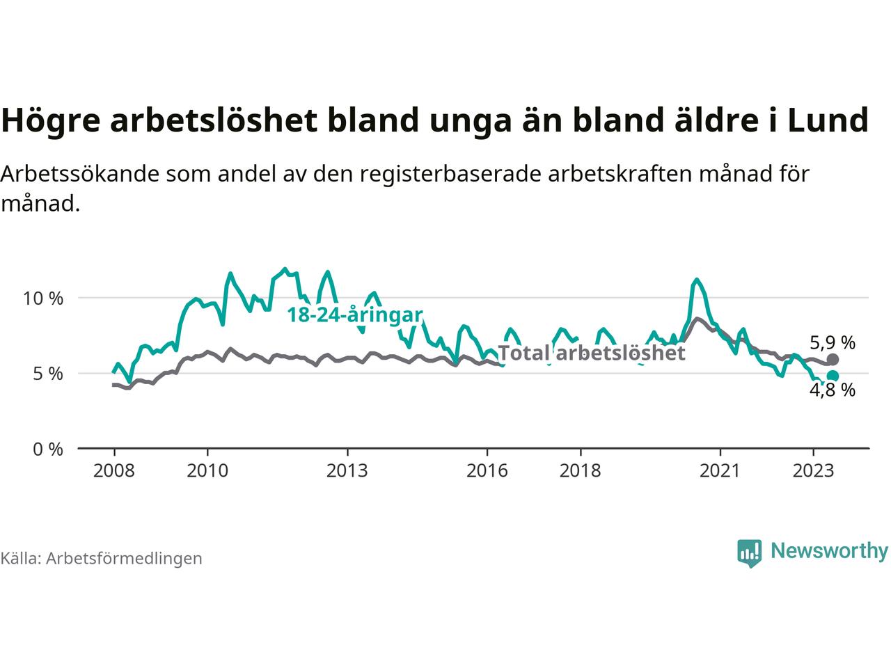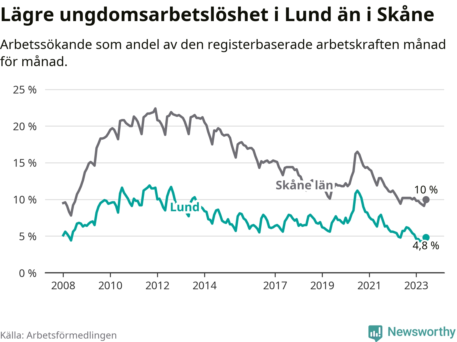 Precis som den totala arbetslösheten ligger ungdomsarbetslösheten i Lund lägre än i Skåne som helhet. Skillnaden mellan kommunen och länet är 5,2 procentenheter.