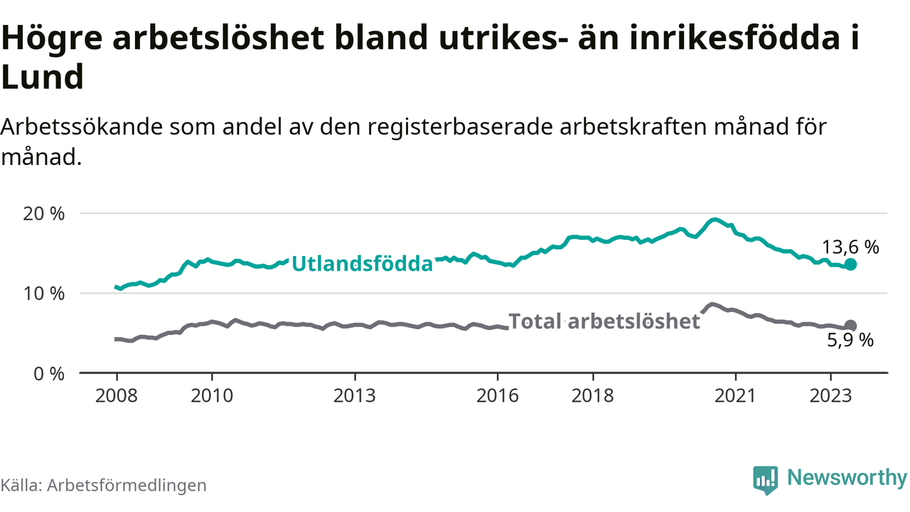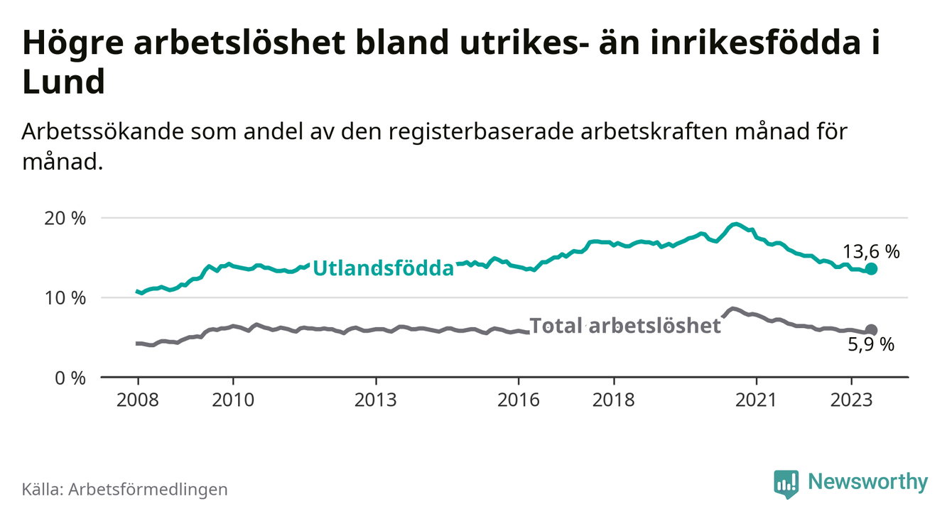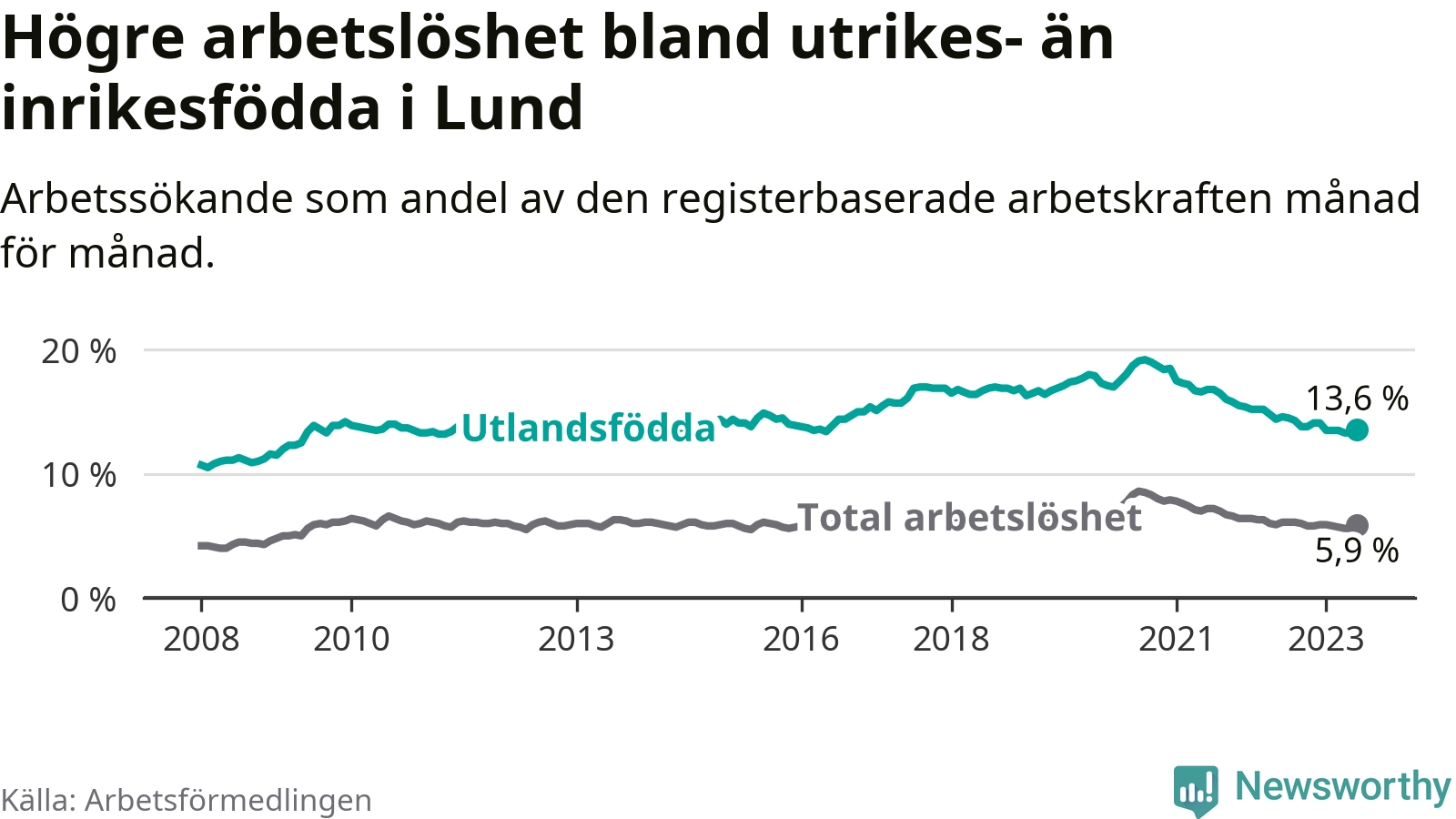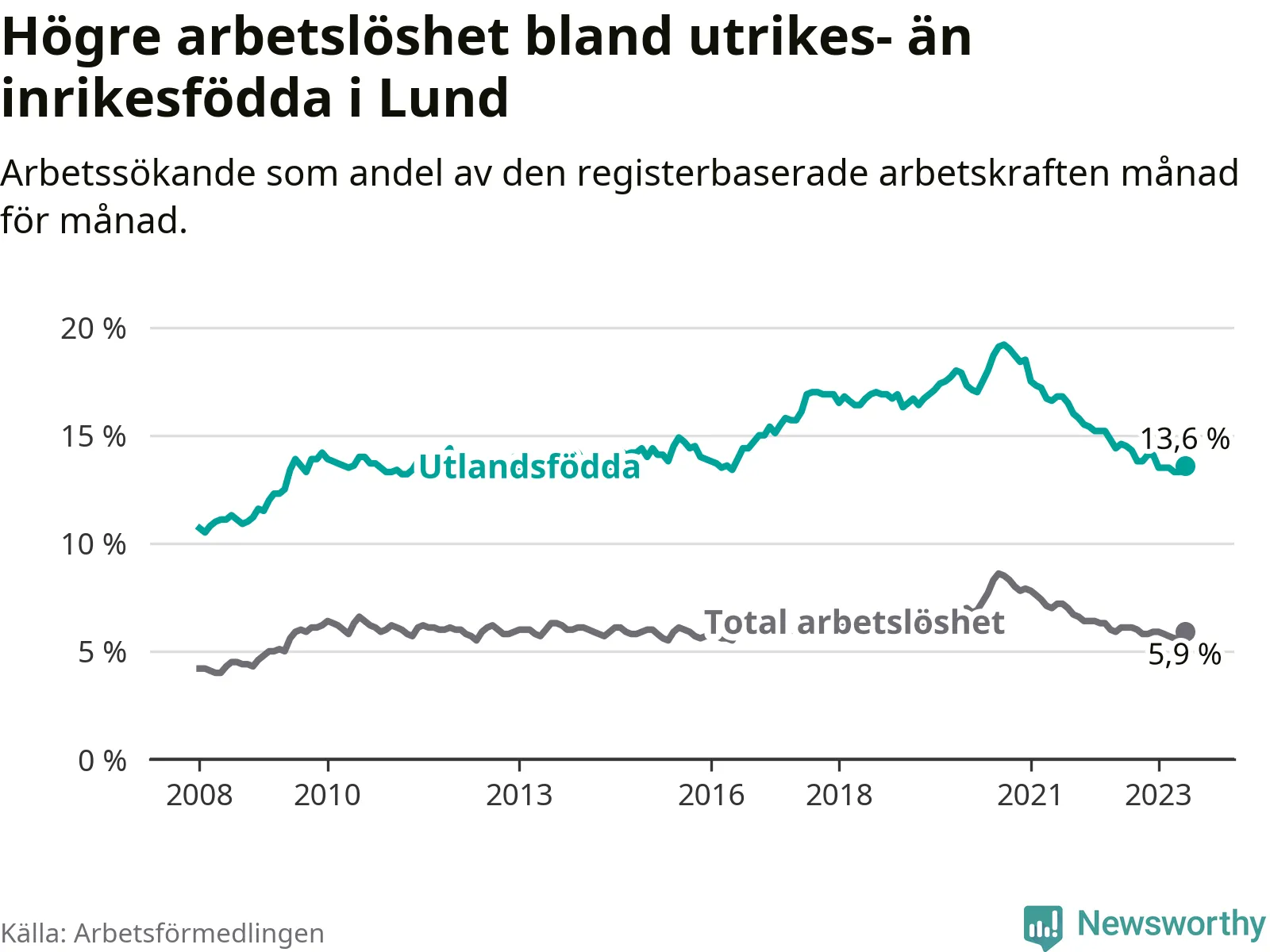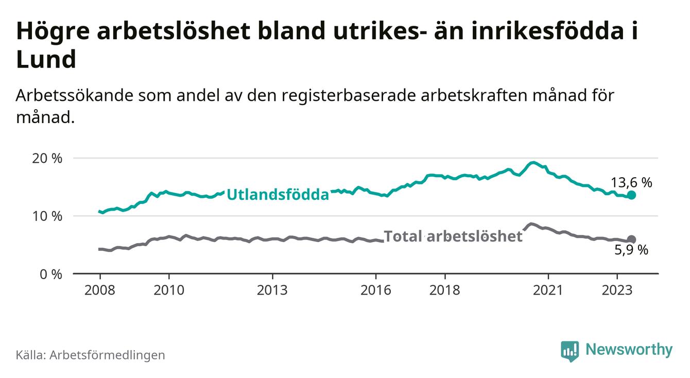 Skillnaden i arbetslöshet mellan utrikesfödda och hela befolkningen är 7,7 procentenheter i Lund. Det är en mindre skillnad än för ett år sedan (−0,8 procentenheter).