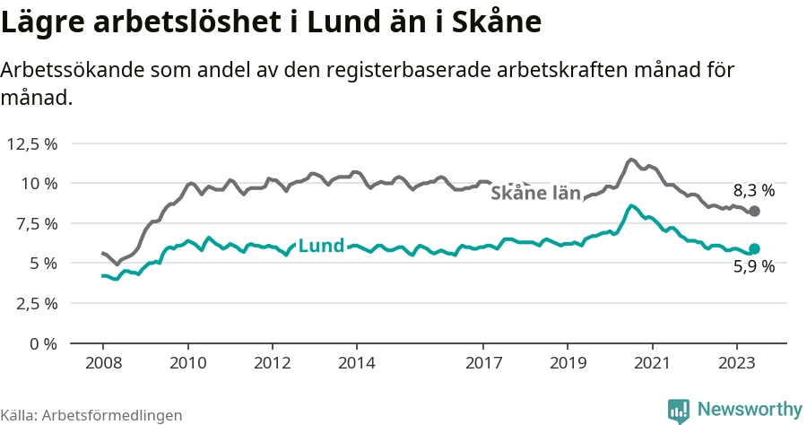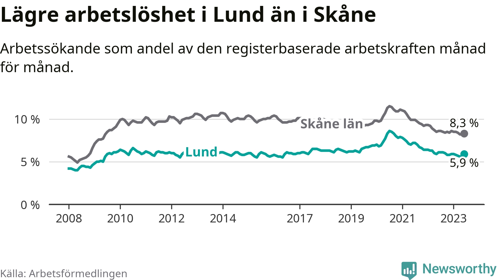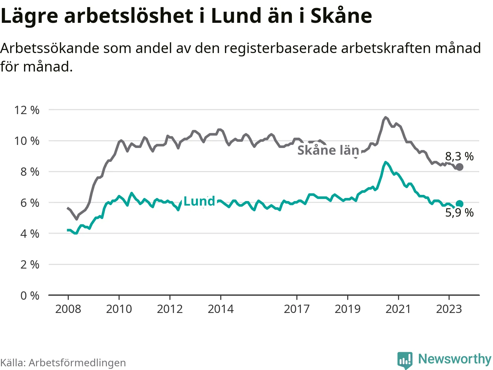 Under juni månad rapporterade Lunds kommun en total arbetslöshet på 5,9 procent. Det är en minskning jämfört med samma tidpunkt i fjol (−0,2 procentenheter). Även i Skåne län sjunker arbetslösheten .