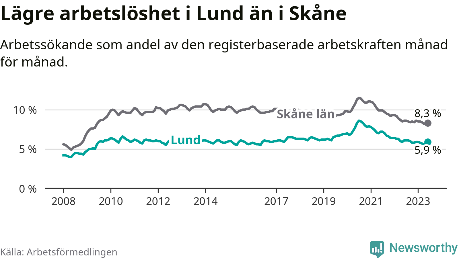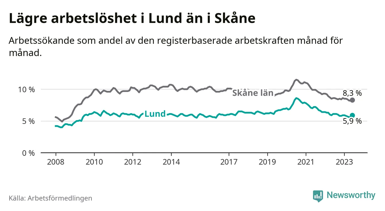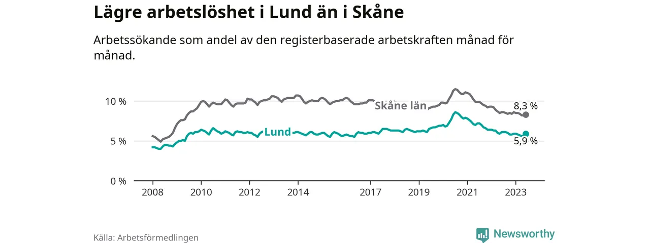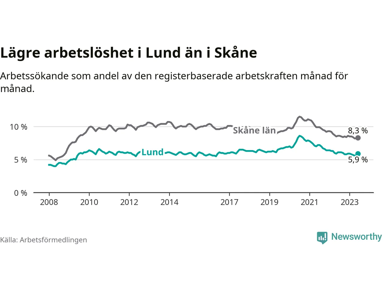 Det är 27:e månaden i följd som arbetslösheten i Lund är lägre än den var under samma tidpunkt året innan. Sedan mars 2021 har arbetslösheten gått ner från 7,4 till 5,9 procent.