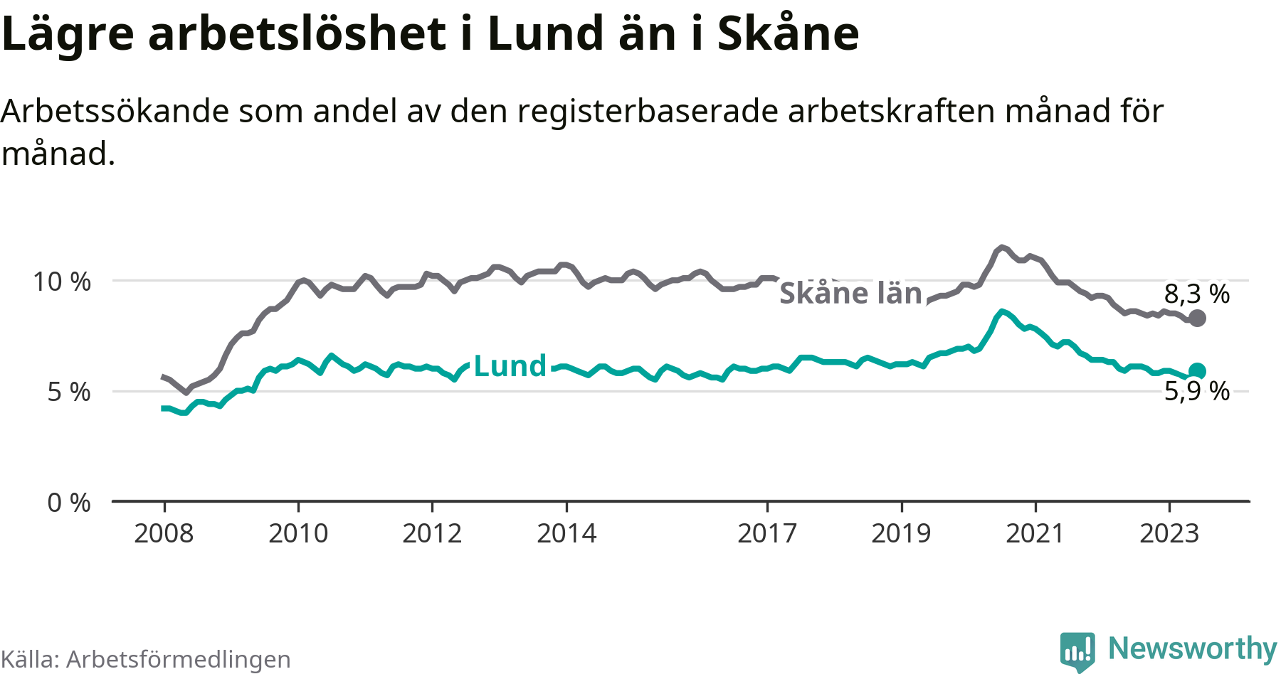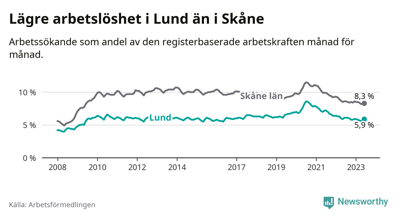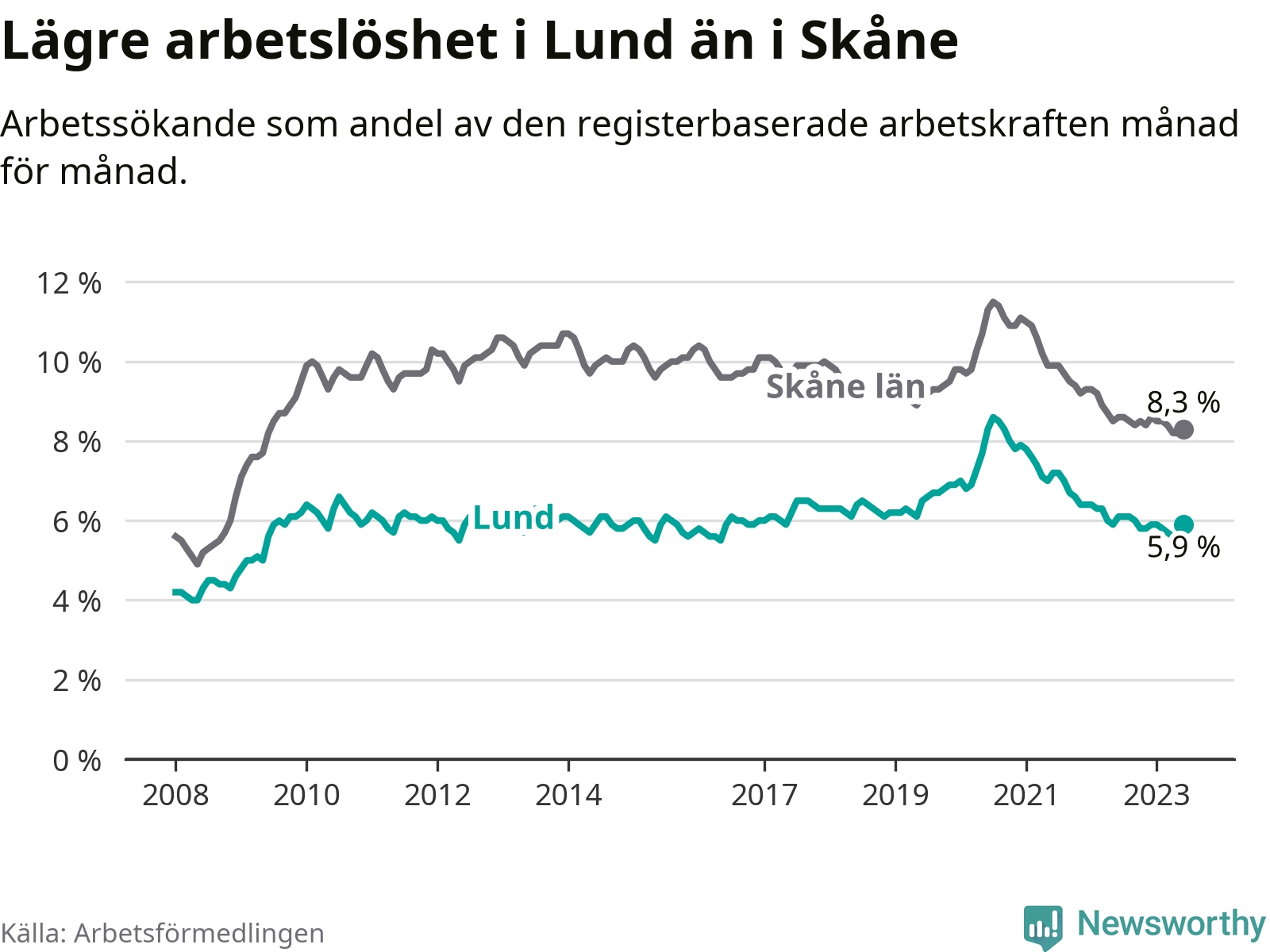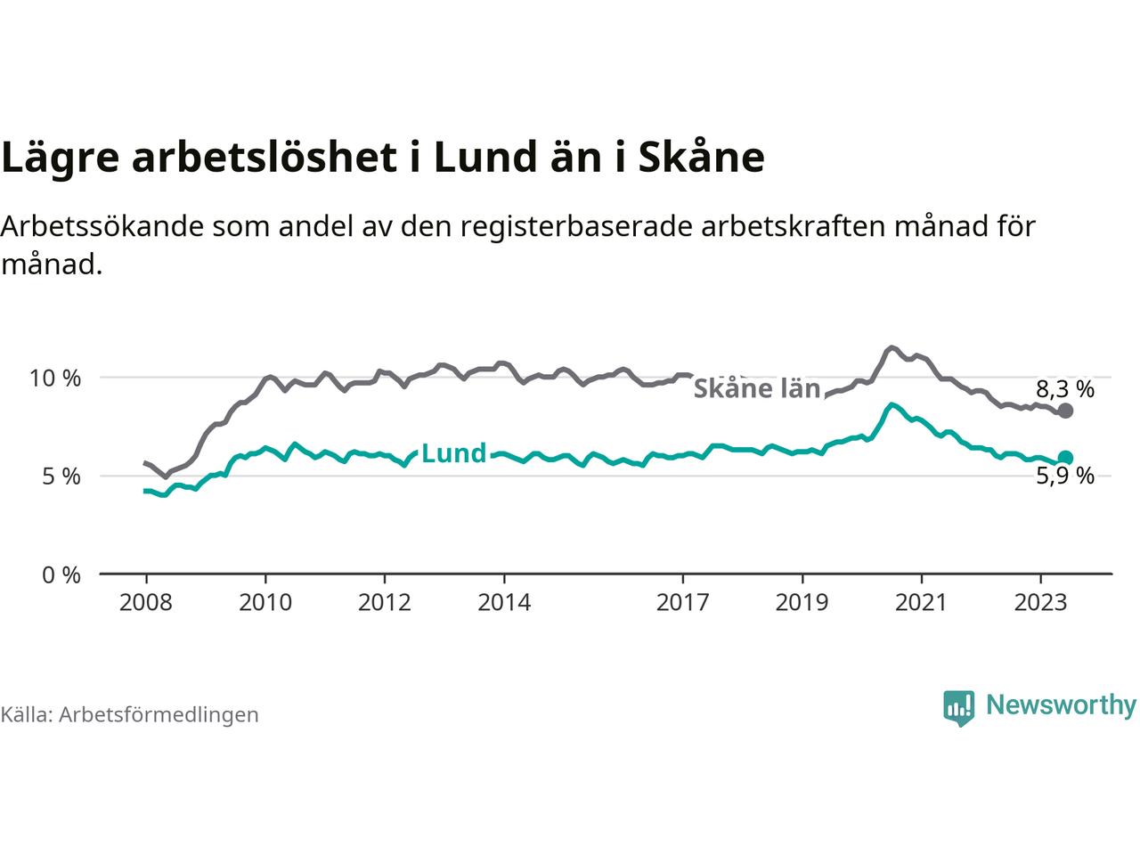 Lund hade redan tidigare lägre arbetslöshet än snittet i hela Skåne län och nu växer klyftan (5,9 procent i kommunen, jämfört med 8,3 procent i hela länet). Vellinge har den lägsta arbetslösheten i länet (3,2 procent), medan Perstorp har den högsta (12,3 procent). För att Lund skulle komma ner i samma arbetslöshetsnivå som Vellinge skulle 1 571 personer behöva sysselsättas.