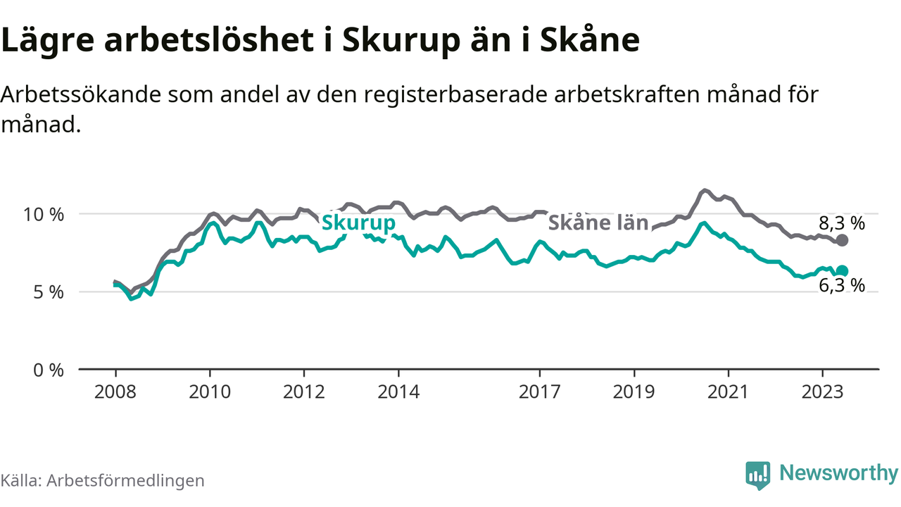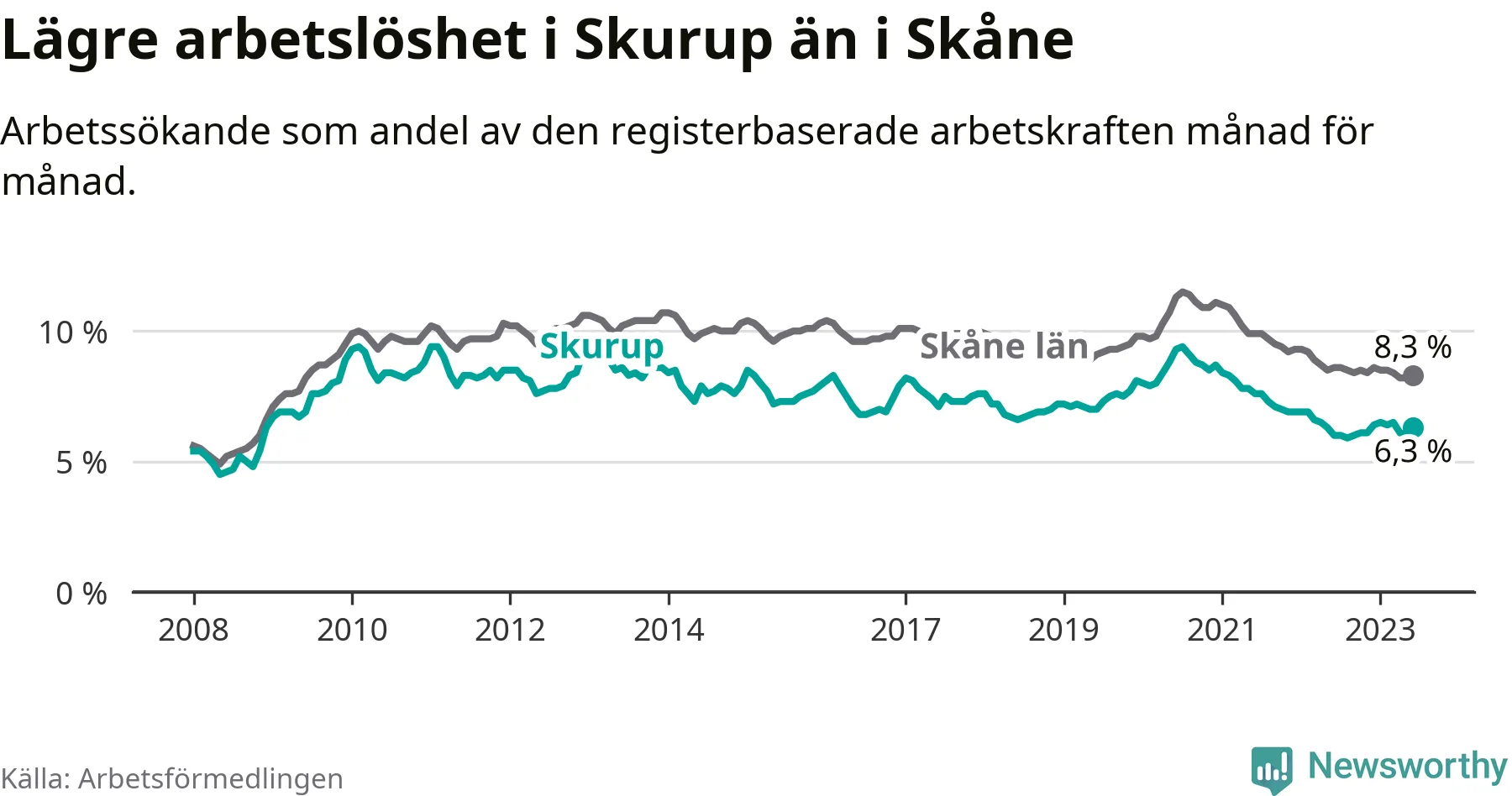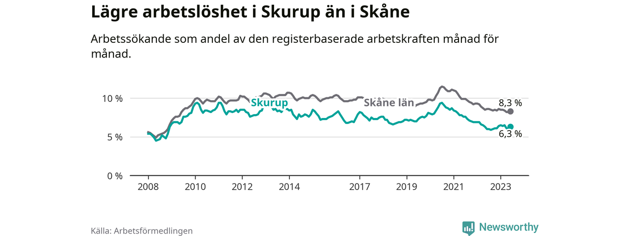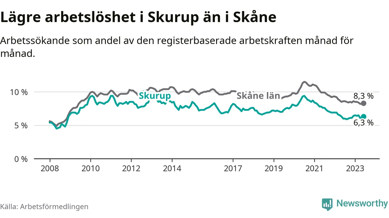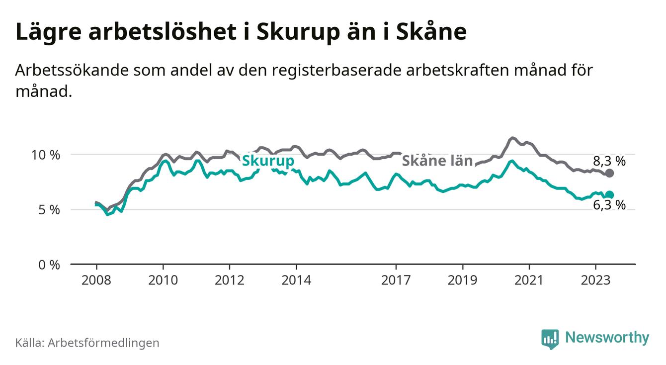 Sedan mars 2021 har arbetslösheten i Skurups kommun minskat, men i juni vände utvecklingen då andelen arbetslösa steg jämfört med året innan.