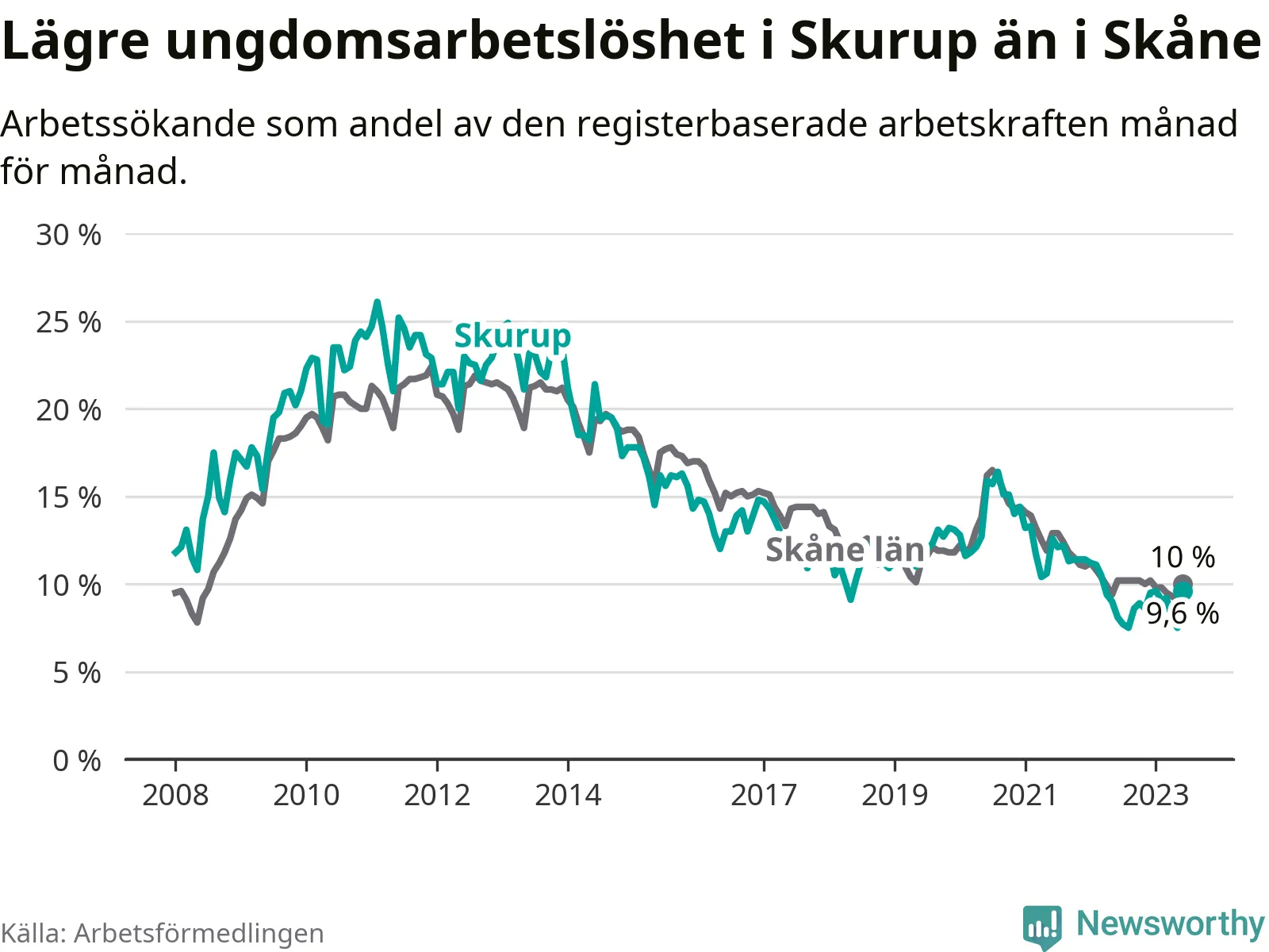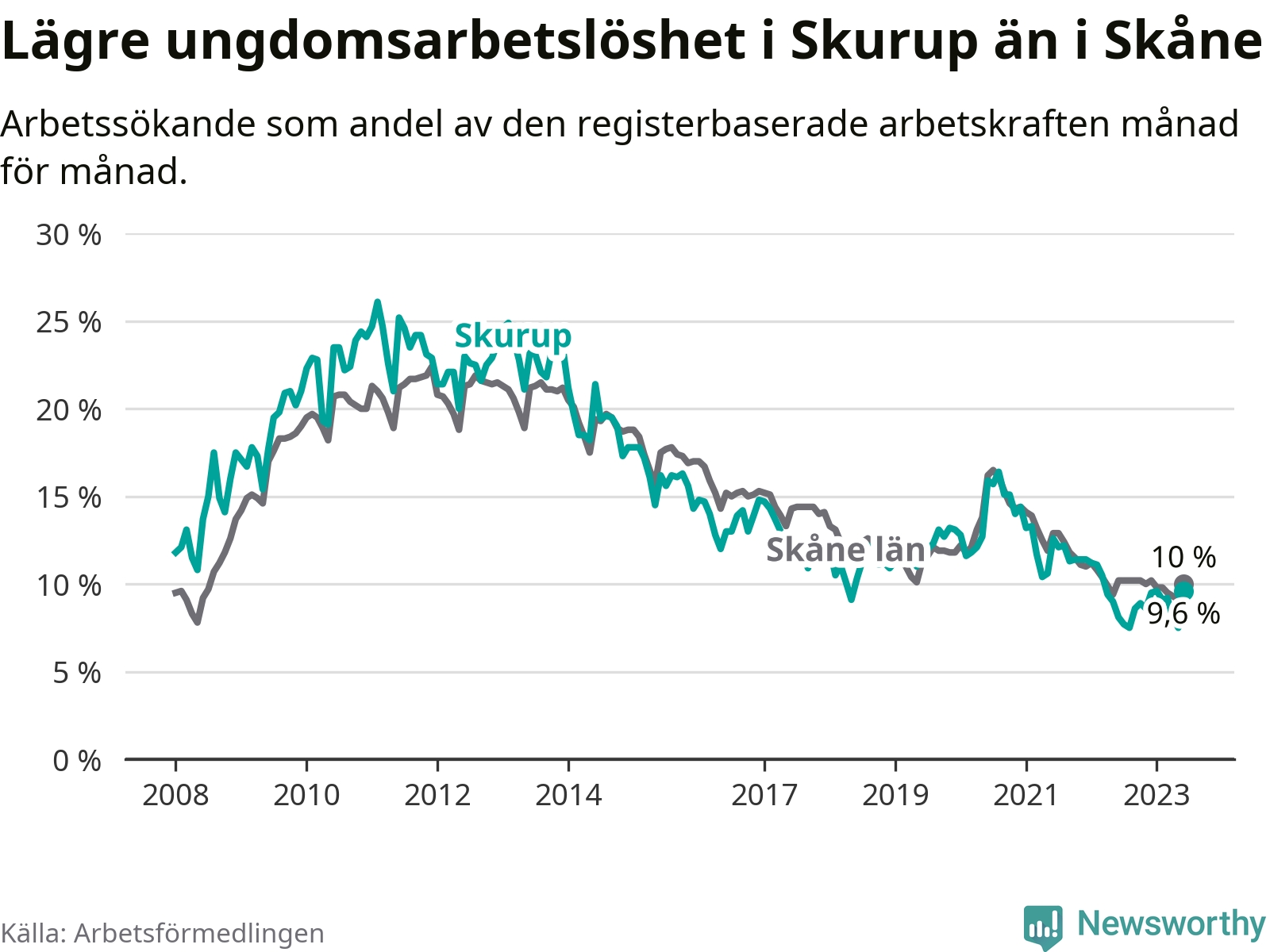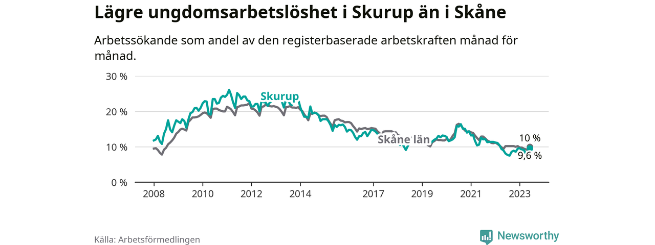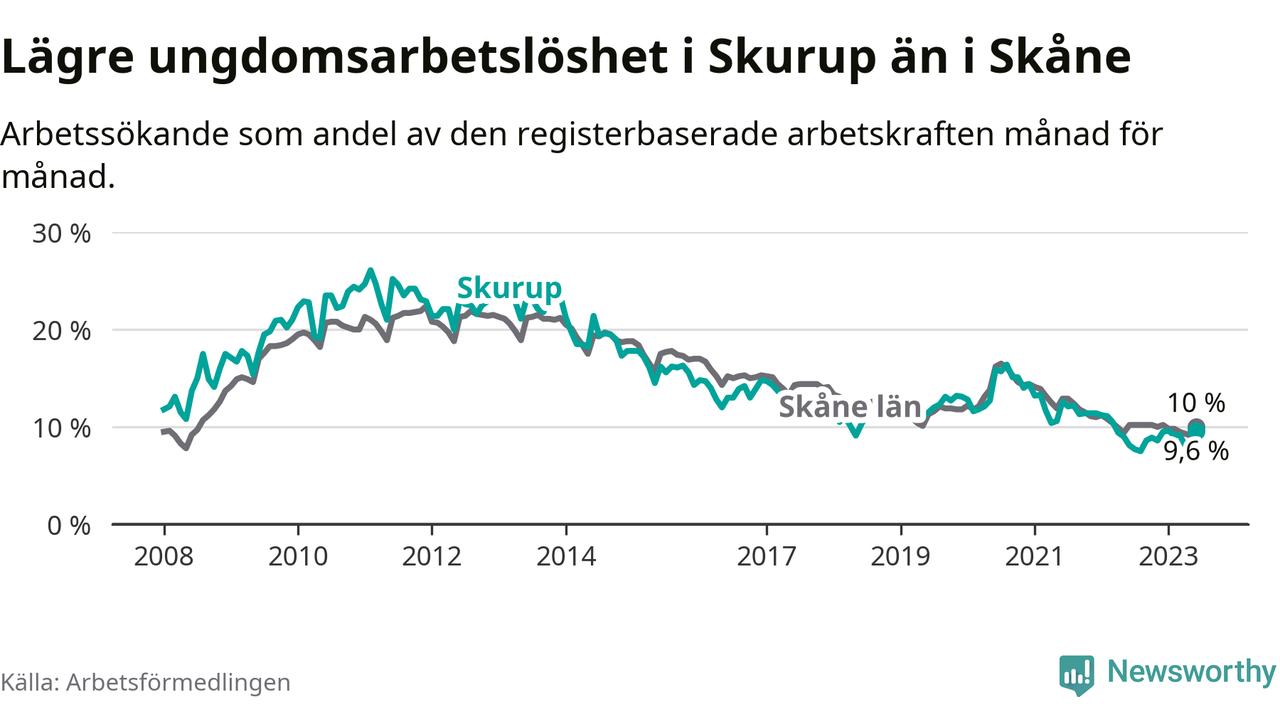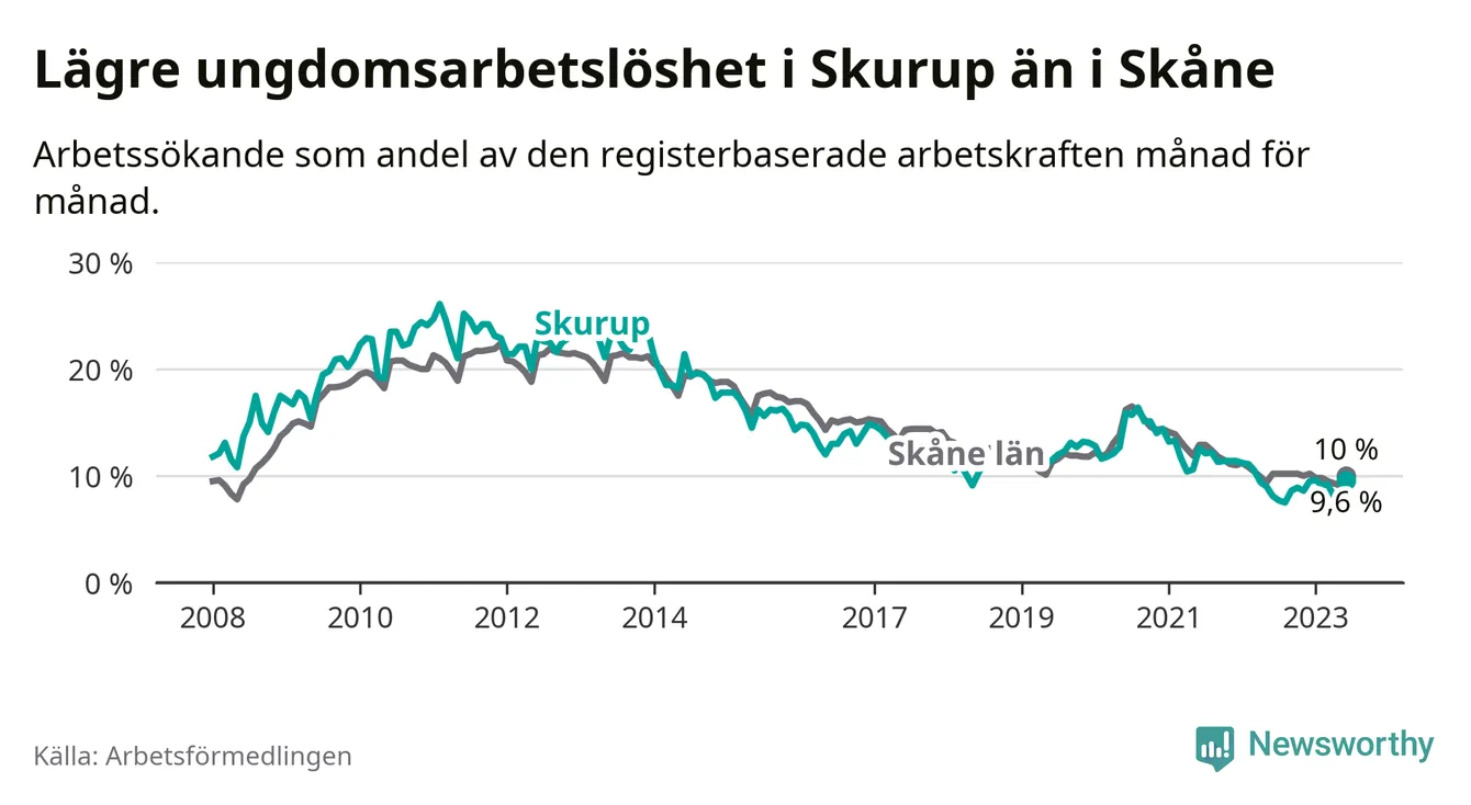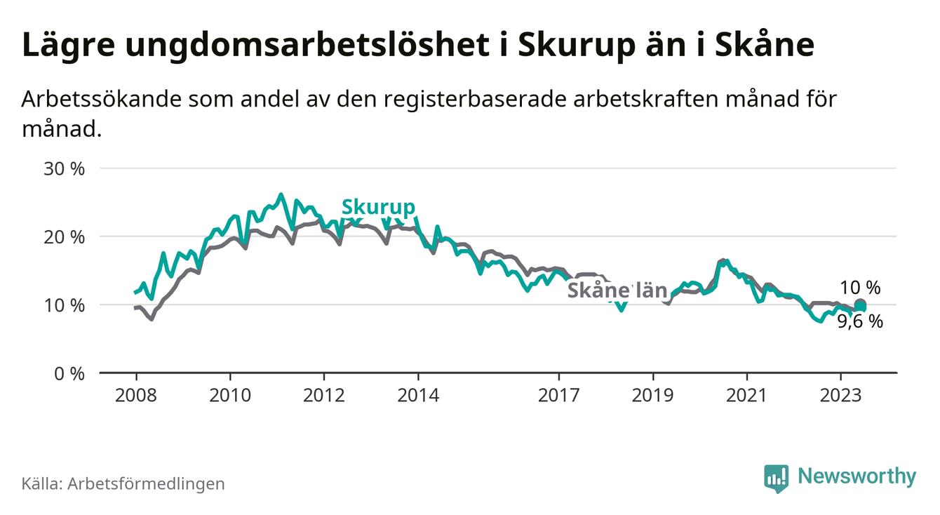 Precis som den totala arbetslösheten ligger ungdomsarbetslösheten i Skurup lägre än i Skåne som helhet. Skillnaden mellan kommunen och länet är 0,4 procentenheter.