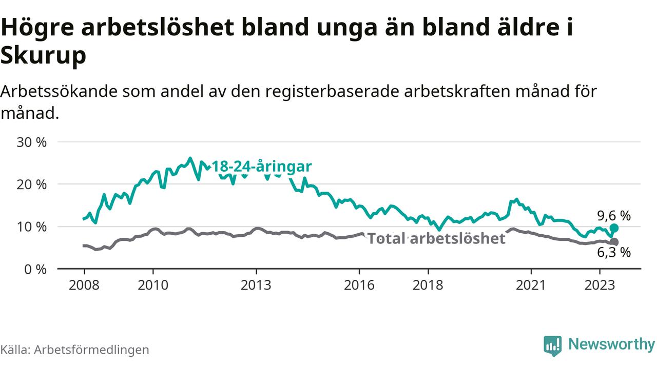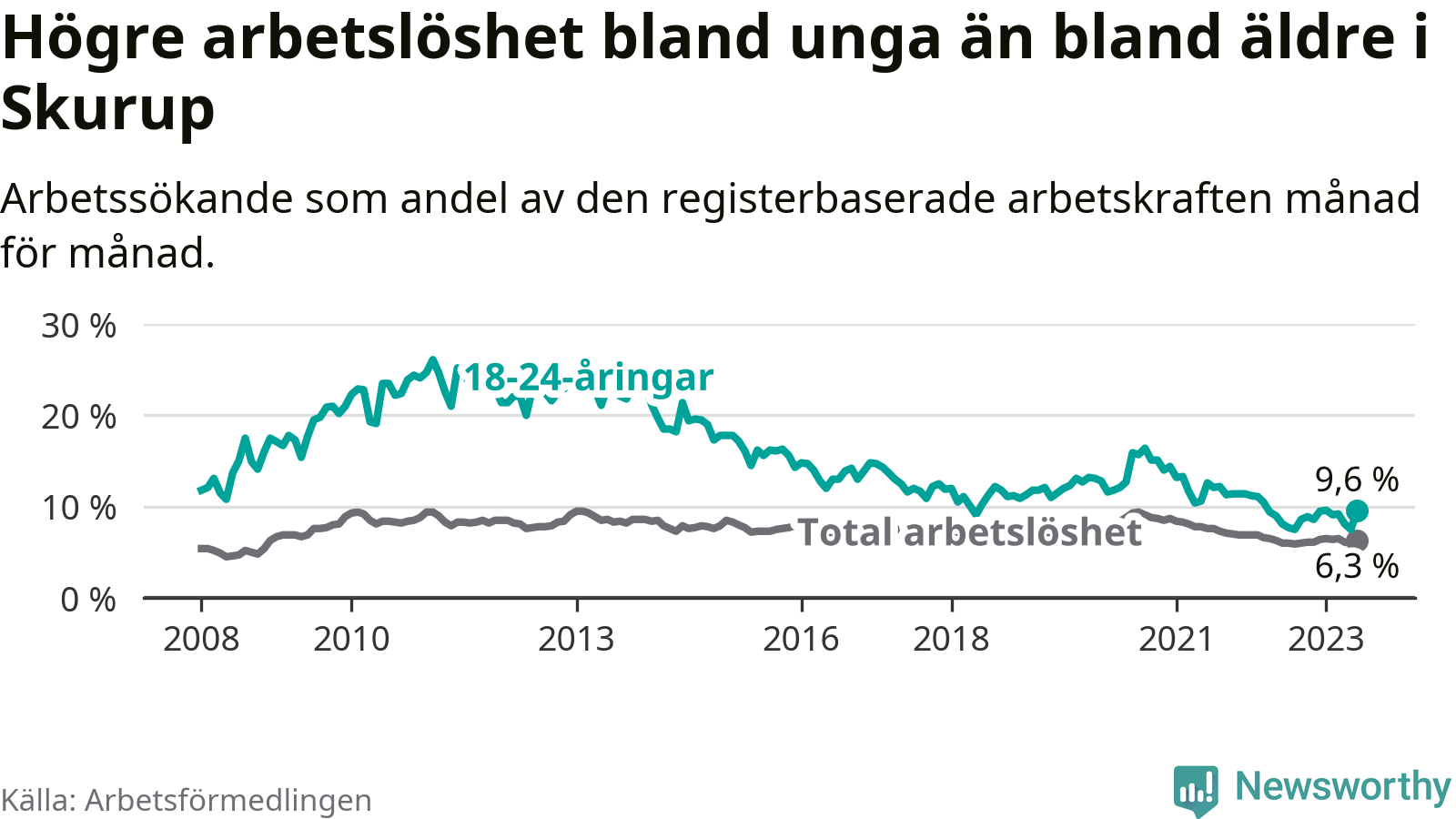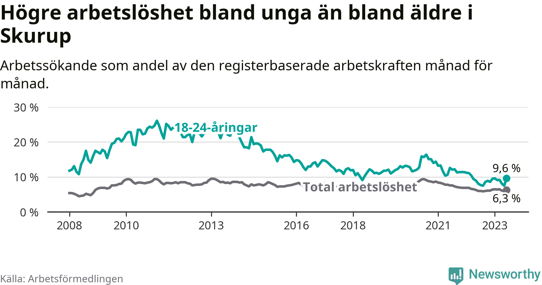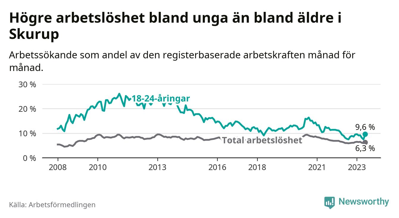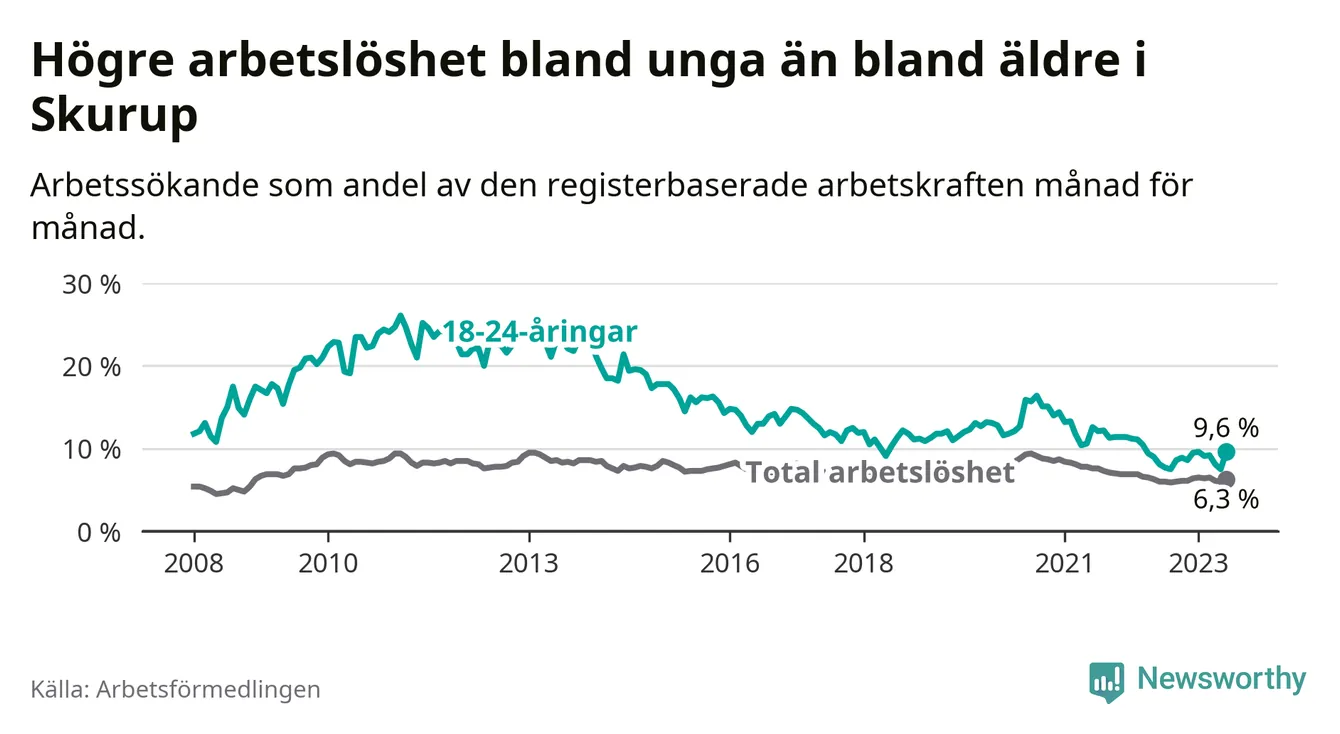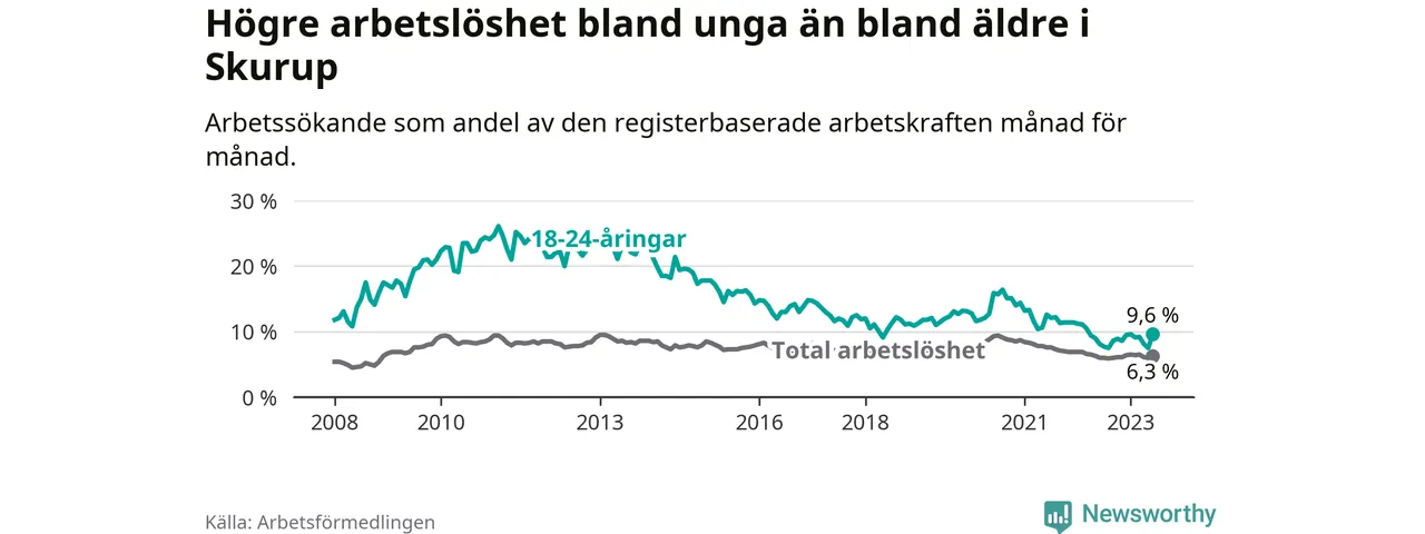 Precis som den totala arbetslösheten ligger ungdomsarbetslösheten i Skurup lägre än i Skåne som helhet. Skillnaden mellan kommunen och länet är 0,4 procentenheter.