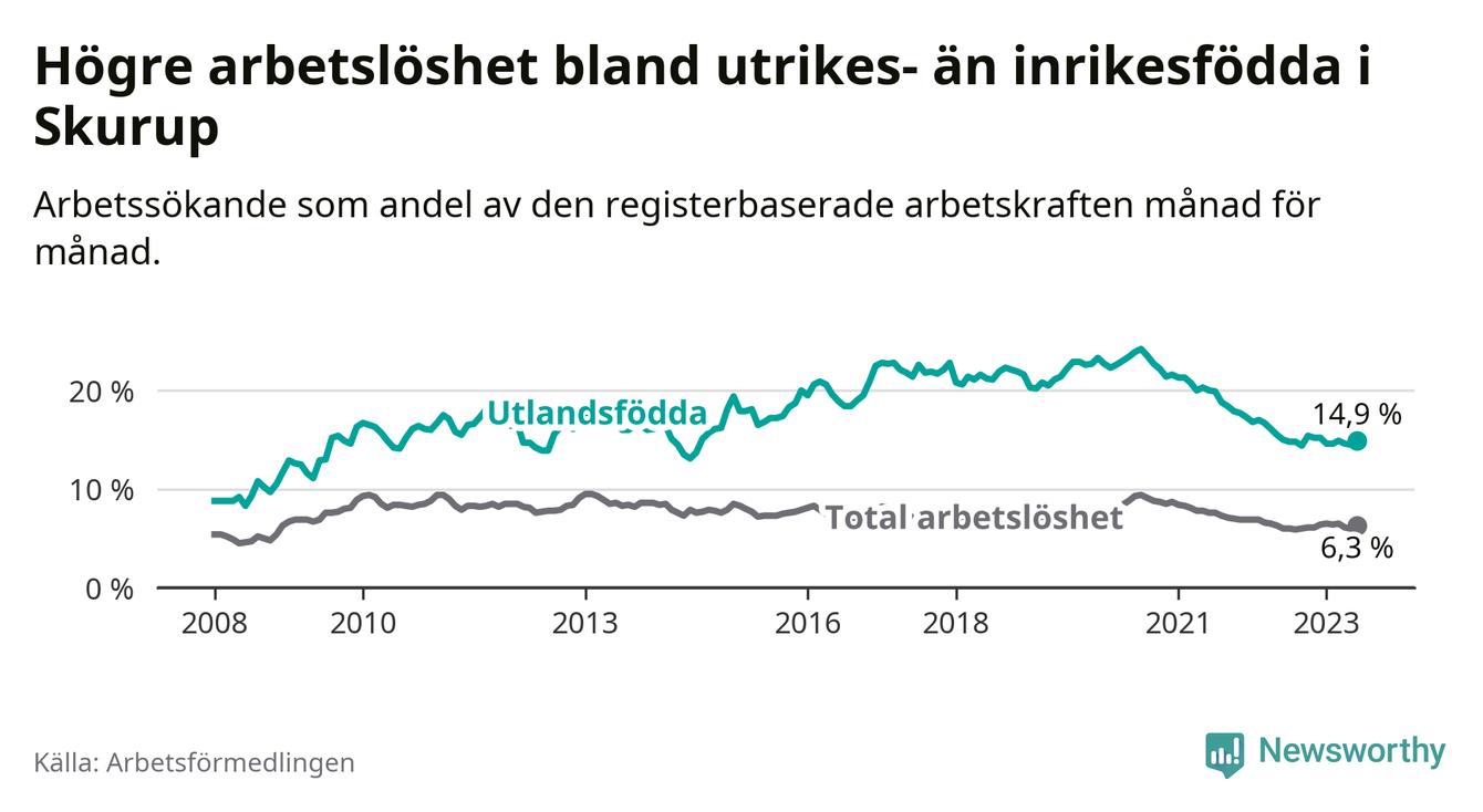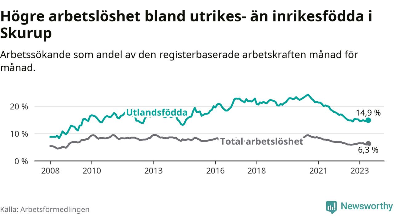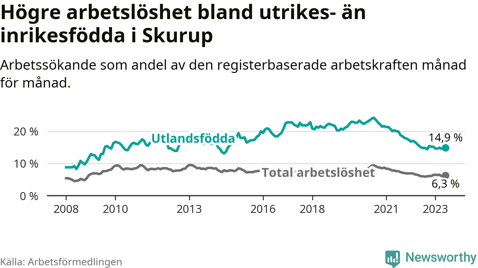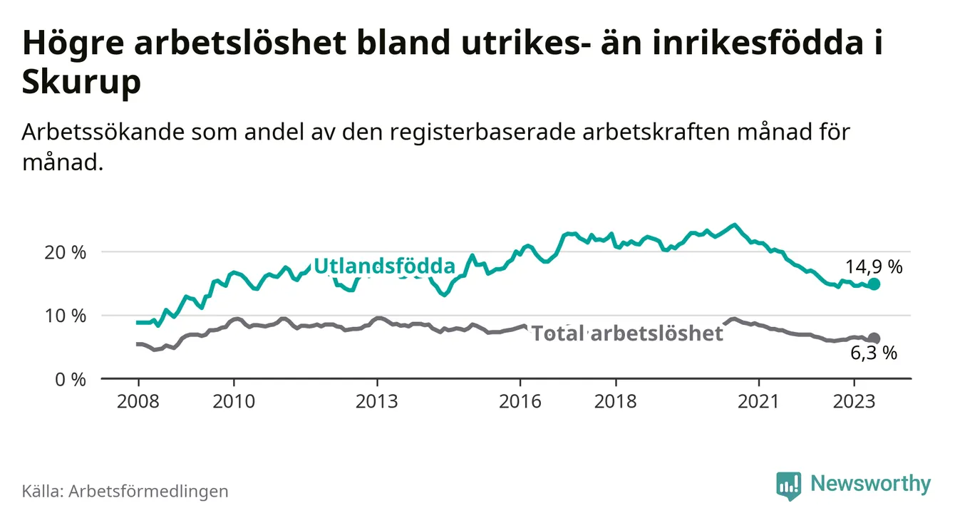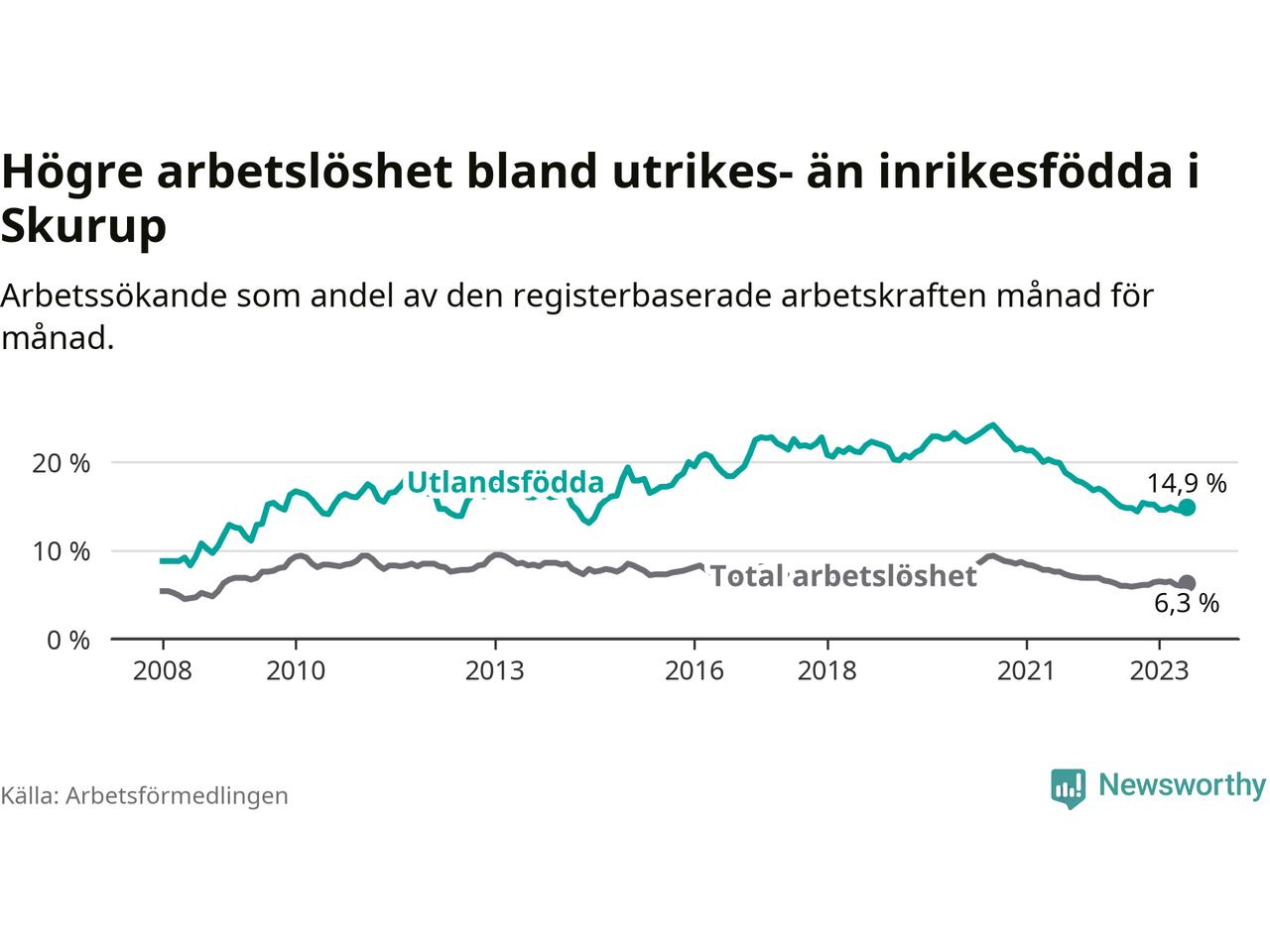 Skillnaden i arbetslöshet mellan utrikesfödda och hela befolkningen är 8,6 procentenheter i Skurup.