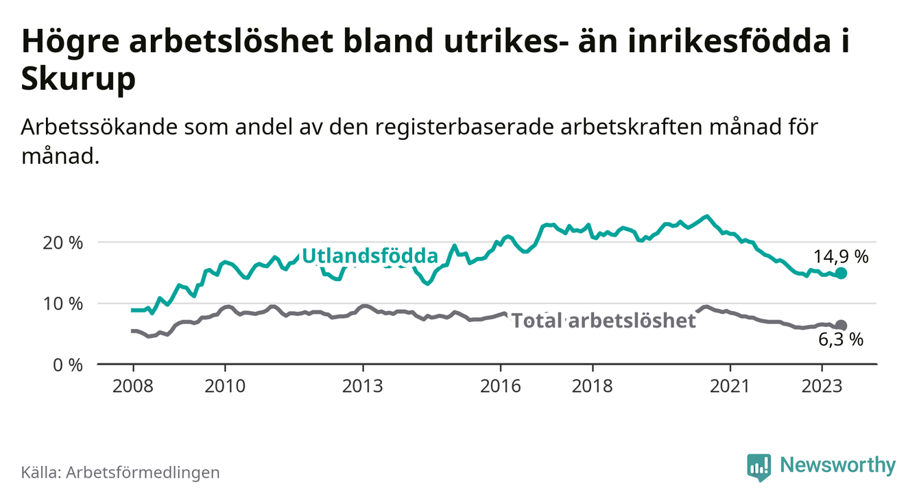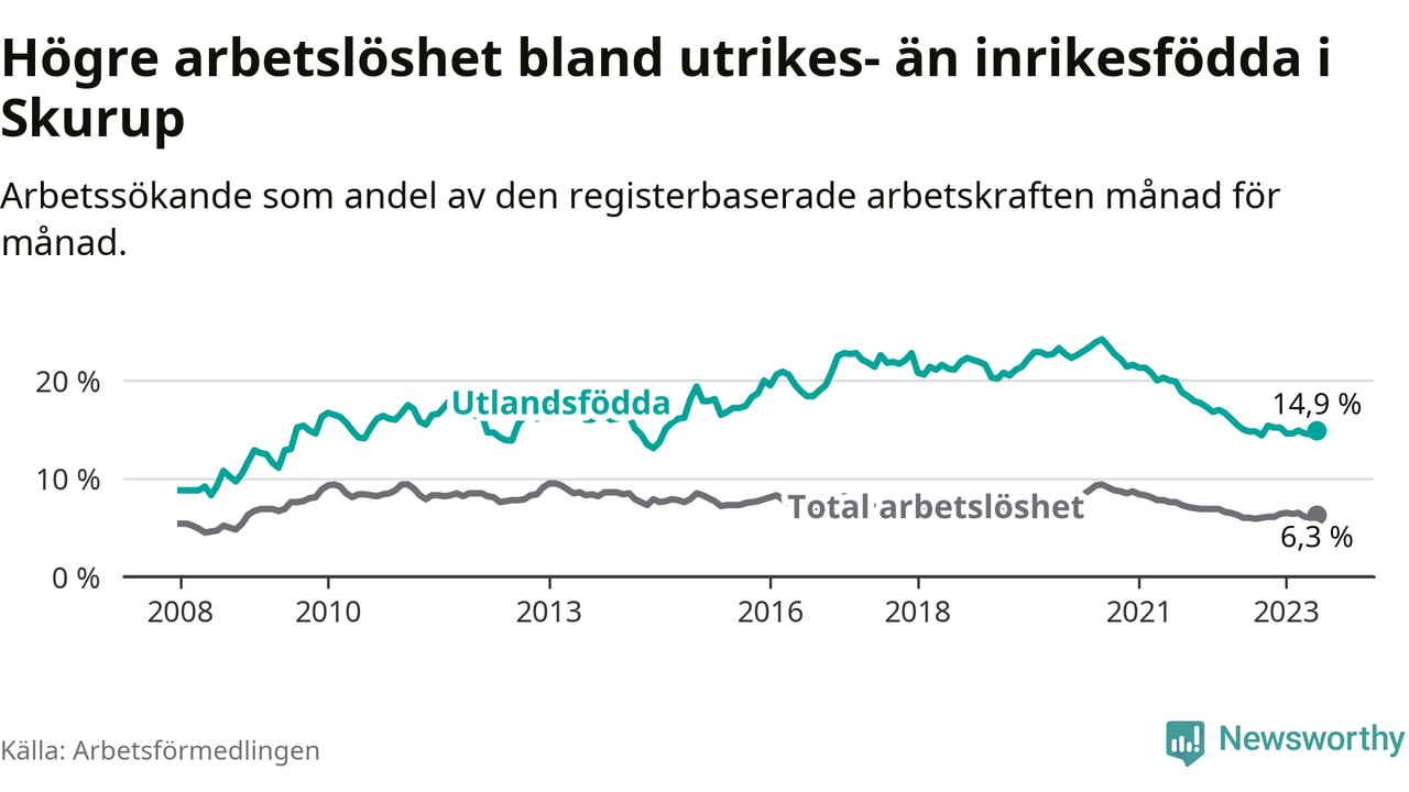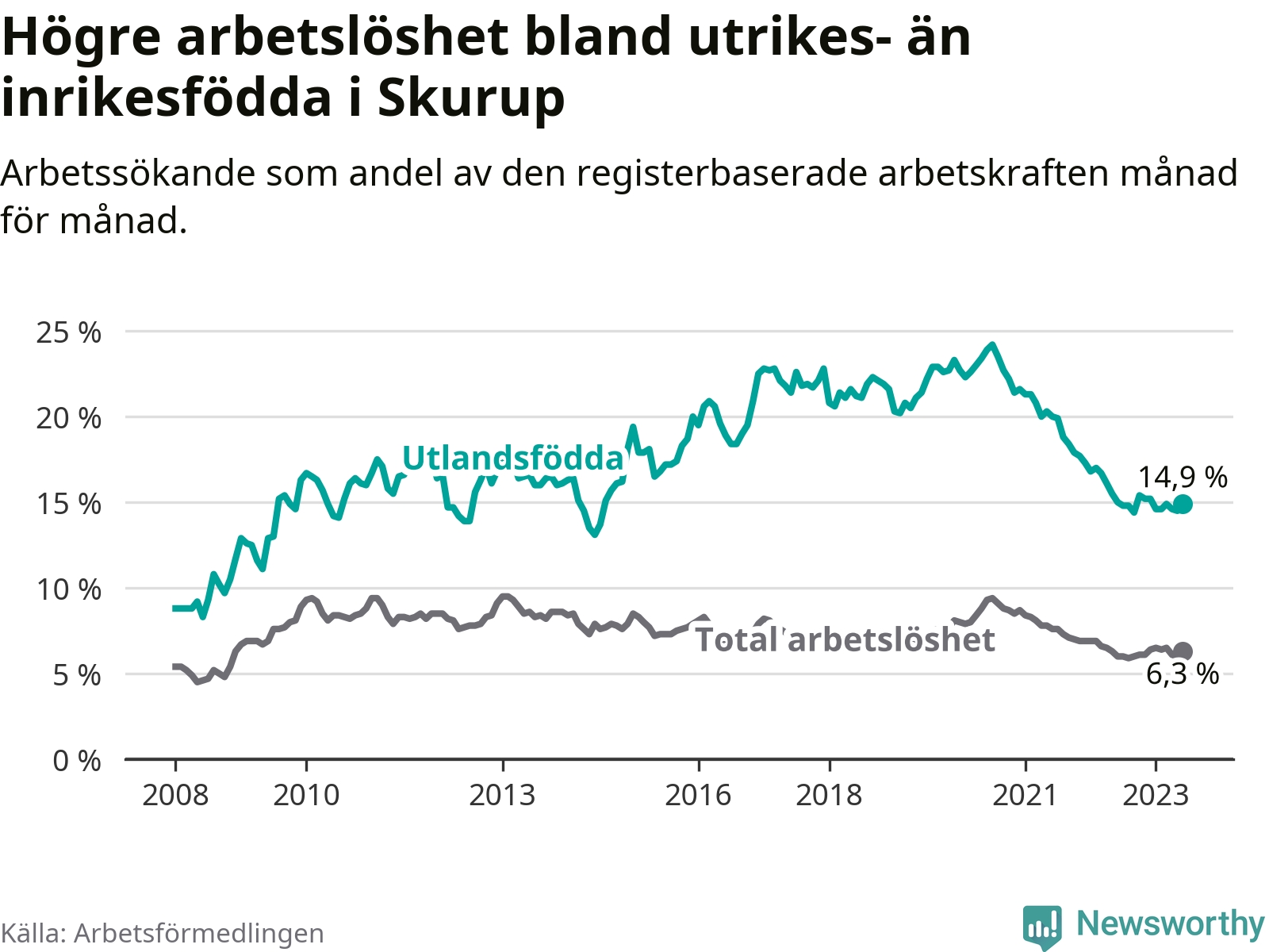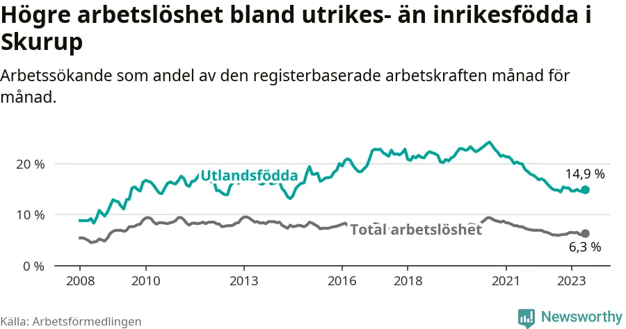 Arbetslösheten bland utlandsfödda var 14,9 procent i Skurup under juni månad, motsvarande 187 av 1 255 personer. Det är 0,1 procentenheter färre än vid samma tidpunkt i fjol (+18 om man räknar personer). Därmed har de utlandsföddas arbetslöshet varit lägre än vid samma tidpunkt i fjol i över två år i sträck. Sedan augusti 2020 har arbetslösheten bland utlandsfödda minskat från 23,5 till 14,9 procent.