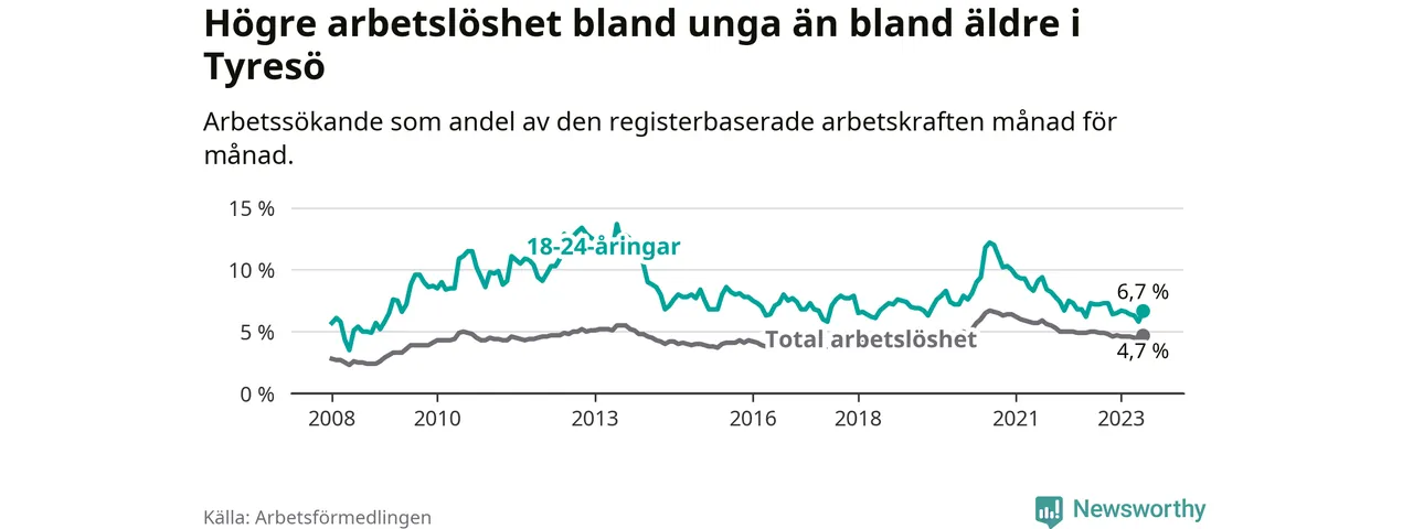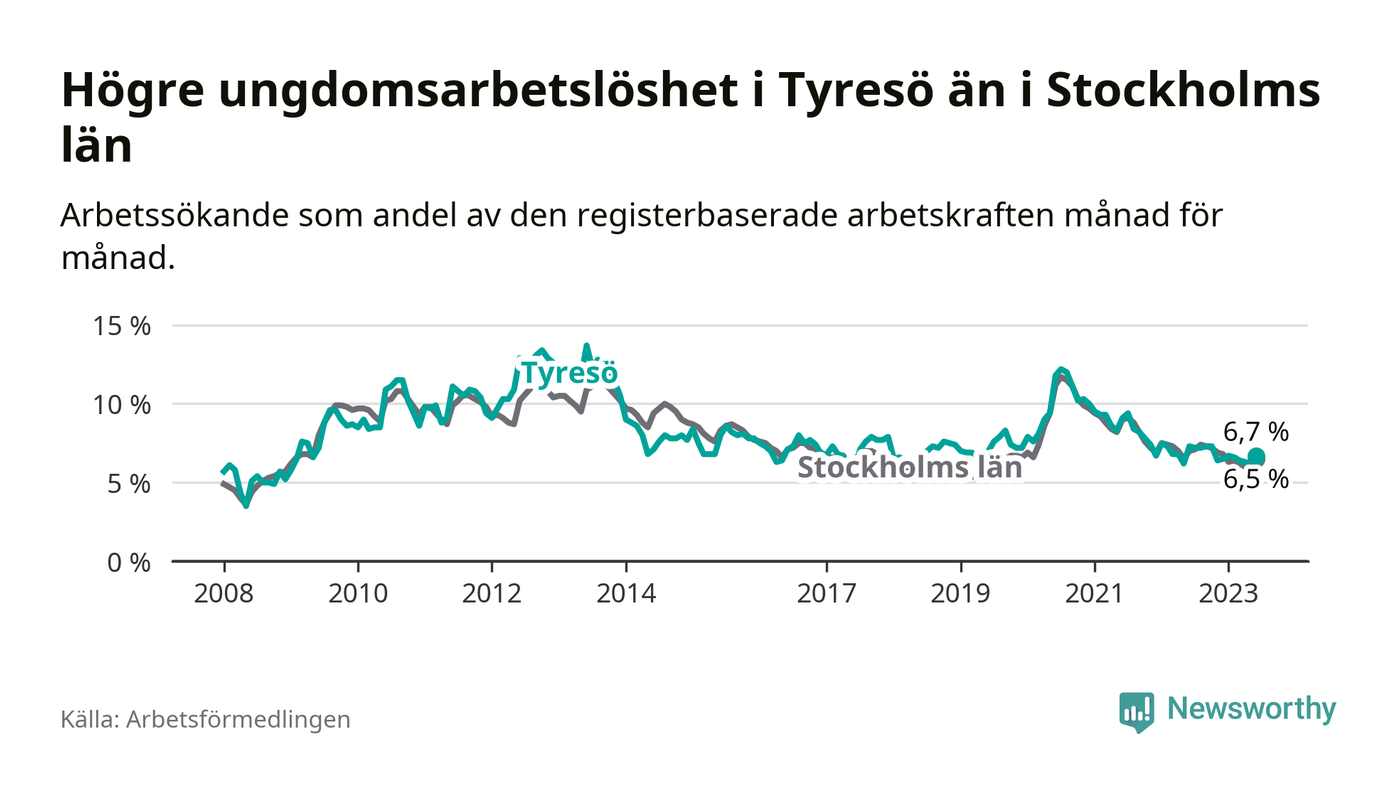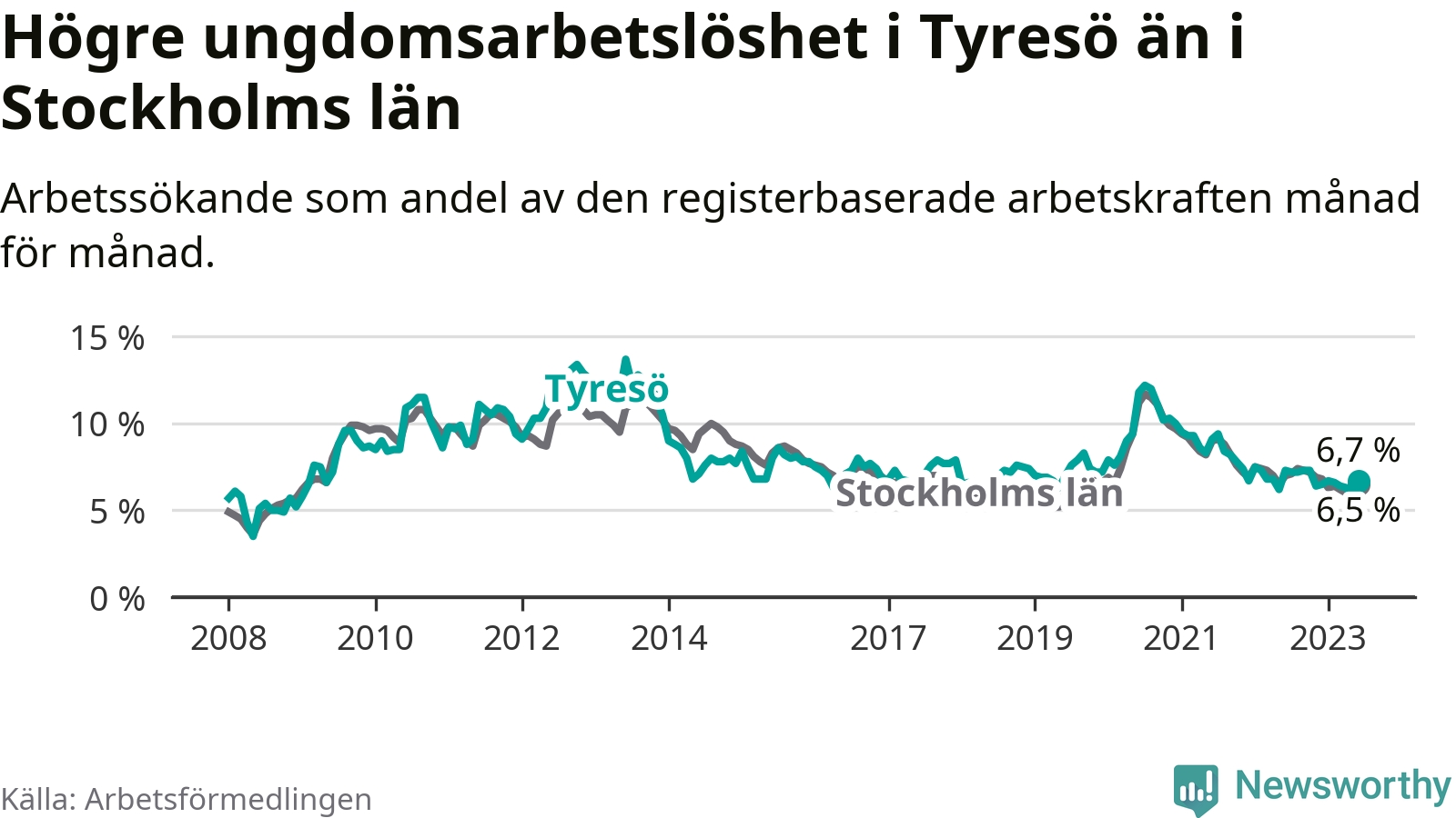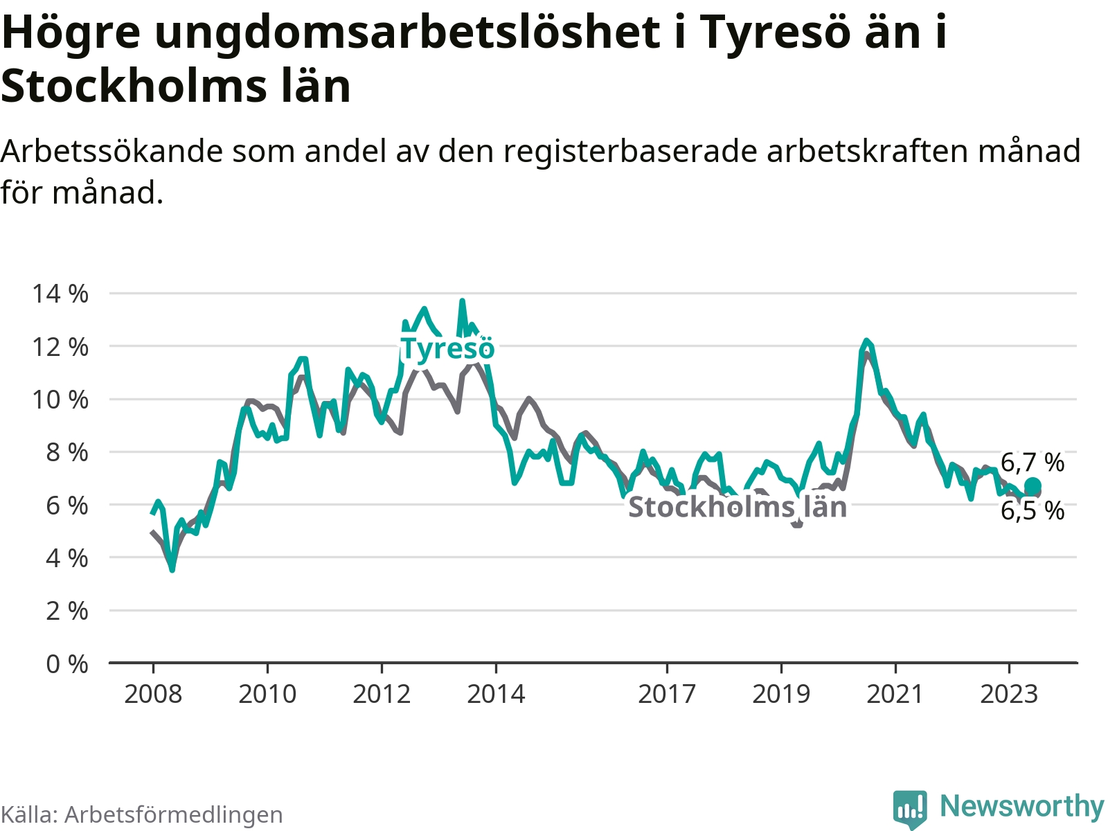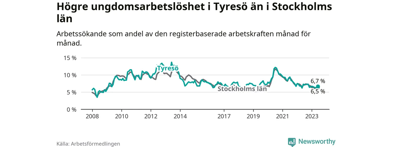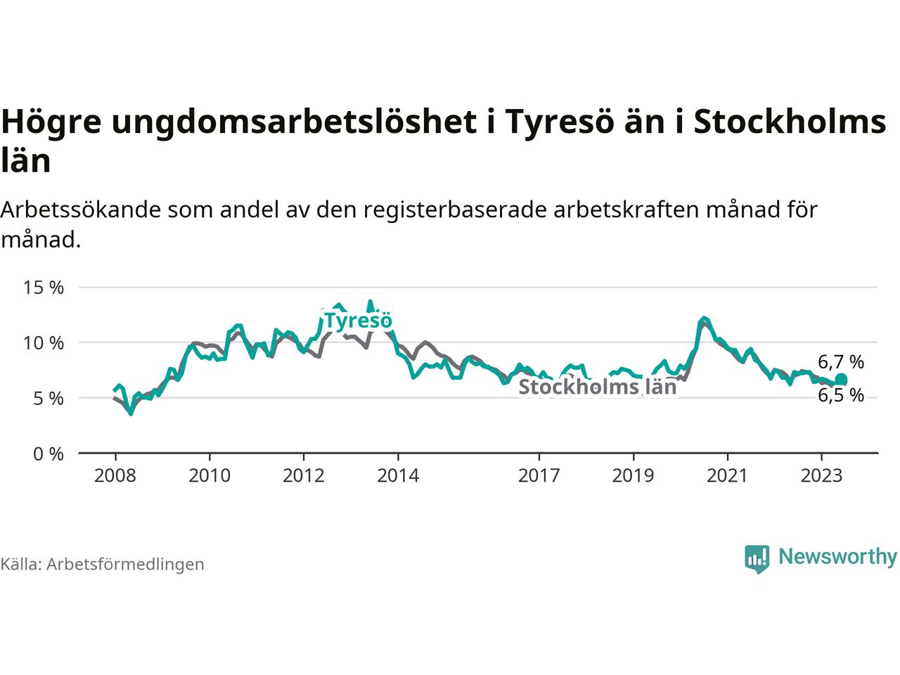 Medan Tyresö har lägre total arbetslöshet än Stockholms län, ligger ungdomsarbetslösheten 0,2 procentenheter högre i Tyresö.