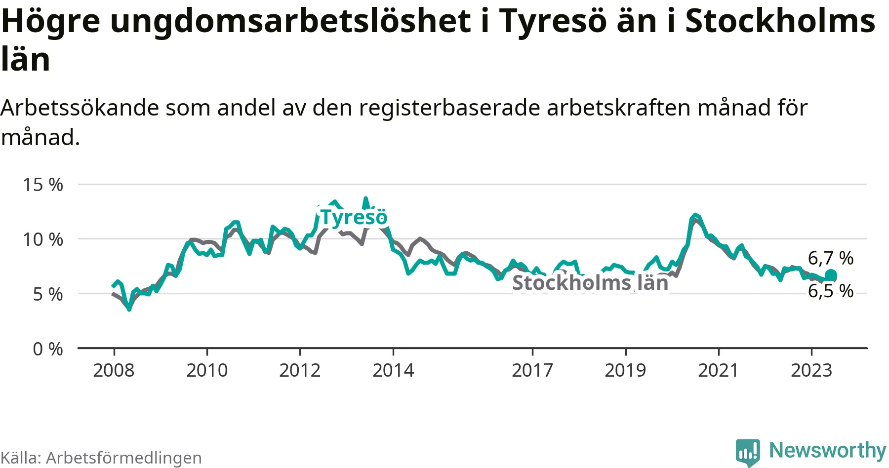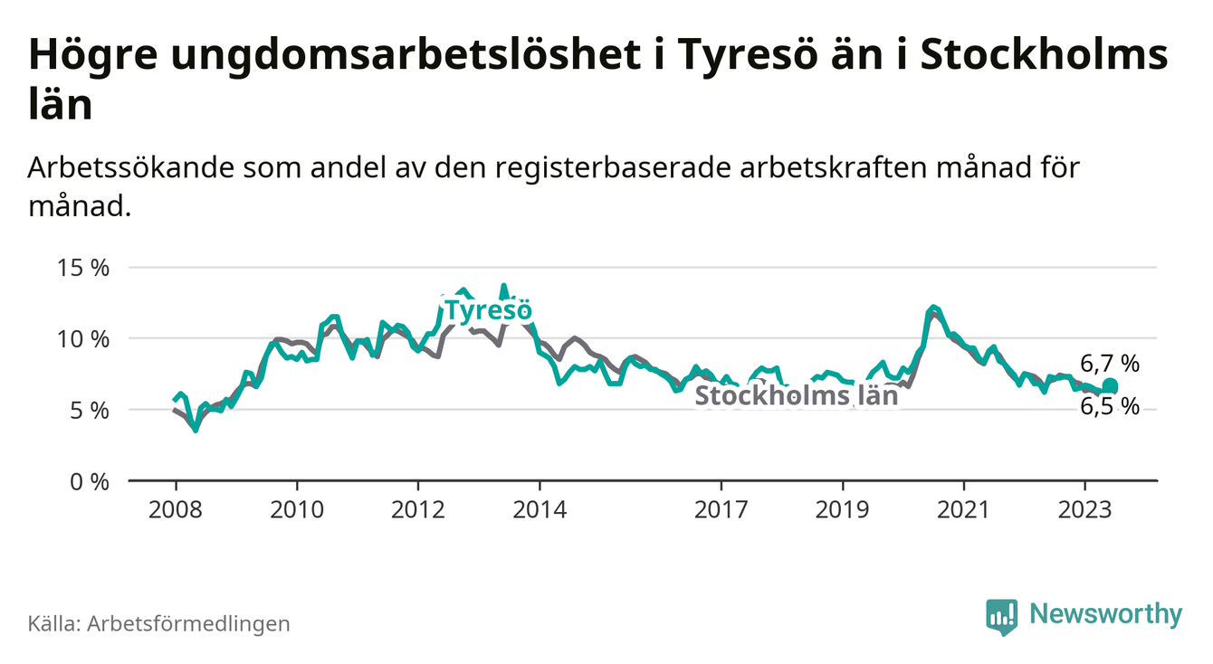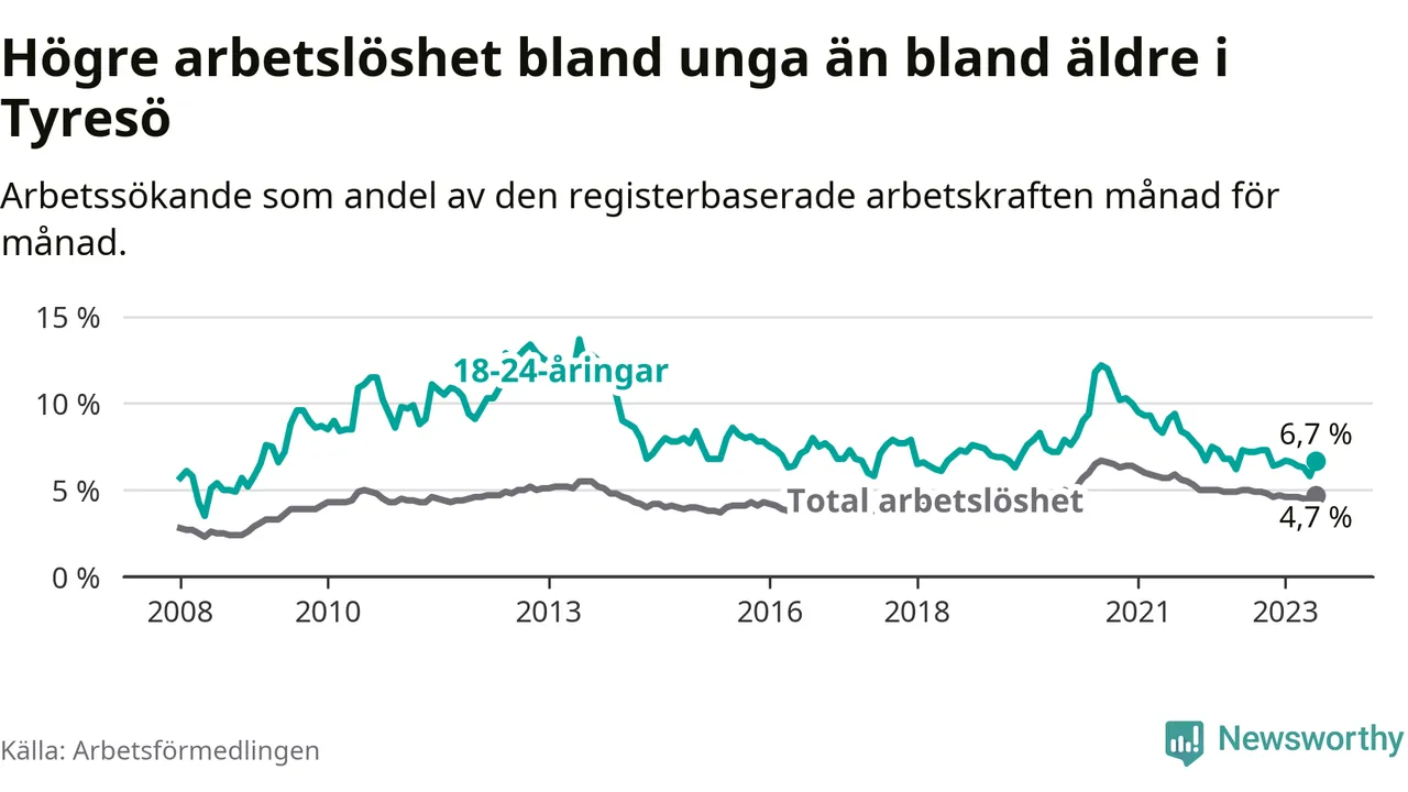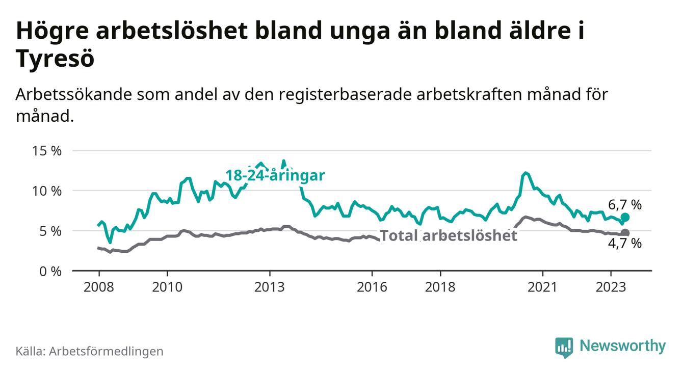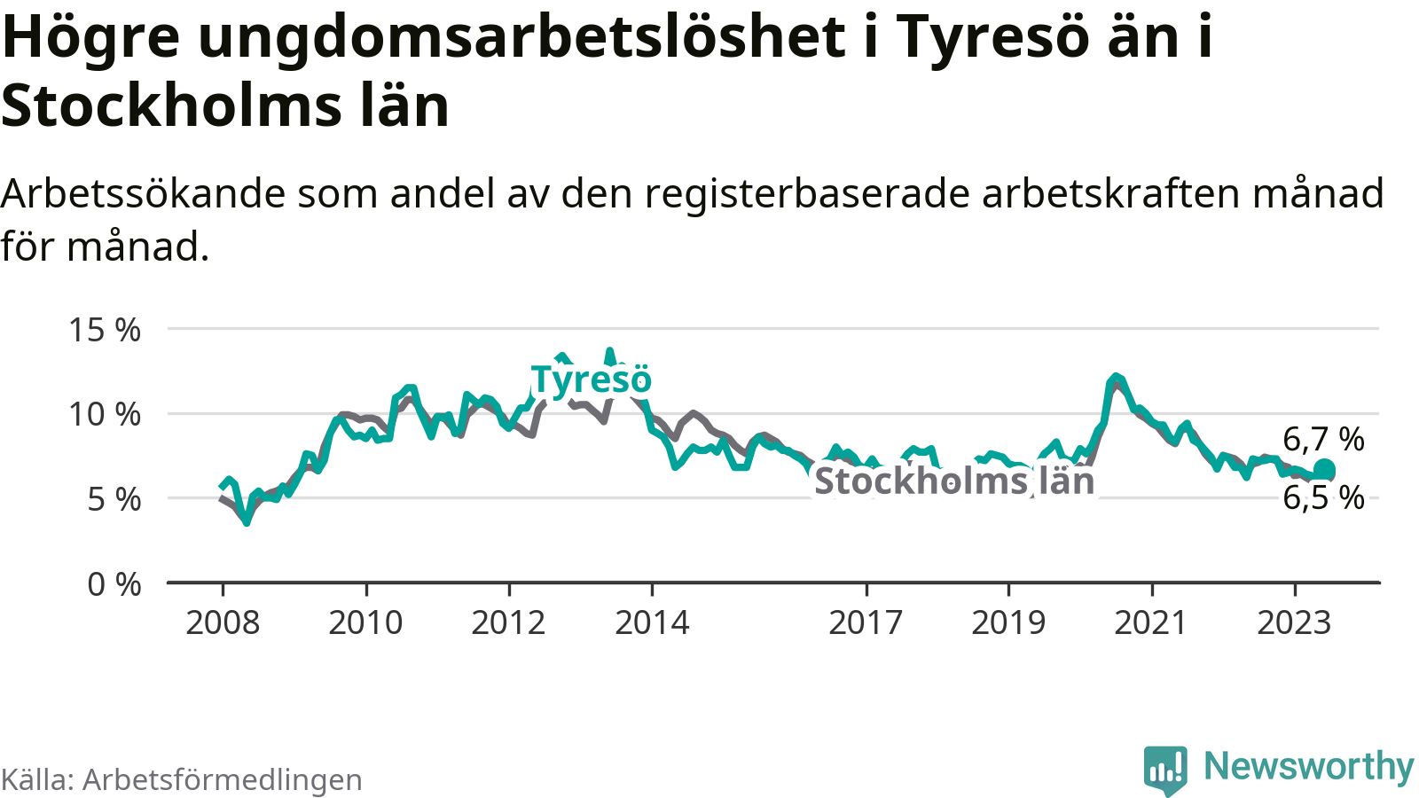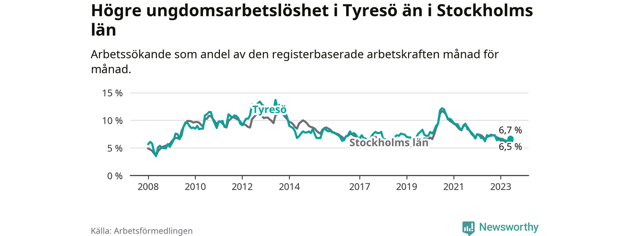 Medan Tyresö har lägre total arbetslöshet än Stockholms län, ligger ungdomsarbetslösheten 0,2 procentenheter högre i Tyresö.