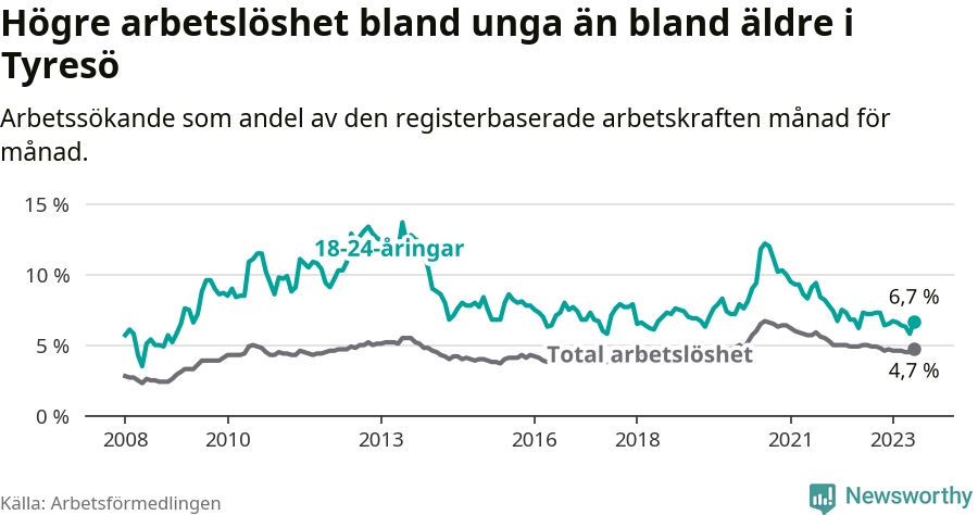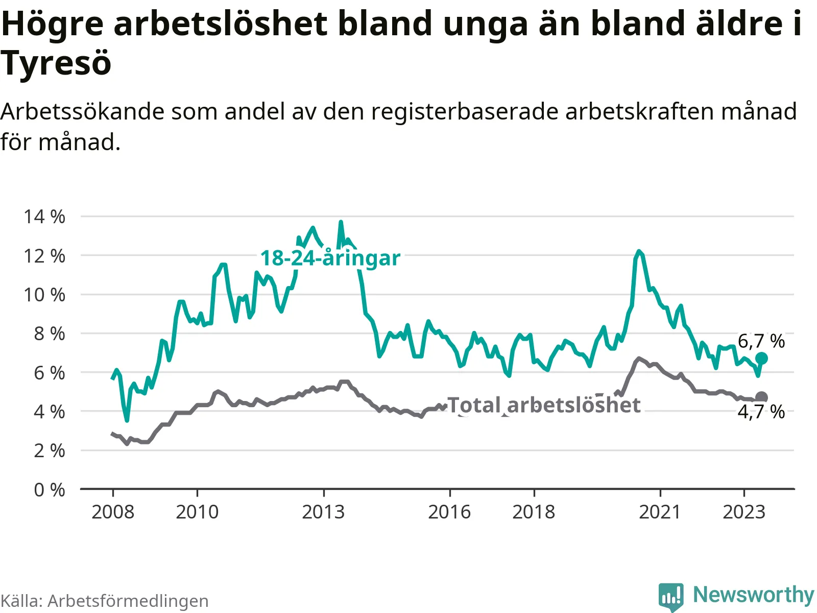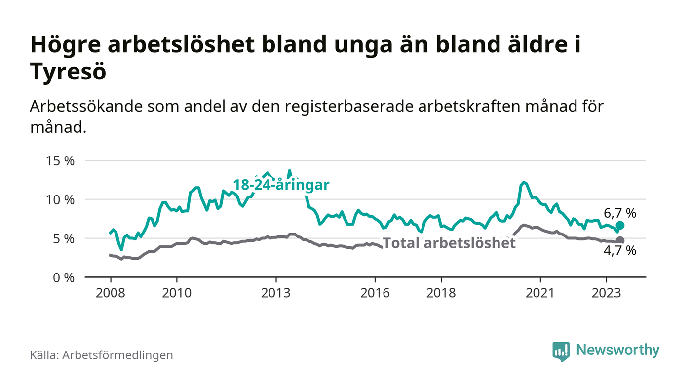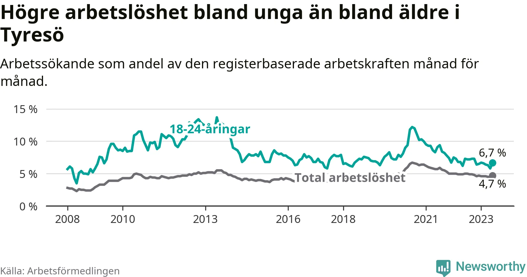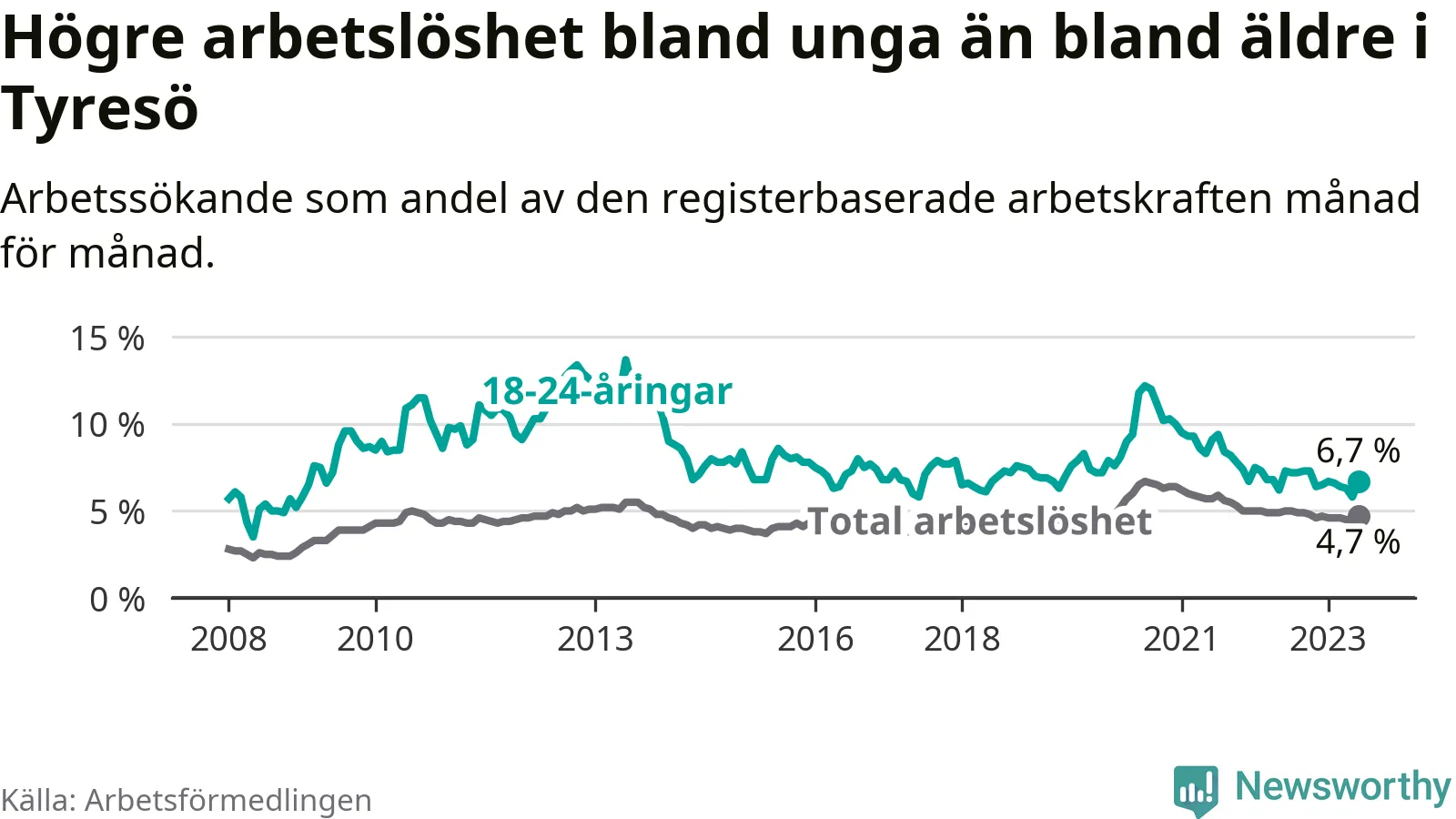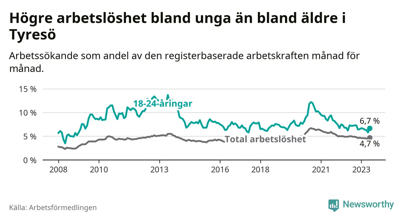 Medan Tyresö har lägre total arbetslöshet än Stockholms län, ligger ungdomsarbetslösheten 0,2 procentenheter högre i Tyresö.