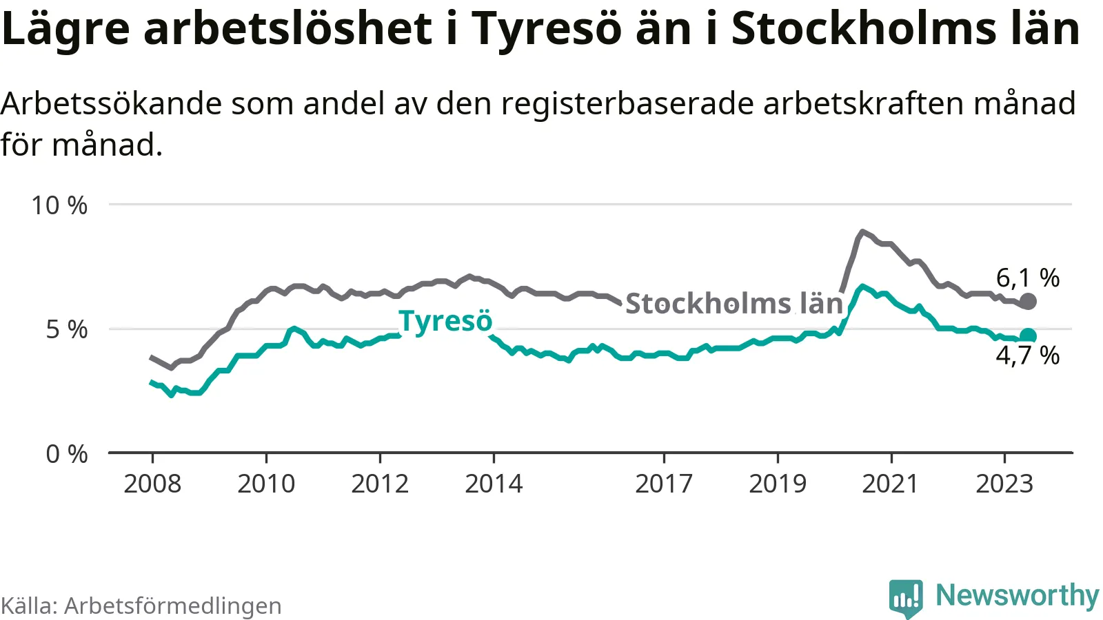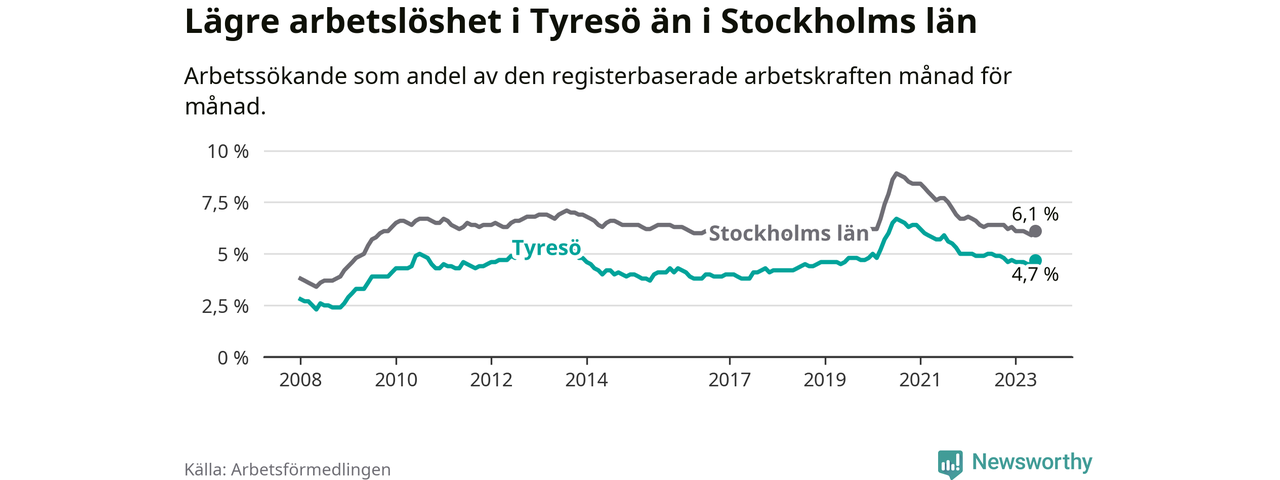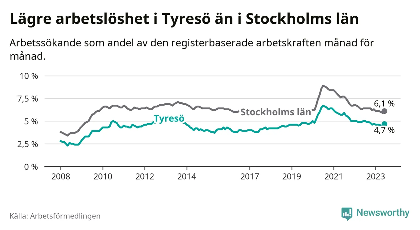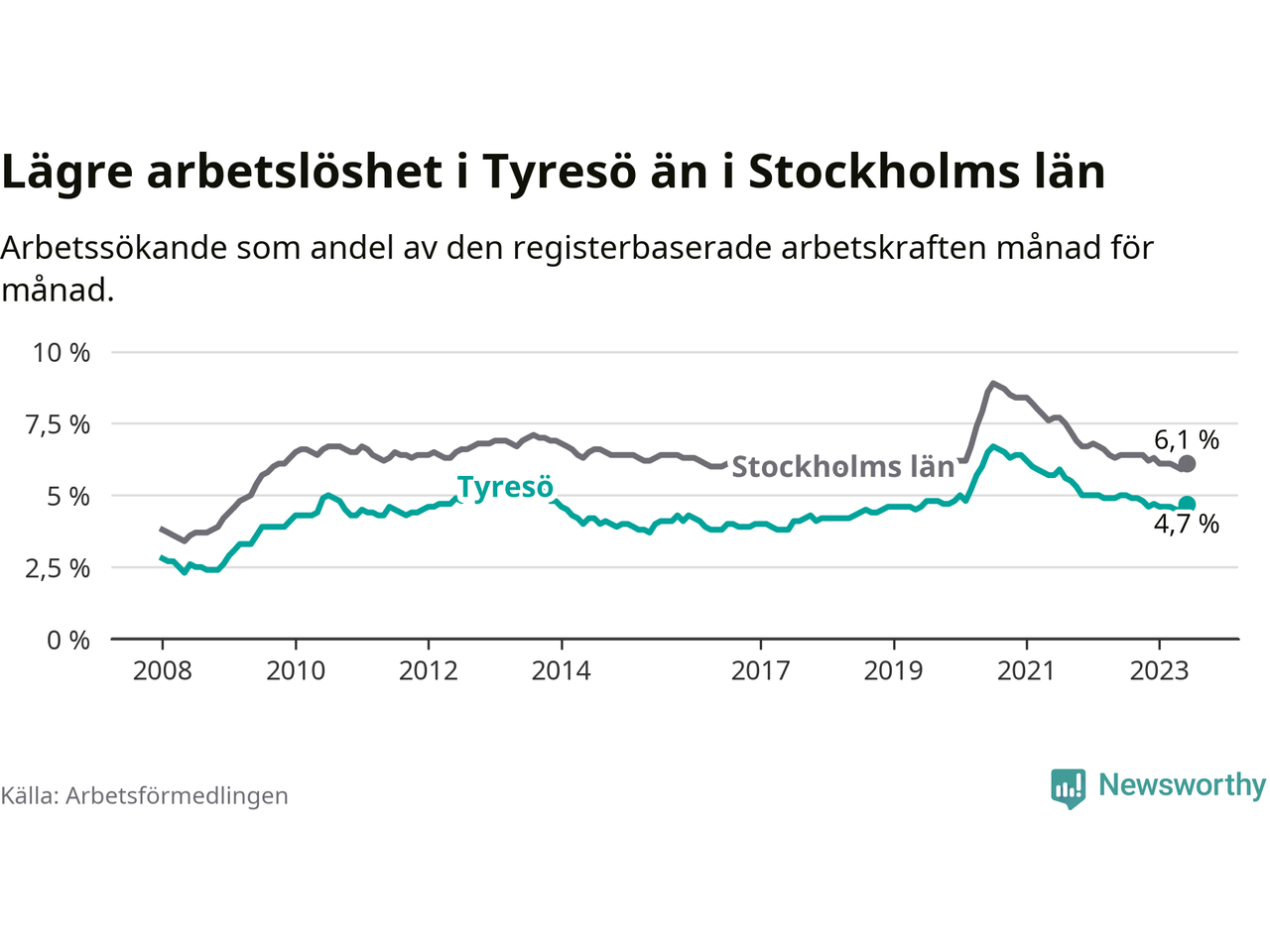 Det är 26:e månaden i följd som arbetslösheten i Tyresö är lägre än den var under samma tidpunkt året innan. Sedan april 2021 har arbetslösheten gått ner från 5,8 till 4,7 procent.