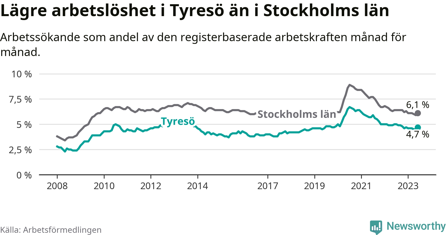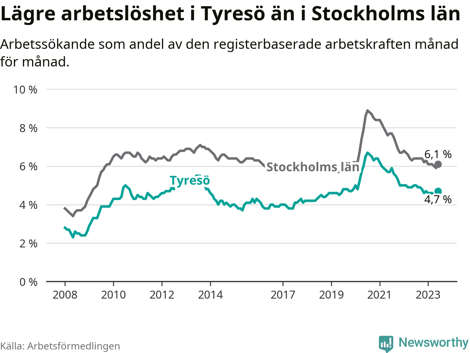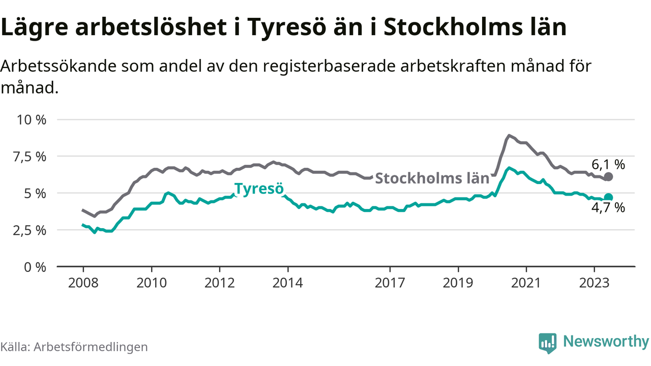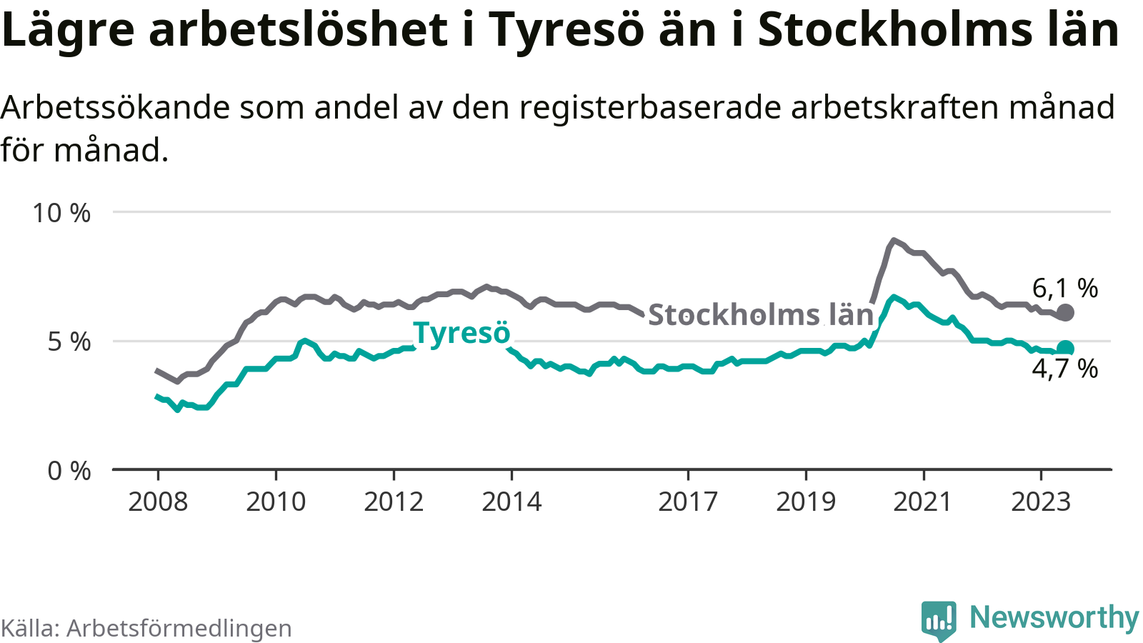 Det är 26:e månaden i följd som arbetslösheten i Tyresö är lägre än den var under samma tidpunkt året innan. Sedan april 2021 har arbetslösheten gått ner från 5,8 till 4,7 procent.