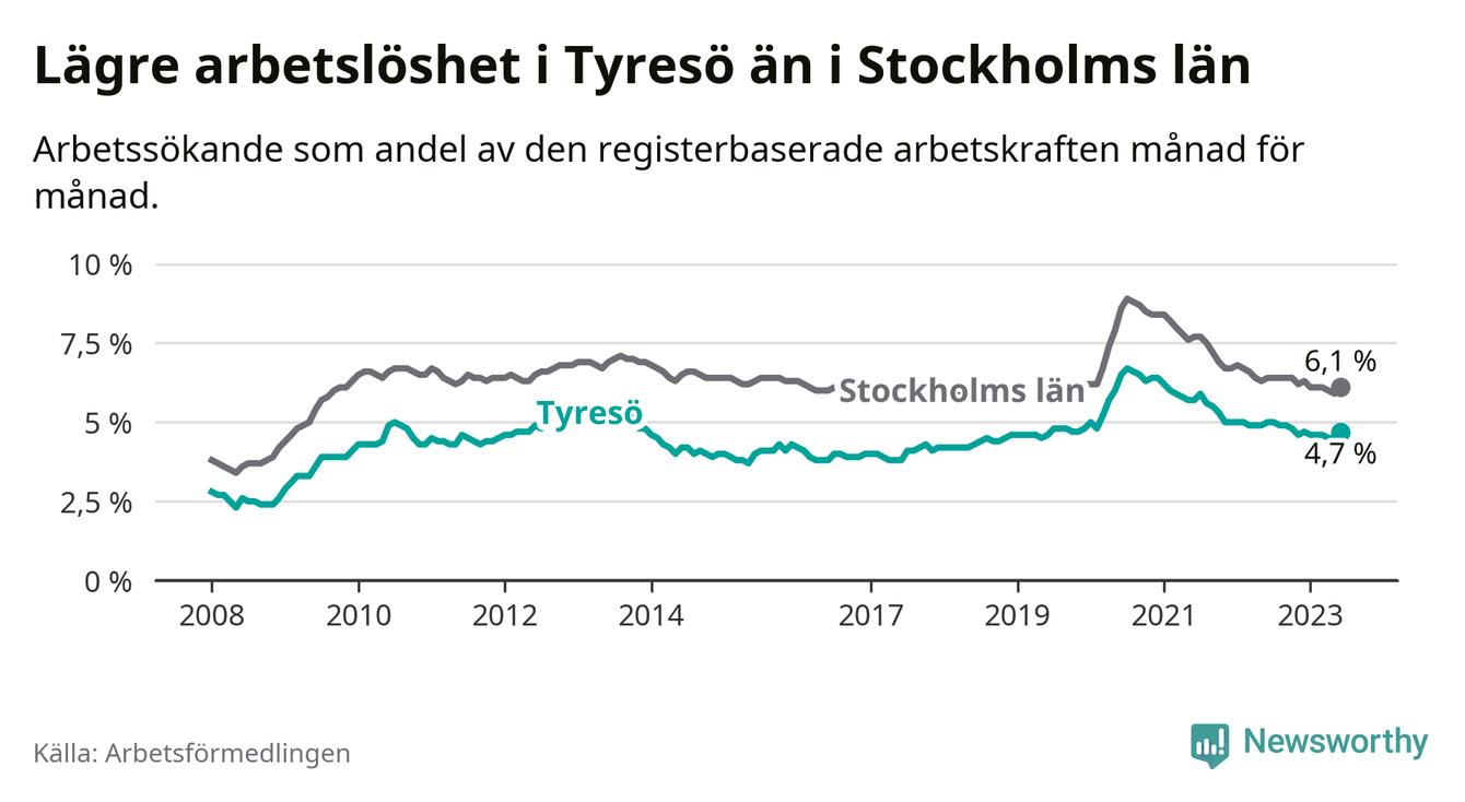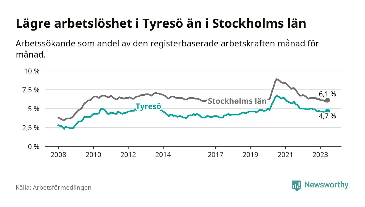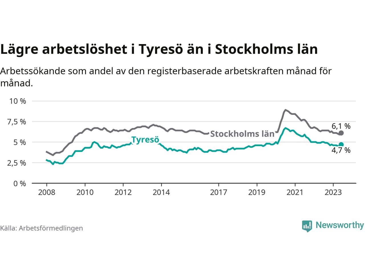 Tyresö hade redan tidigare lägre arbetslöshet än snittet i hela Stockholms län och nu växer klyftan (4,7 procent i kommunen, jämfört med 6,1 procent i hela länet). Vaxholm har den lägsta arbetslösheten i länet (3,1 procent), medan Botkyrka har den högsta (10,3 procent). För att Tyresö skulle komma ner i samma arbetslöshetsnivå som Vaxholm skulle 403 personer behöva sysselsättas.