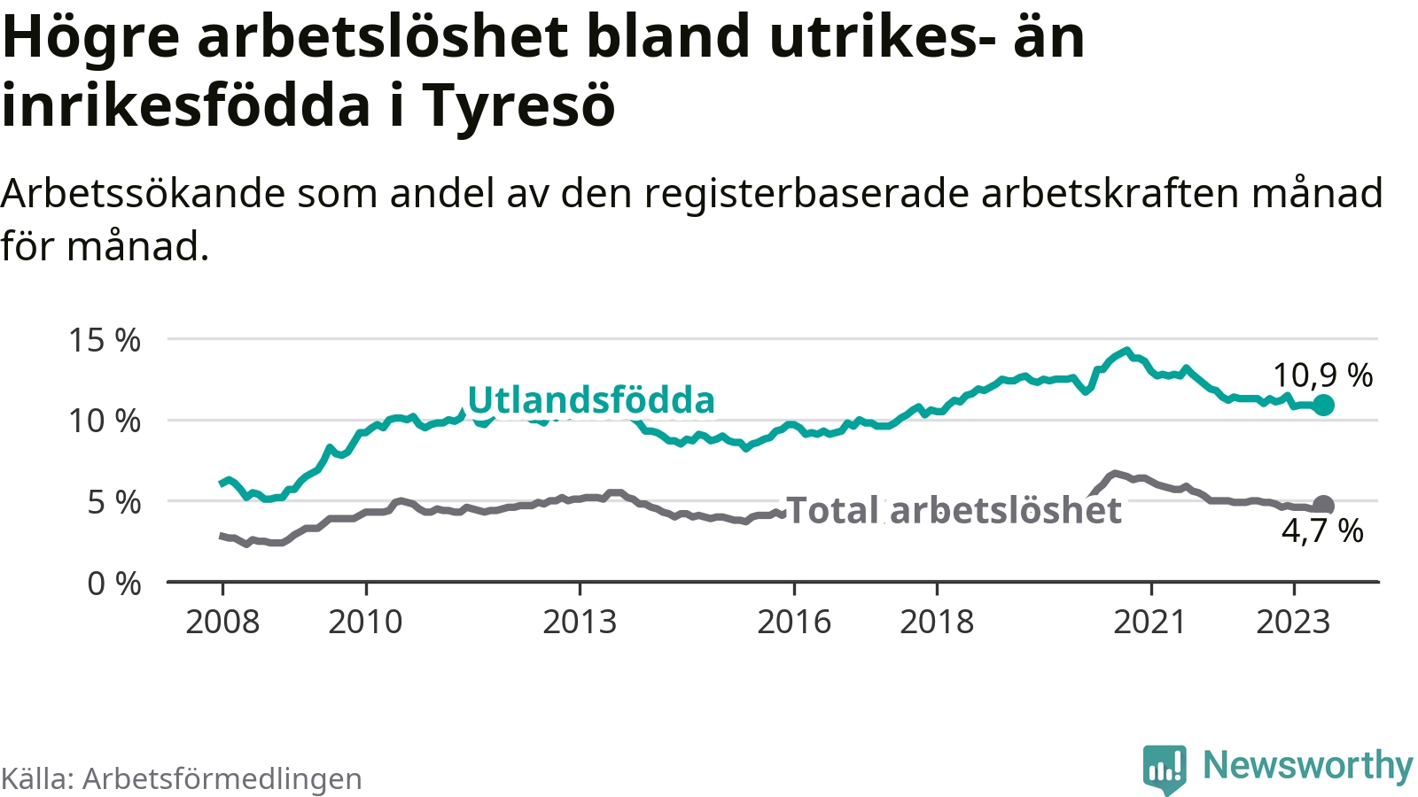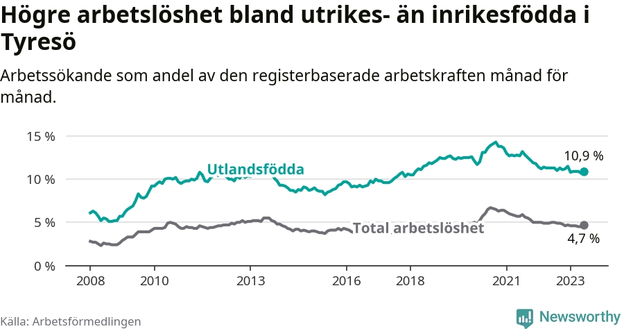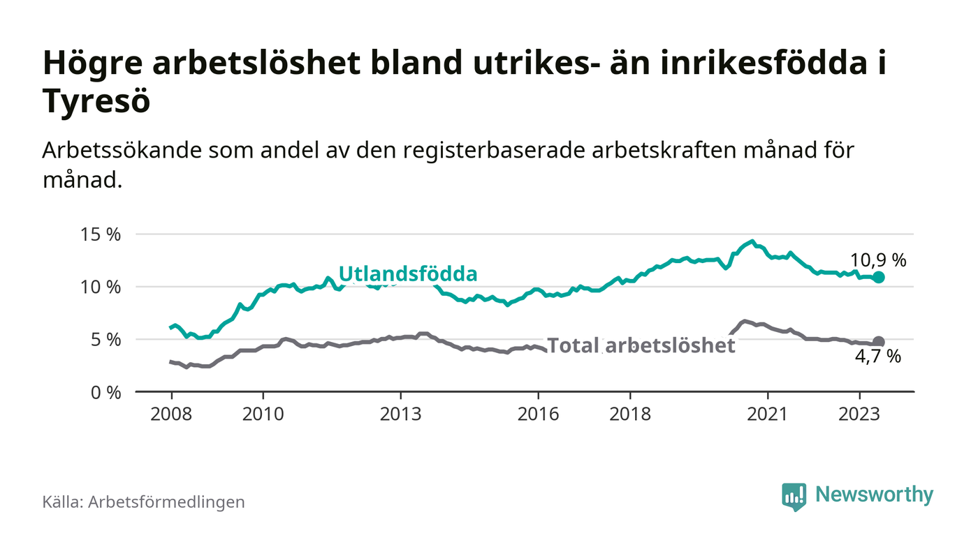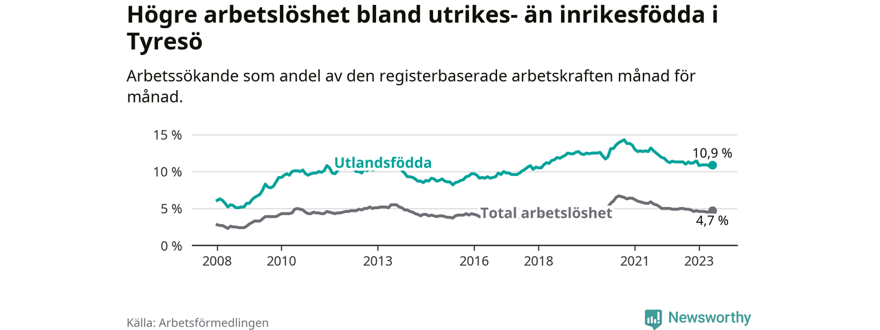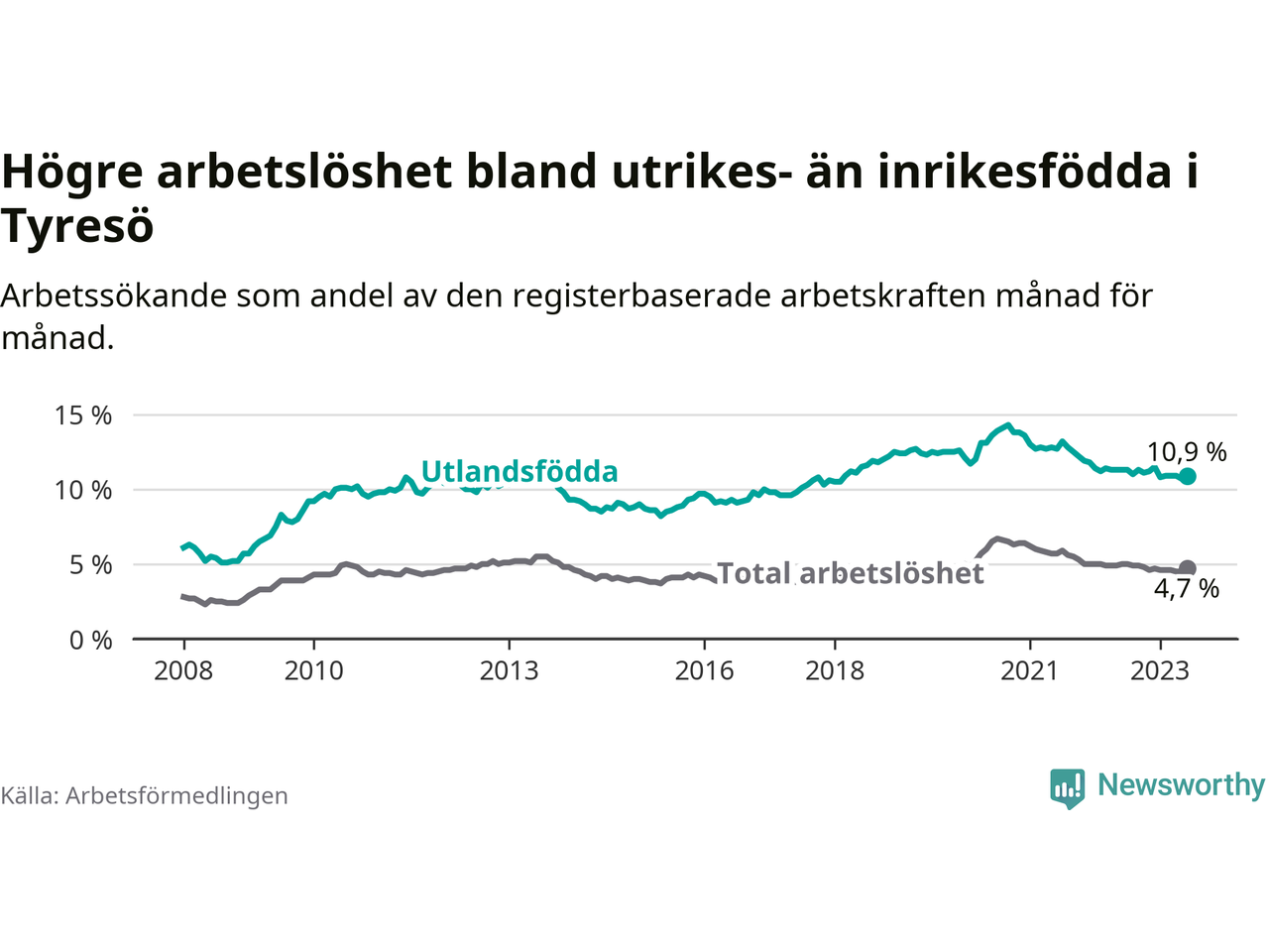 Arbetslösheten bland utlandsfödda var 10,9 procent i Tyresö under juni månad, motsvarande 561 av 5 147 personer. Det är 0,4 procentenheter färre än vid samma tidpunkt i fjol (+1 om man räknar personer). Därmed har de utlandsföddas arbetslöshet varit lägre än vid samma tidpunkt i fjol i över två år i sträck. Sedan mars 2021 har arbetslösheten bland utlandsfödda minskat från 12,8 till 10,9 procent.