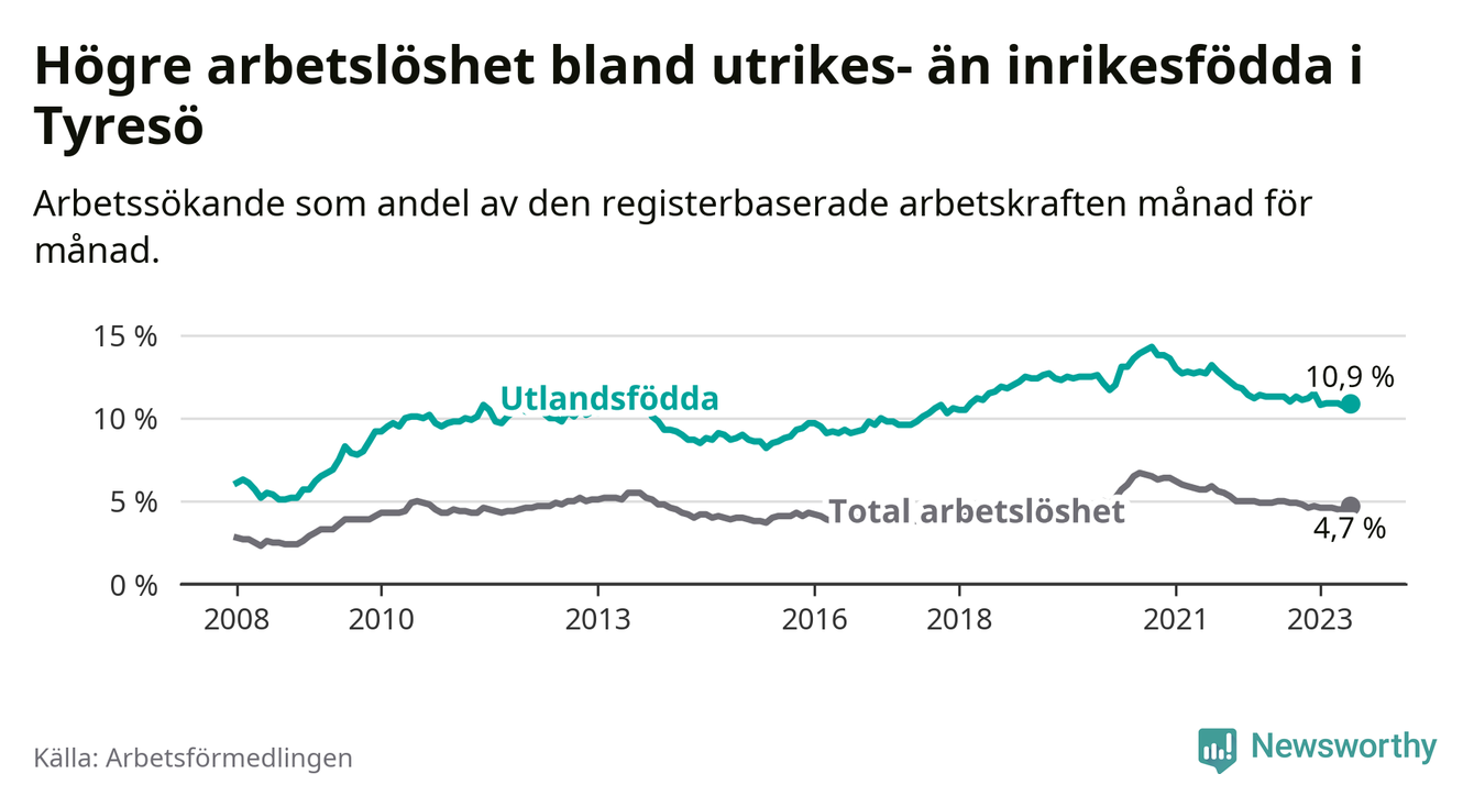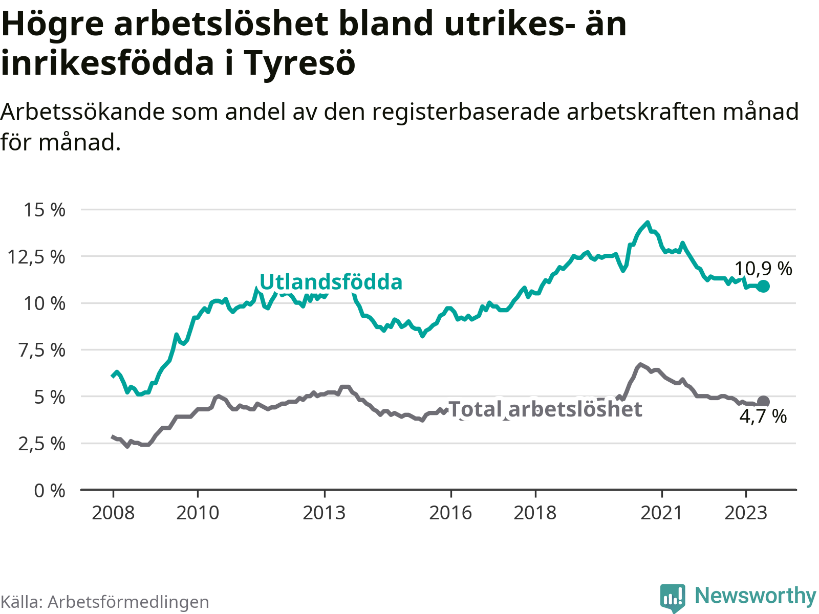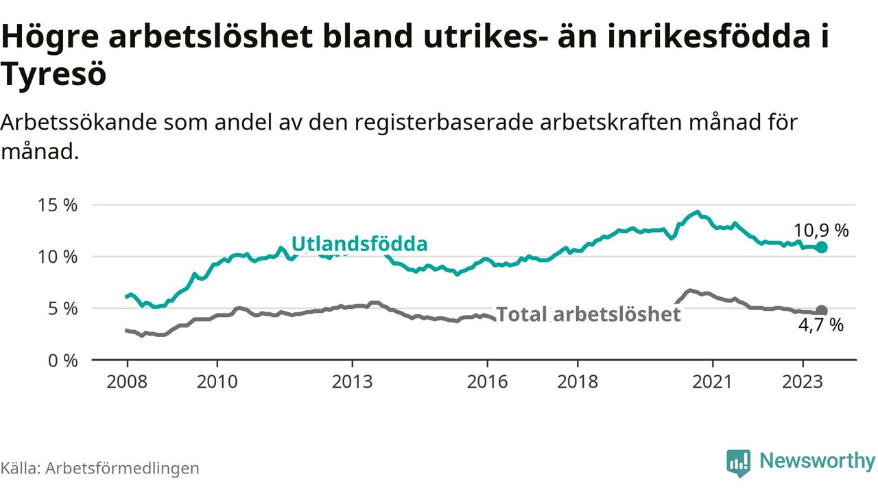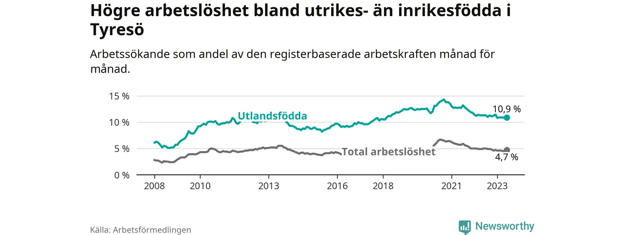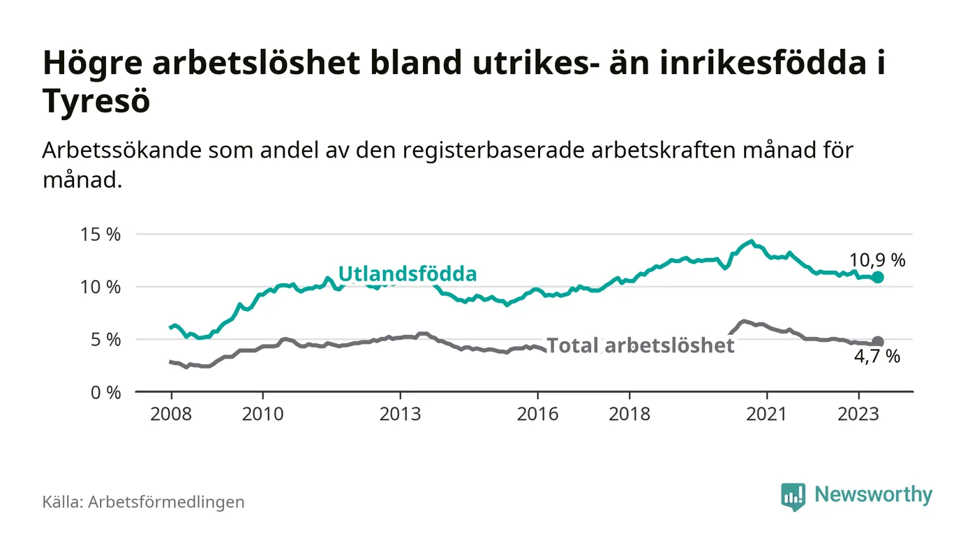 Skillnaden i arbetslöshet mellan utrikesfödda och hela befolkningen är 6,2 procentenheter i Tyresö.