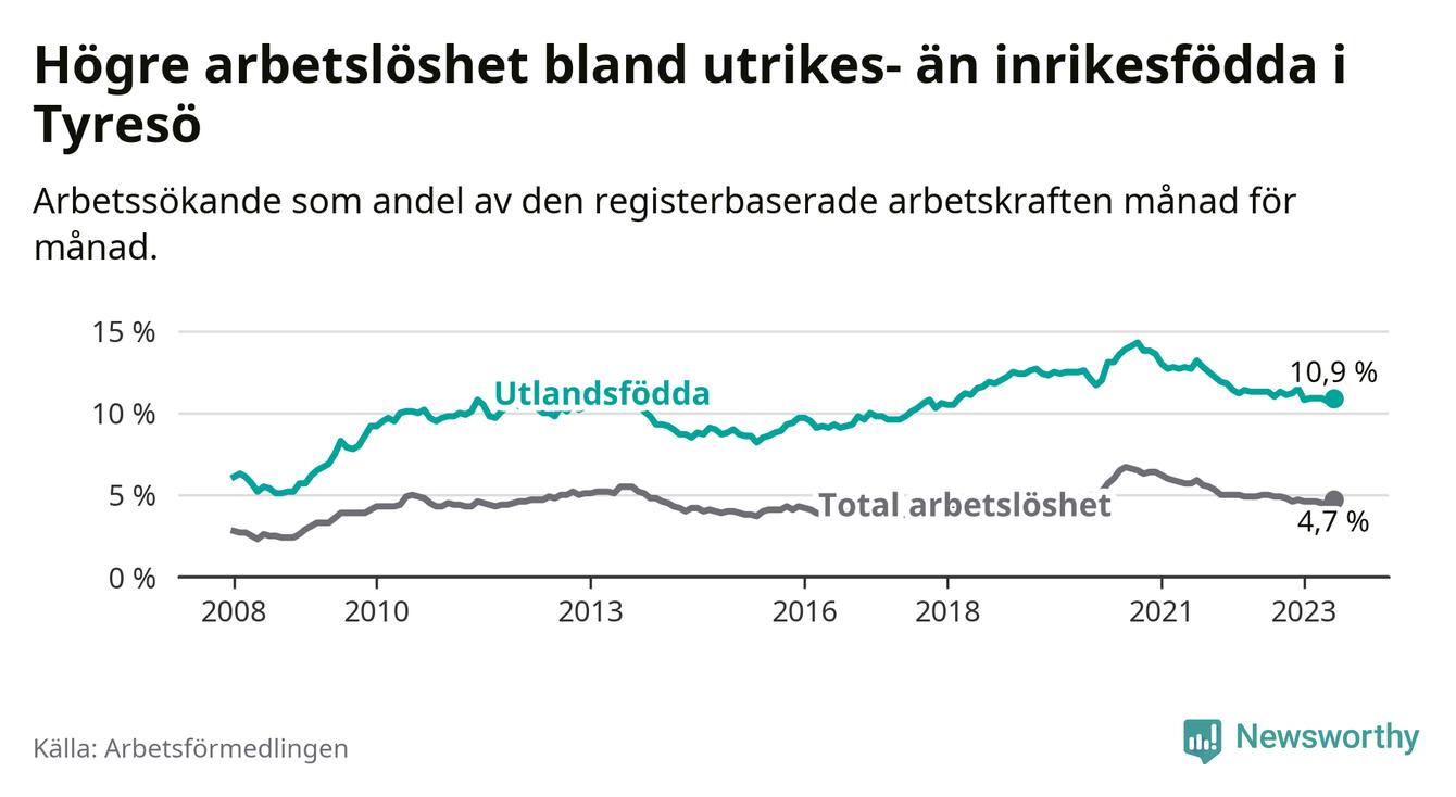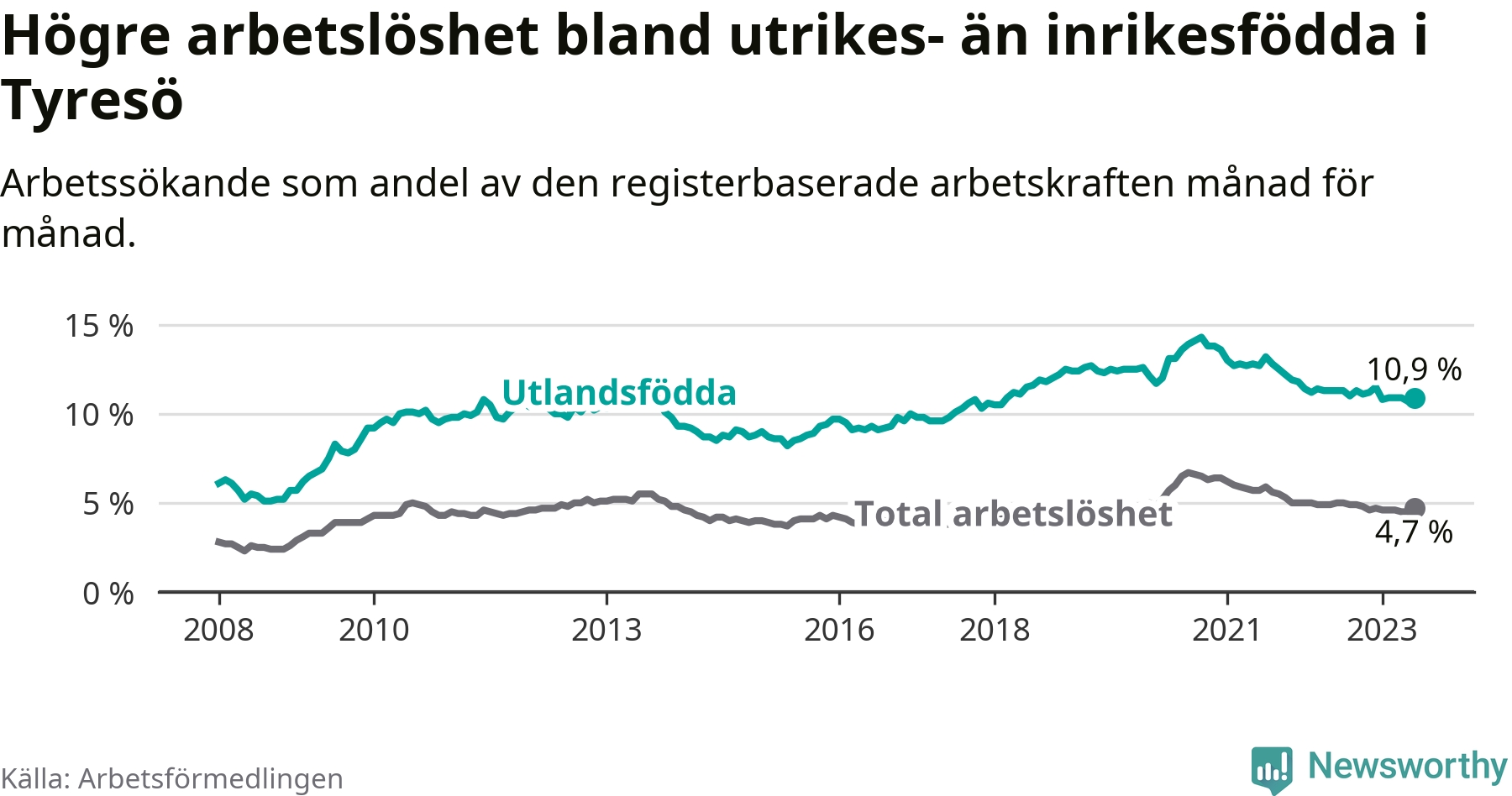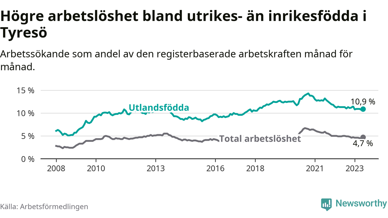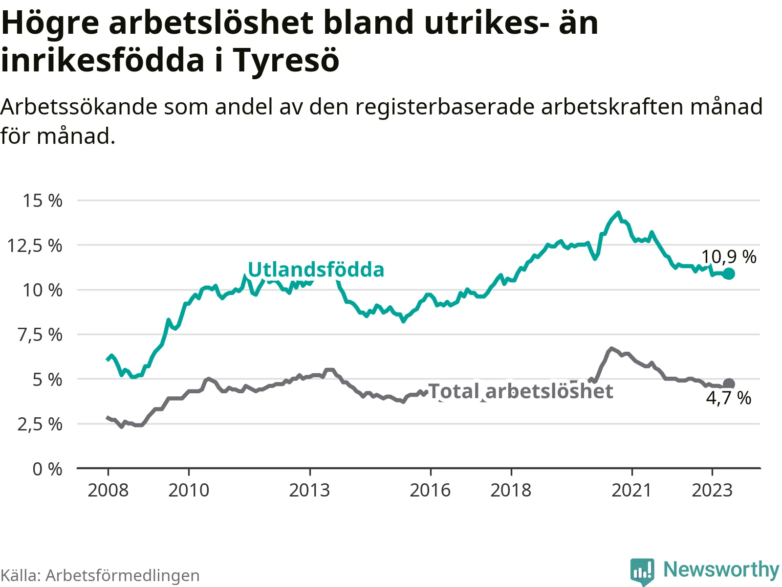 Skillnaden i arbetslöshet mellan utrikesfödda och hela befolkningen är 6,2 procentenheter i Tyresö.