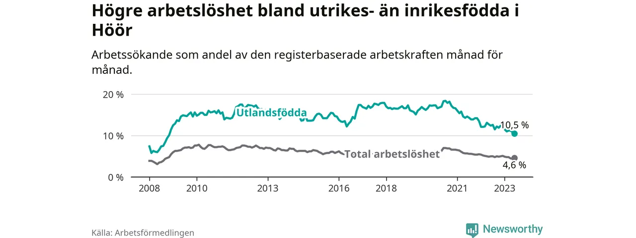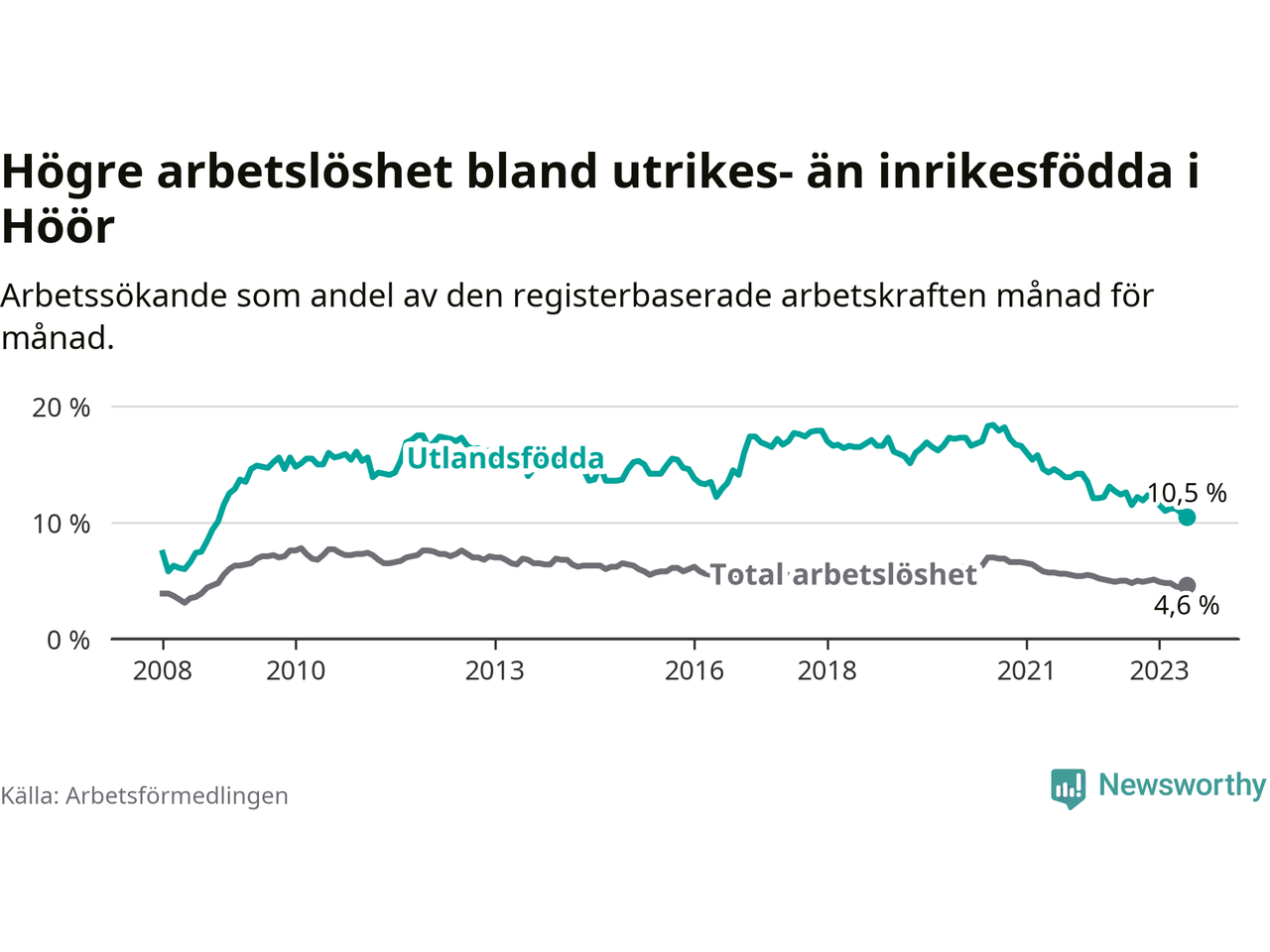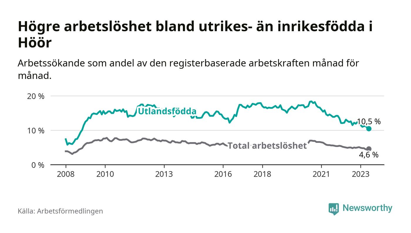 Arbetslösheten bland utlandsfödda var 10,5 procent i Höör under juni månad, motsvarande 114 av 1 086 personer. Det är 1,9 procentenheter färre än vid samma tidpunkt i fjol (−16 om man räknar personer). Därmed har de utlandsföddas arbetslöshet varit lägre än vid samma tidpunkt i fjol i över två år i sträck. Sedan oktober 2020 har arbetslösheten bland utlandsfödda minskat från 17,2 till 10,5 procent. Den nuvarande arbetslöshetsnivån är den lägsta sedan november 2008.