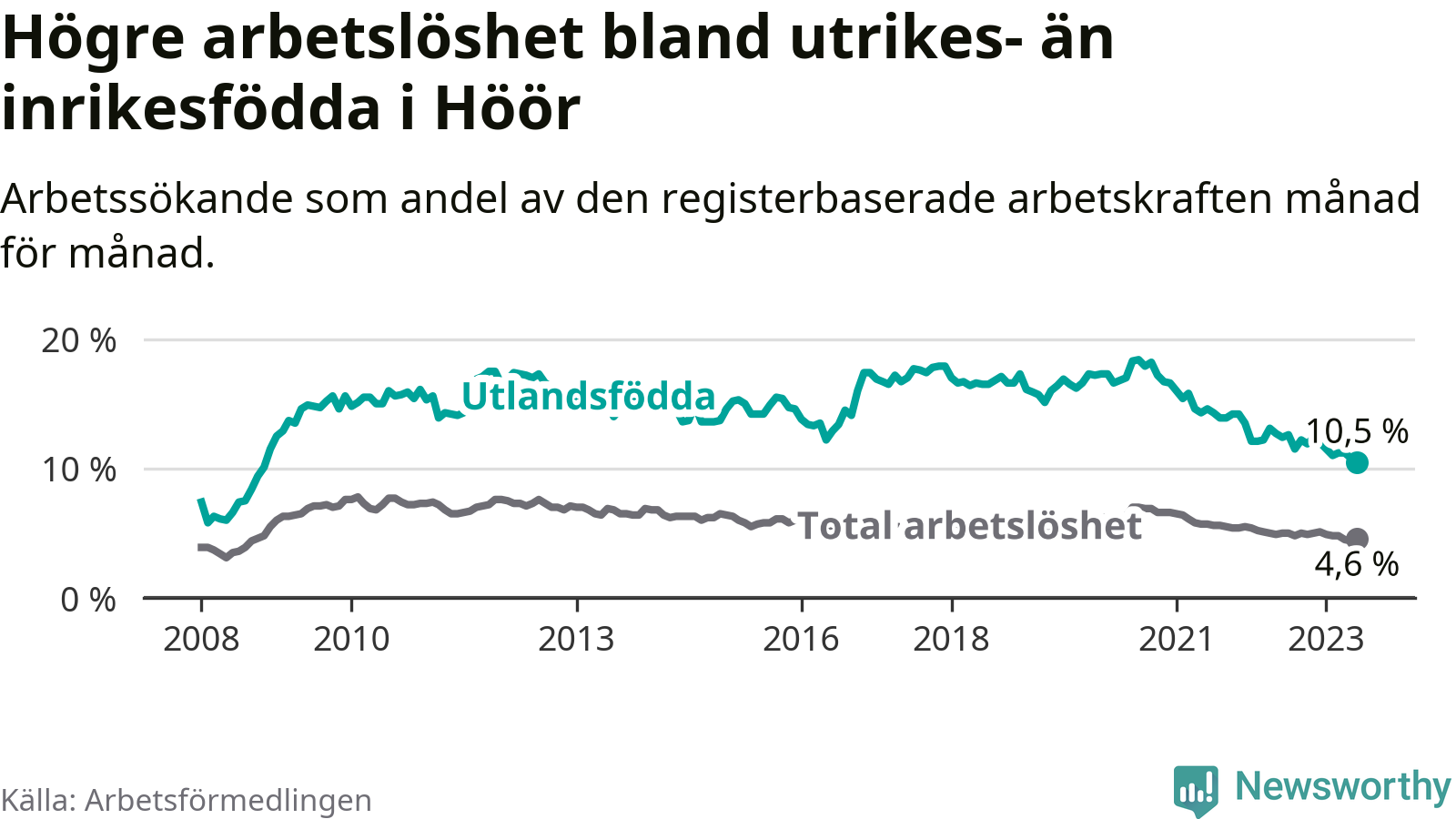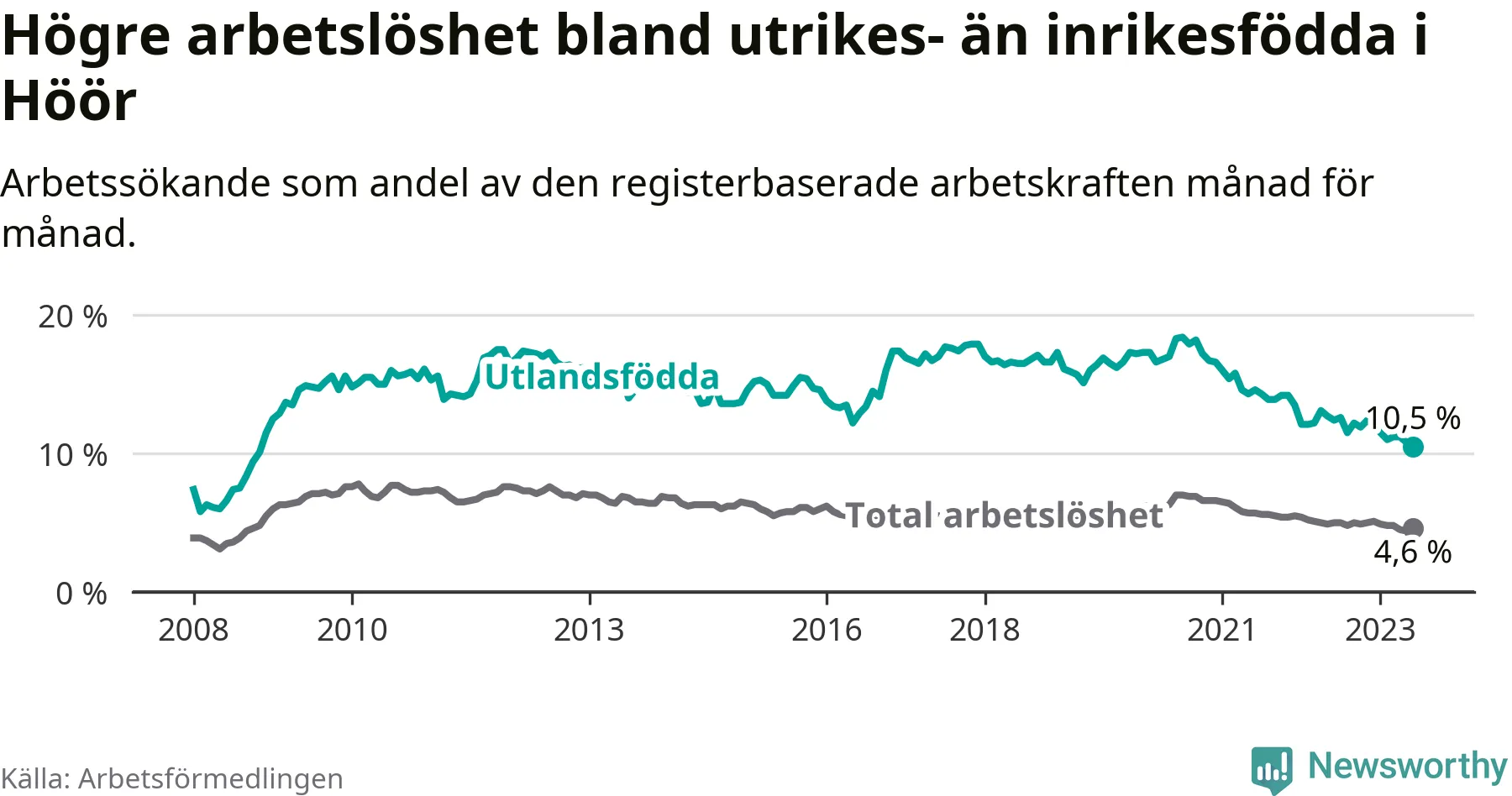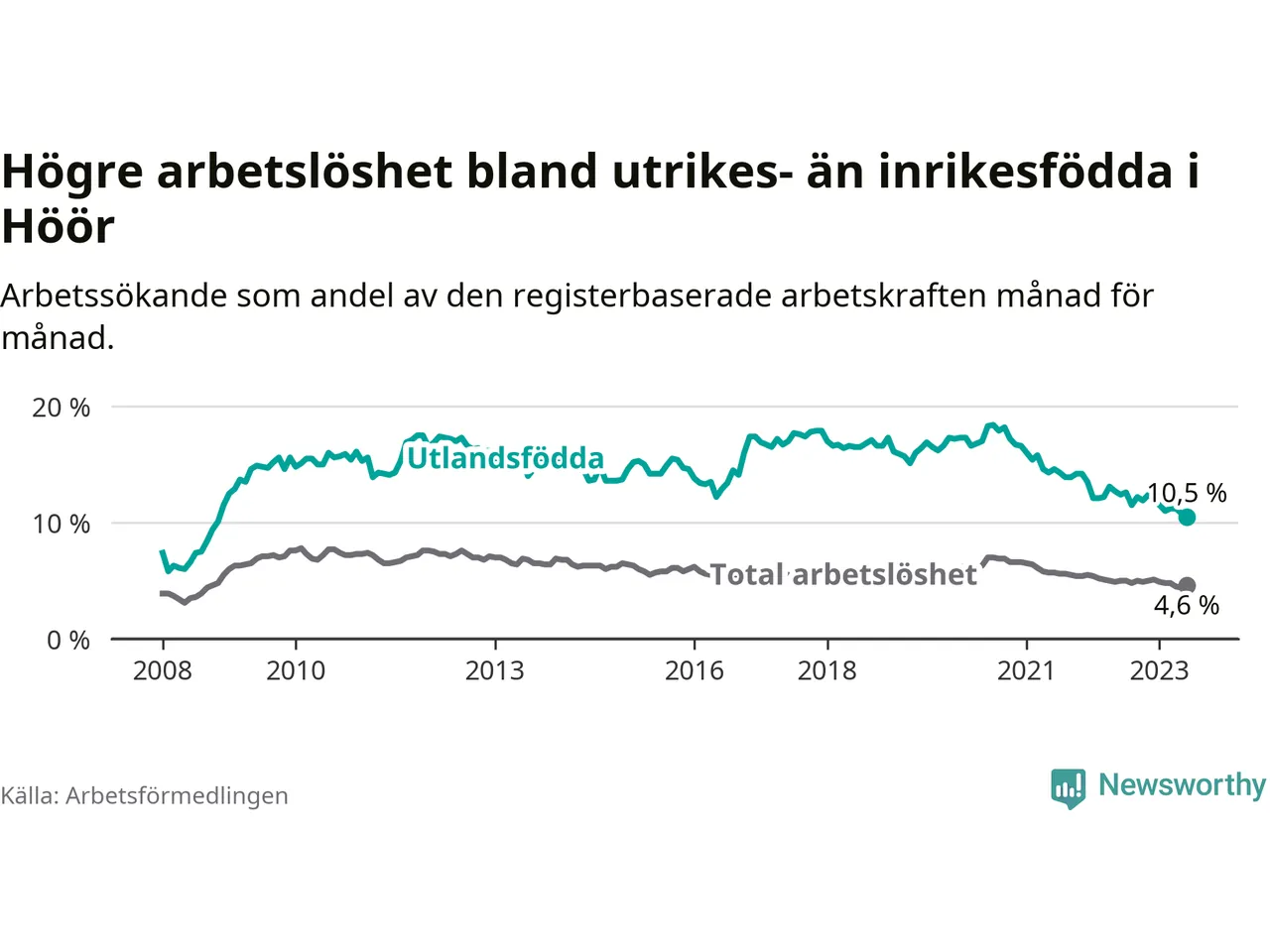 Arbetslösheten bland utlandsfödda var 10,5 procent i Höör under juni månad, motsvarande 114 av 1 086 personer. Det är 1,9 procentenheter färre än vid samma tidpunkt i fjol (−16 om man räknar personer). Därmed har de utlandsföddas arbetslöshet varit lägre än vid samma tidpunkt i fjol i över två år i sträck. Sedan oktober 2020 har arbetslösheten bland utlandsfödda minskat från 17,2 till 10,5 procent. Den nuvarande arbetslöshetsnivån är den lägsta sedan november 2008.