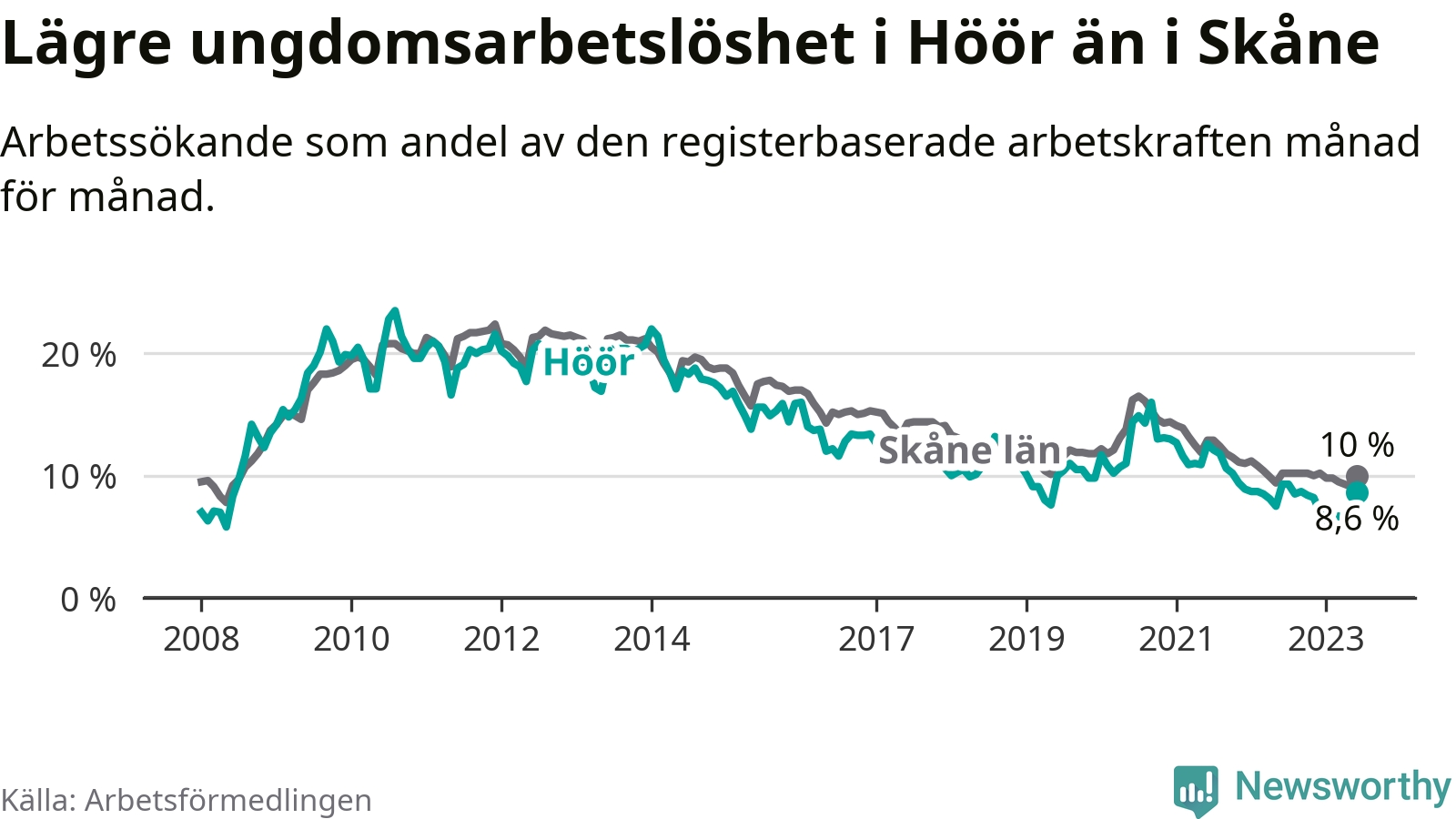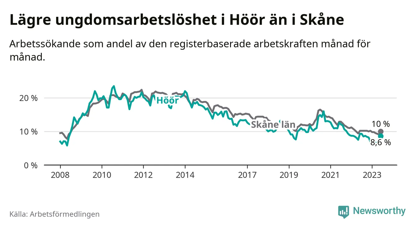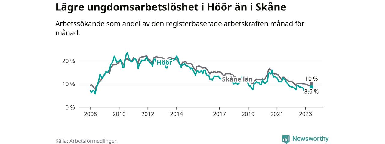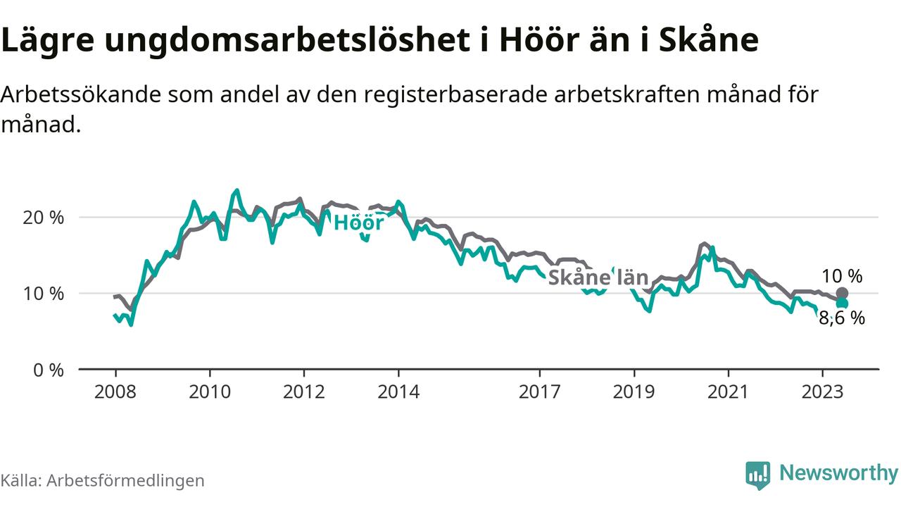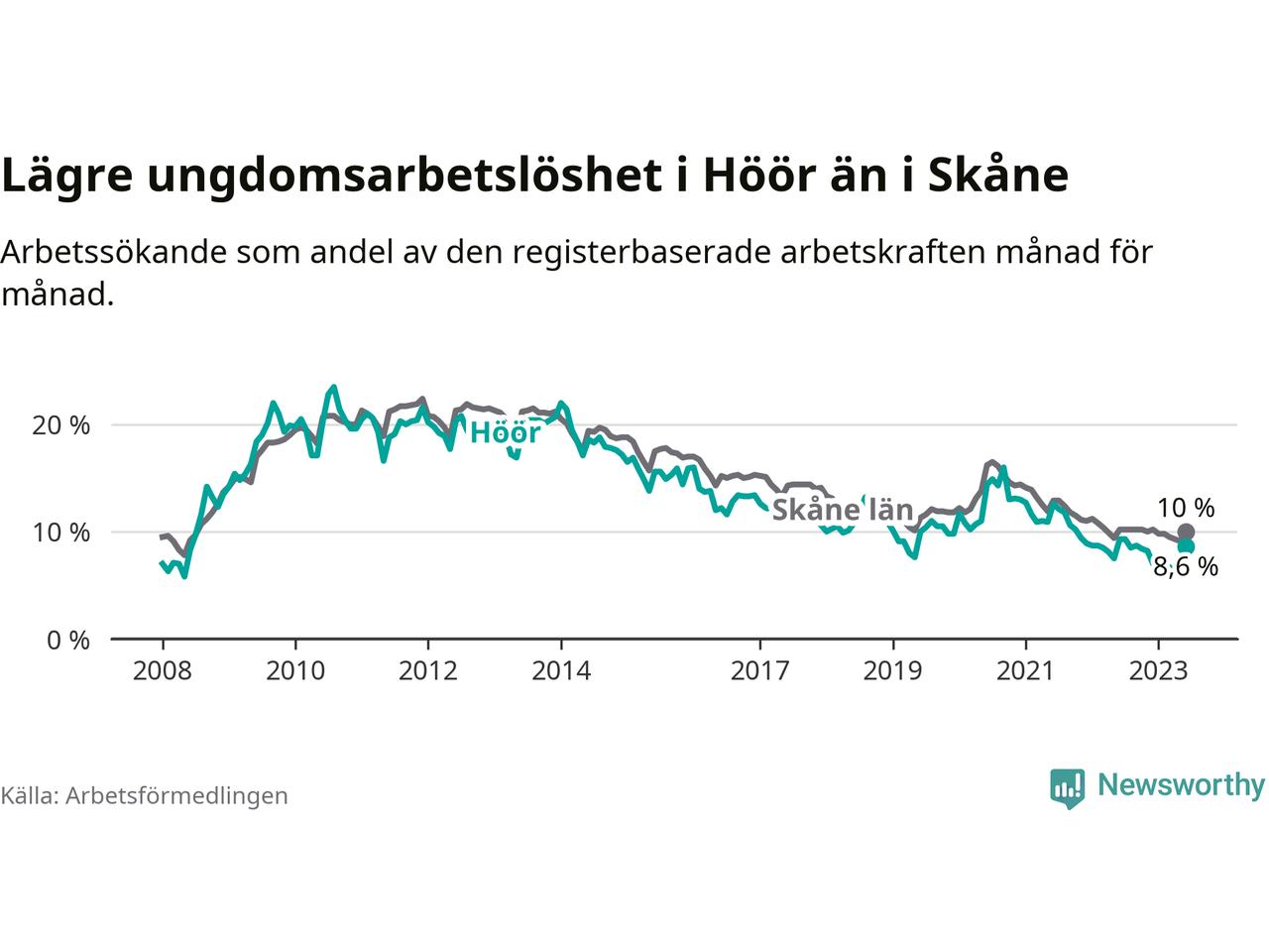 I och med den senaste månadens nedgång har de ungas arbetslöshet i Höör sjunkit över två år i sträck (ner från 11,0 procent i april 2021 till 8,6 procent nu).