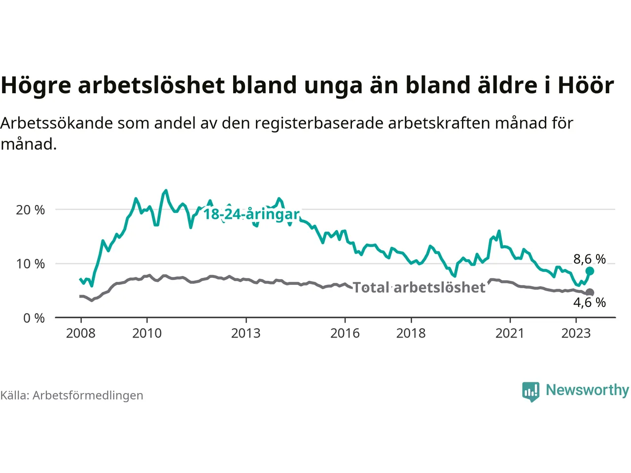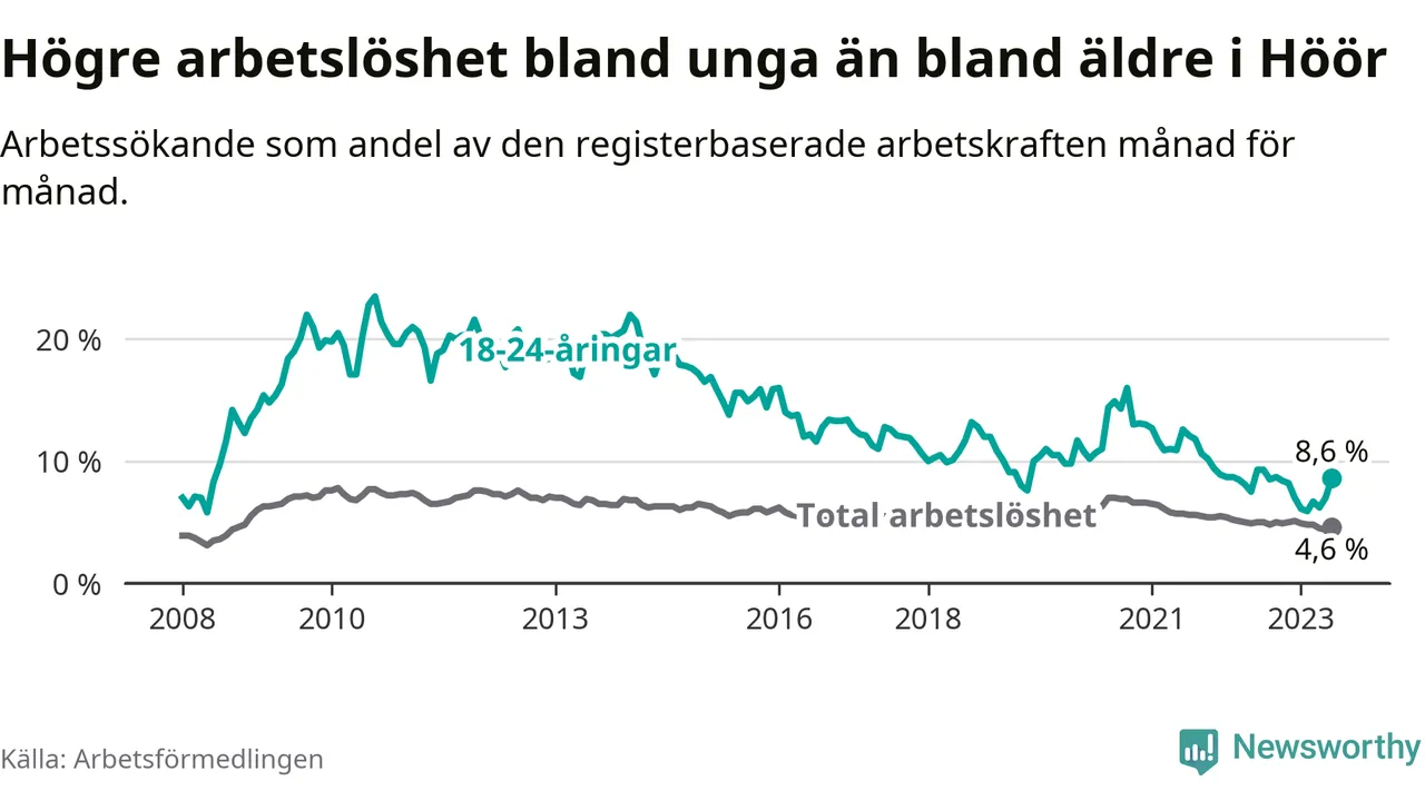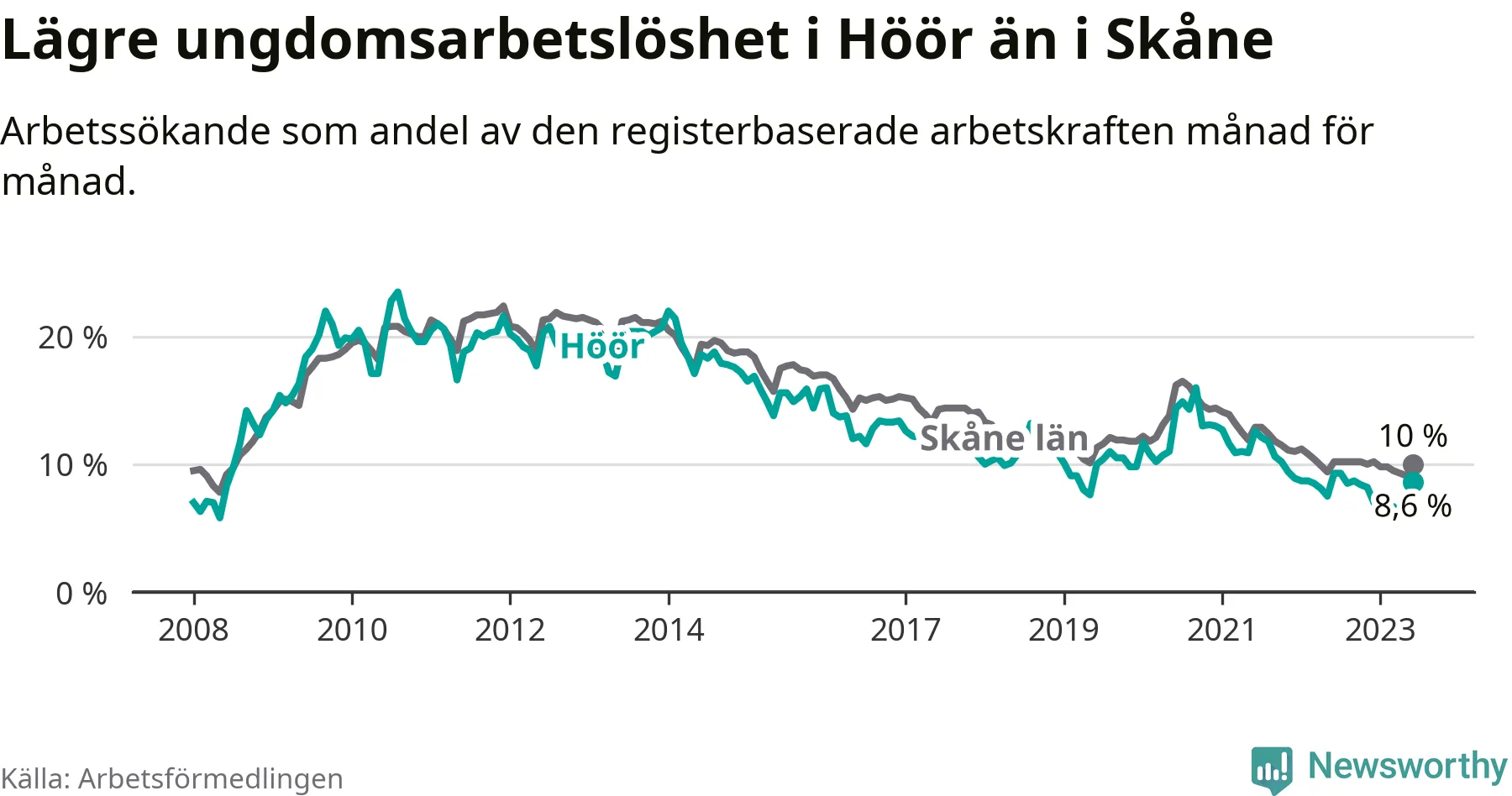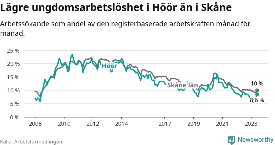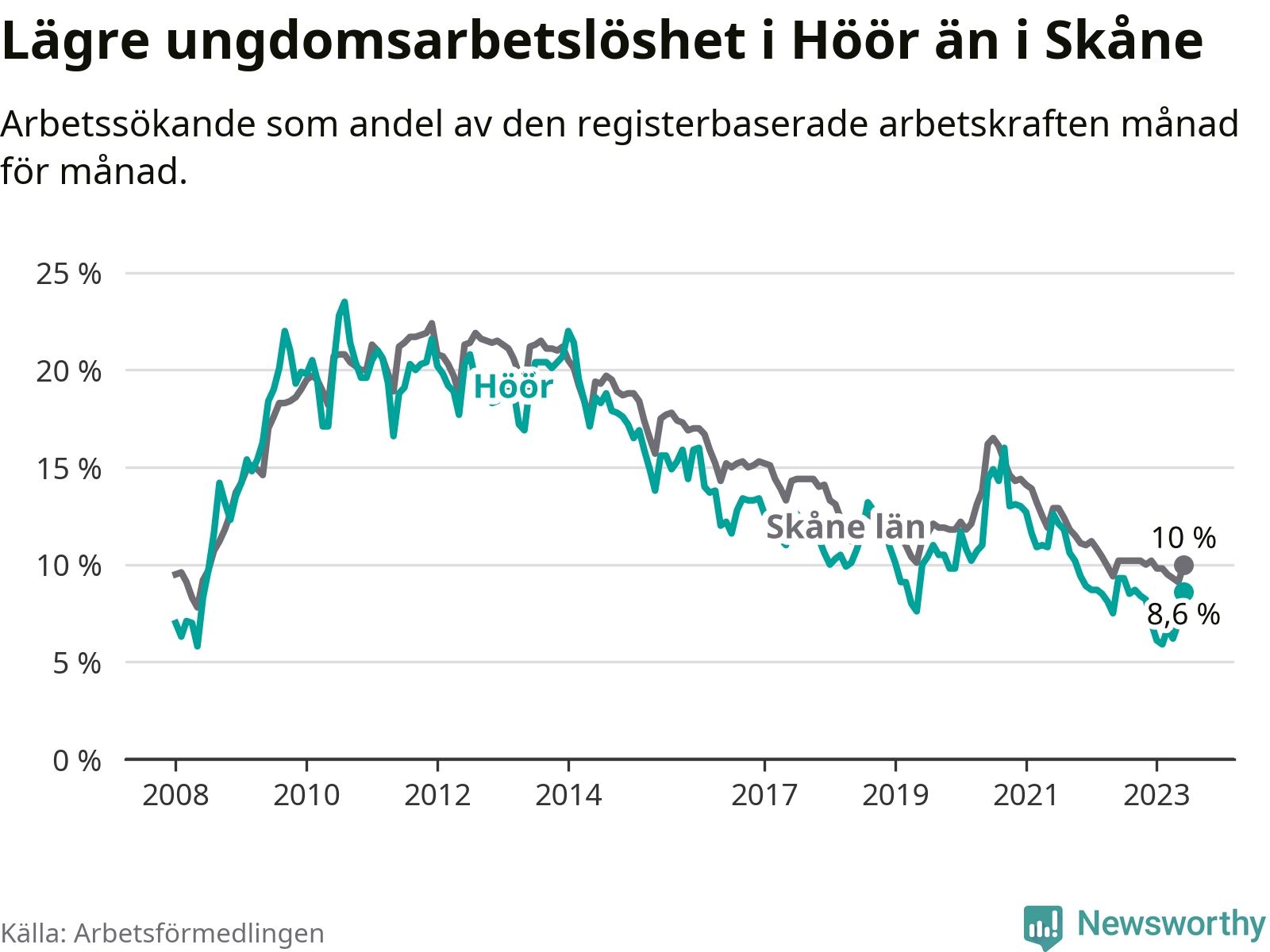 I och med den senaste månadens nedgång har de ungas arbetslöshet i Höör sjunkit över två år i sträck (ner från 11,0 procent i april 2021 till 8,6 procent nu).