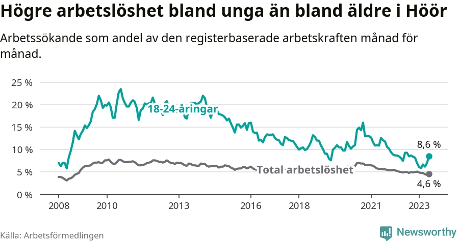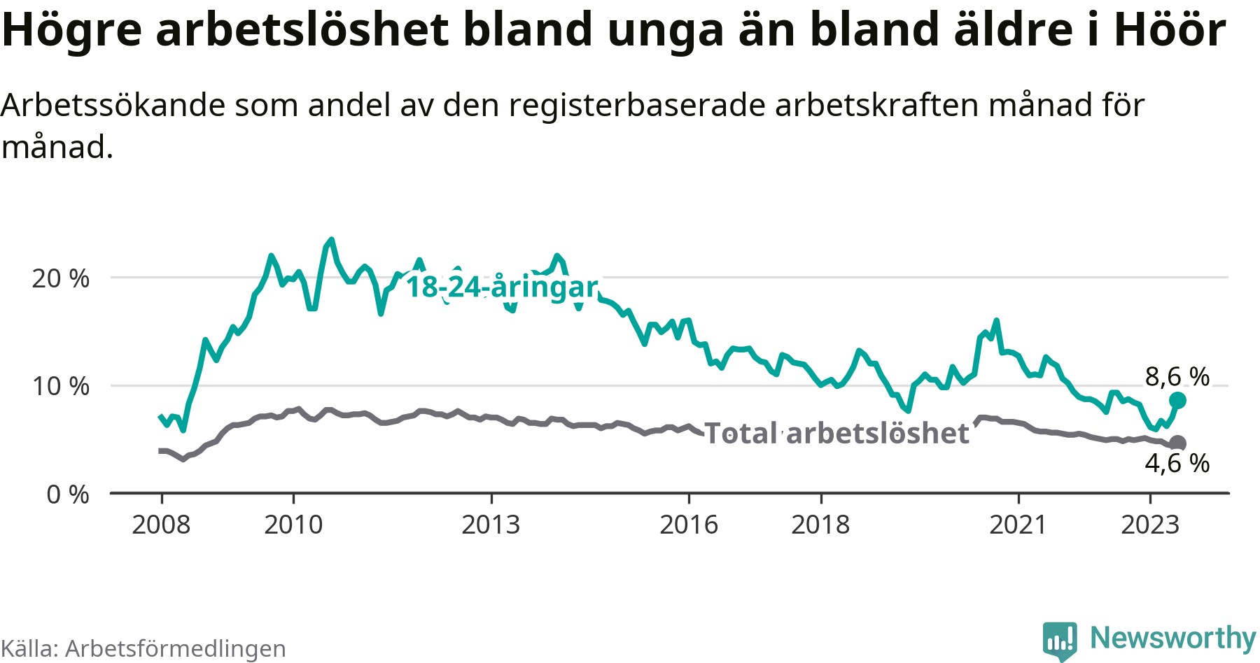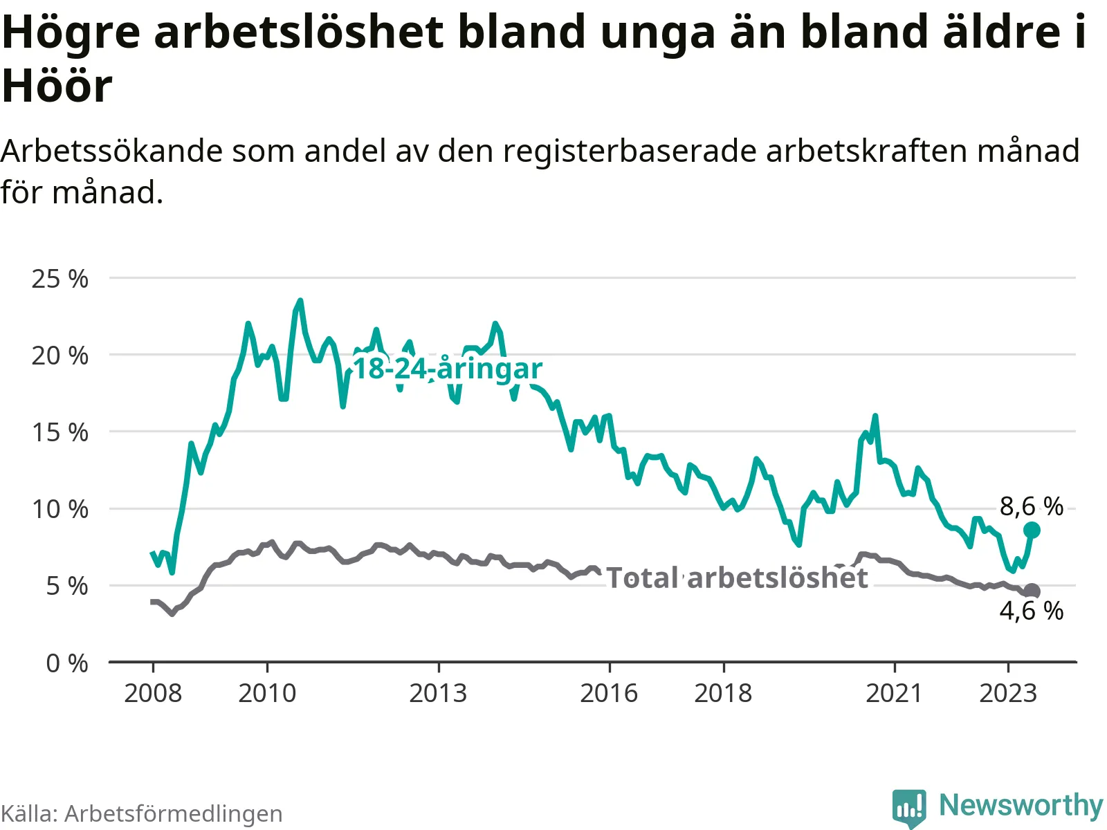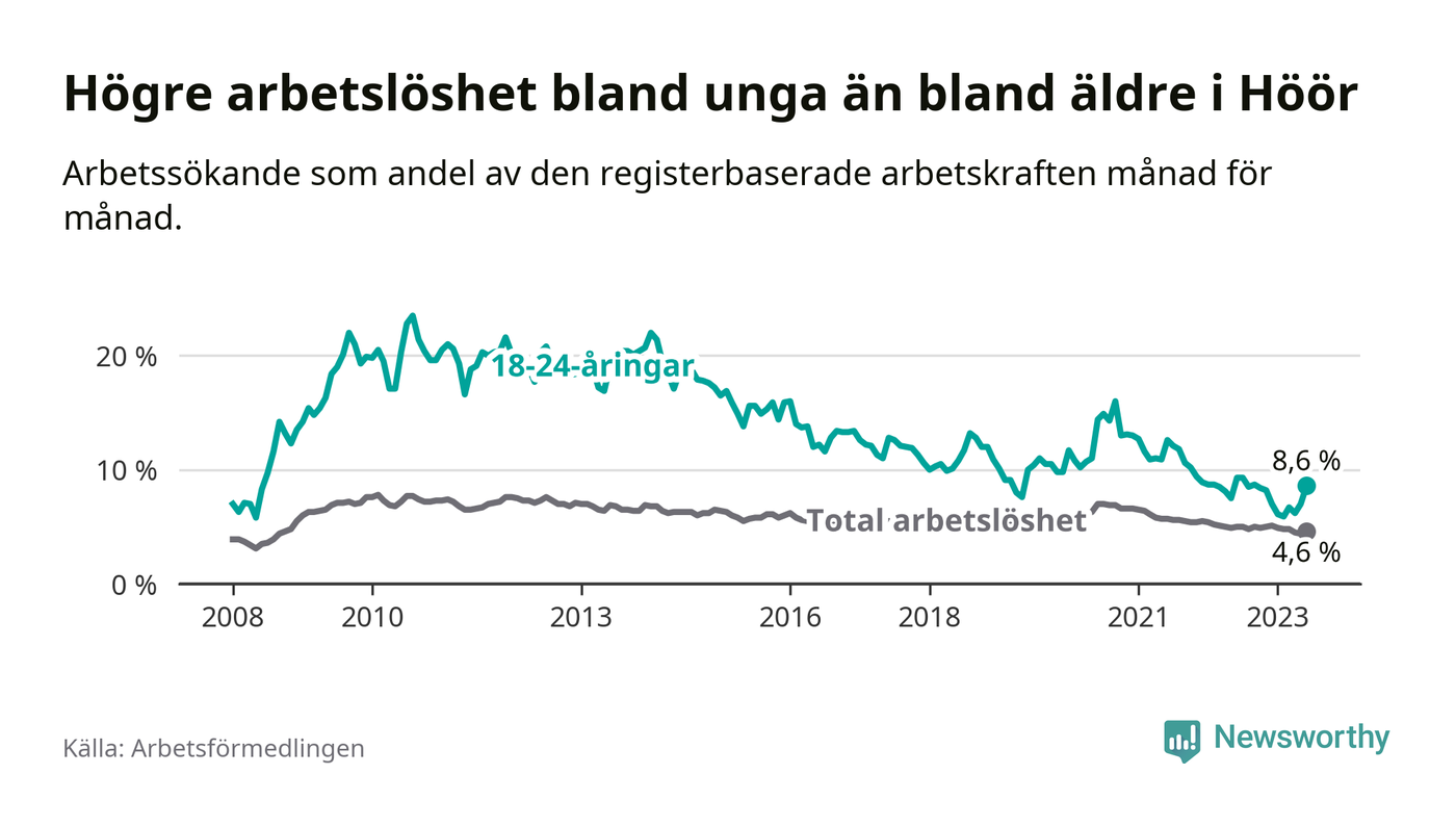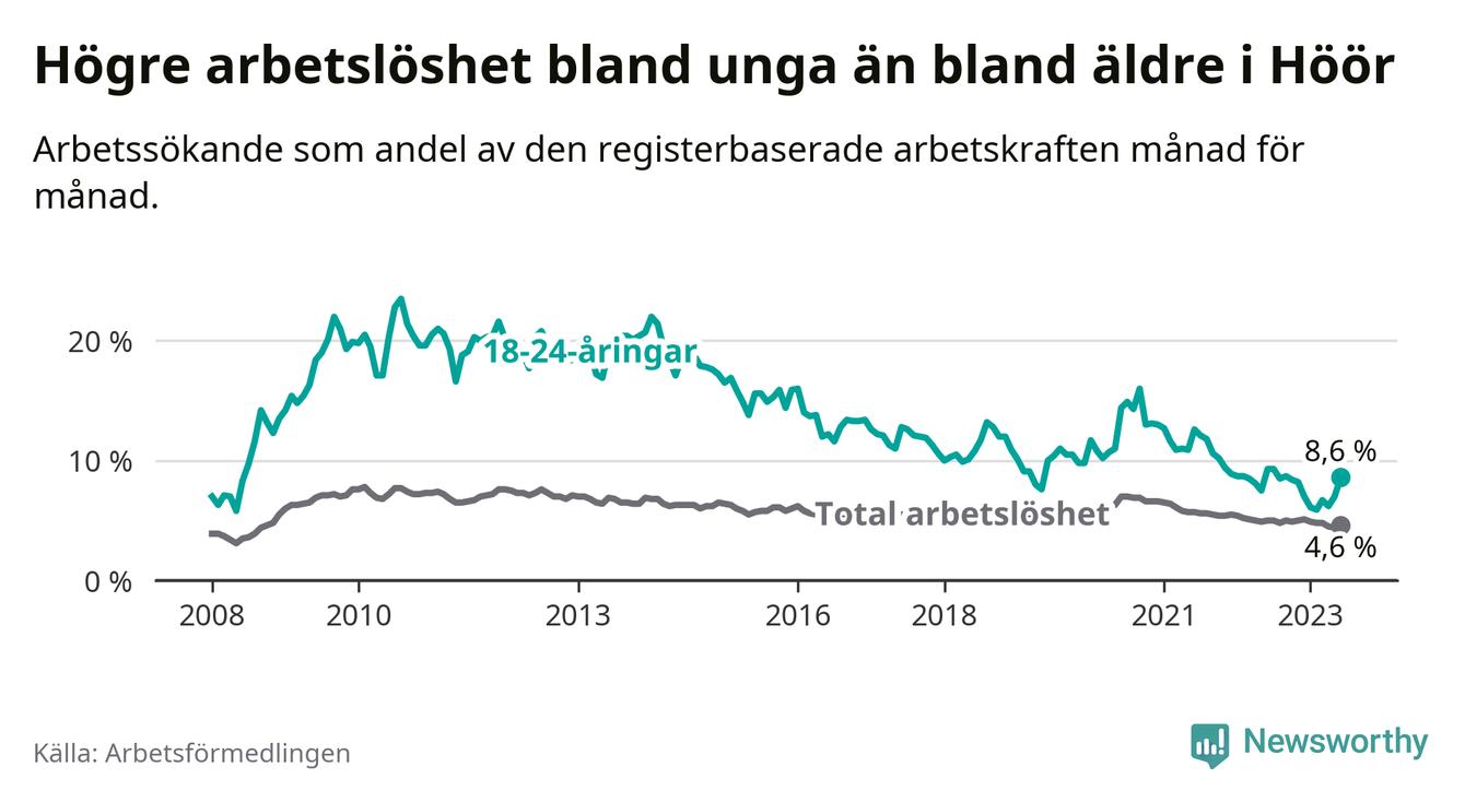 I och med den senaste månadens nedgång har de ungas arbetslöshet i Höör sjunkit över två år i sträck (ner från 11,0 procent i april 2021 till 8,6 procent nu).