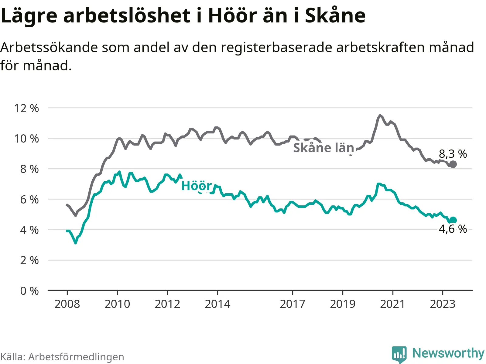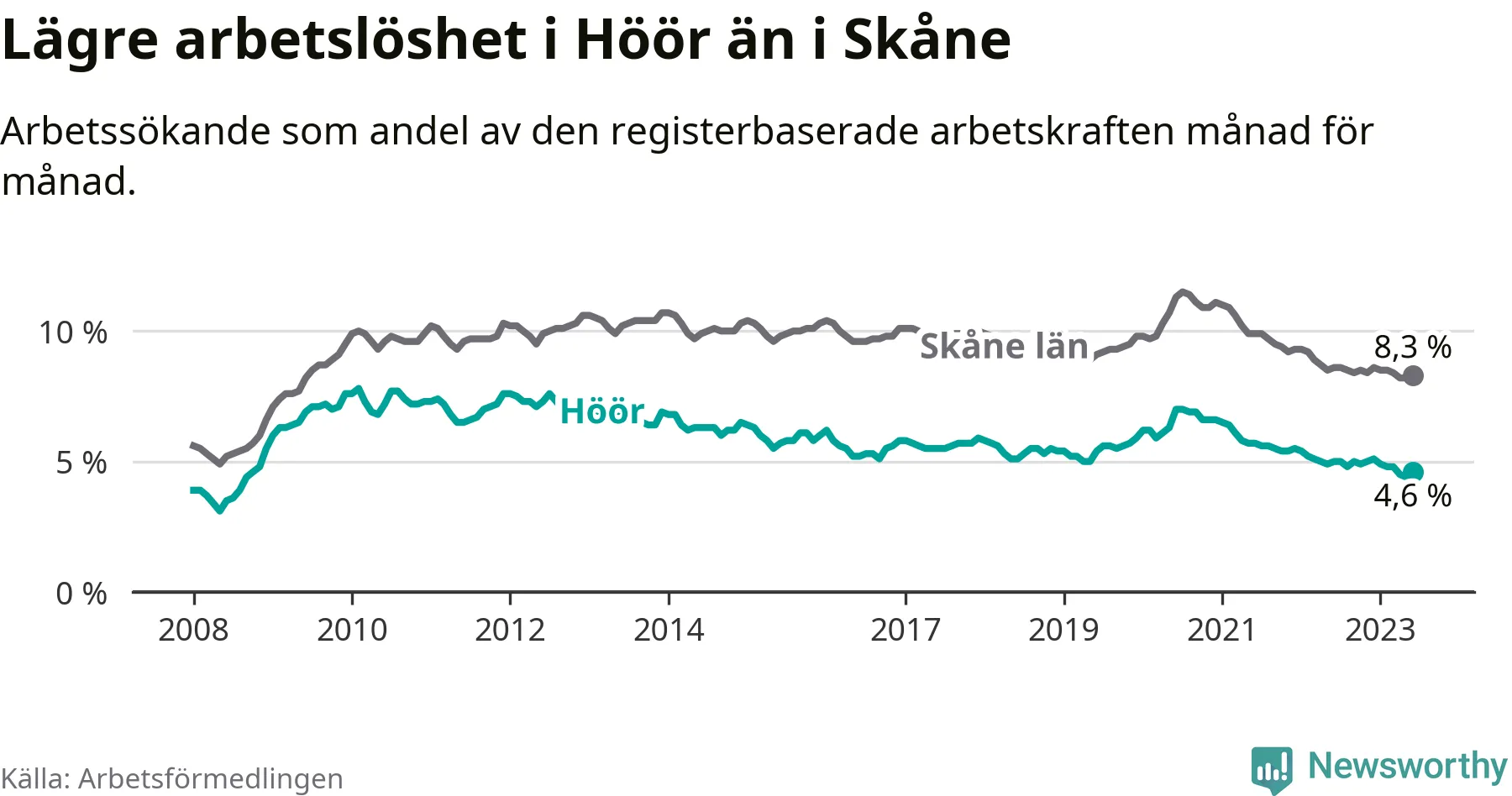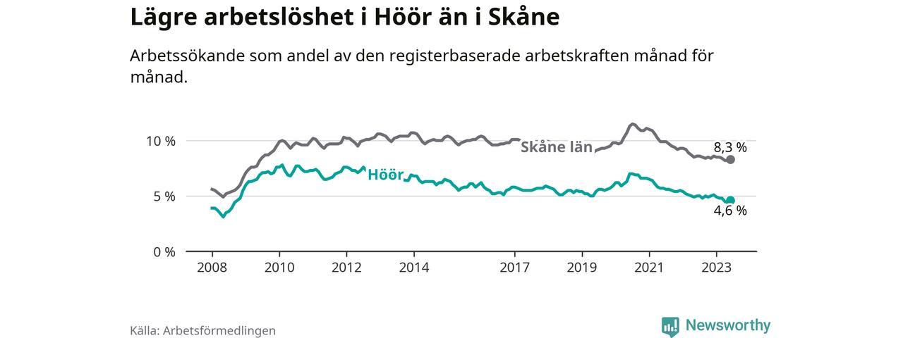 Höör hade redan tidigare lägre arbetslöshet än snittet i hela Skåne län och nu växer klyftan (4,6 procent i kommunen, jämfört med 8,3 procent i hela länet). Vellinge har den lägsta arbetslösheten i länet (3,2 procent), medan Perstorp har den högsta (12,3 procent). För att Höör skulle komma ner i samma arbetslöshetsnivå som Vellinge skulle 114 personer behöva sysselsättas.