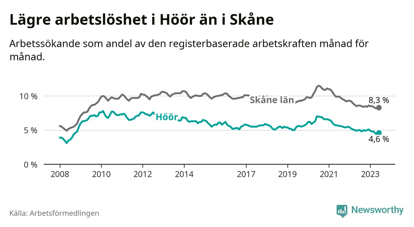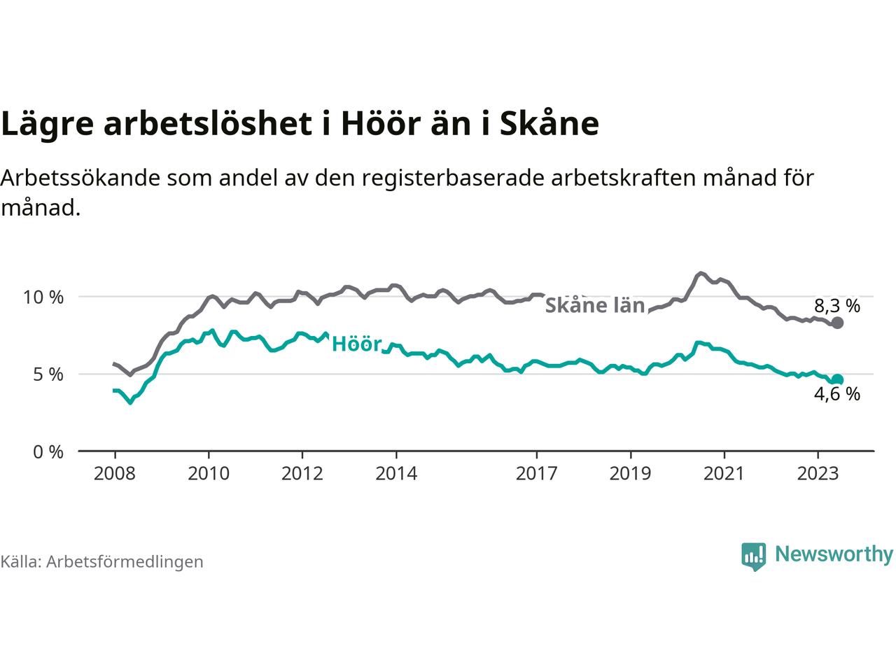 Det är 27:e månaden i följd som arbetslösheten i Höör är lägre än den var under samma tidpunkt året innan. Sedan mars 2021 har arbetslösheten gått ner från 6,1 till 4,6 procent.