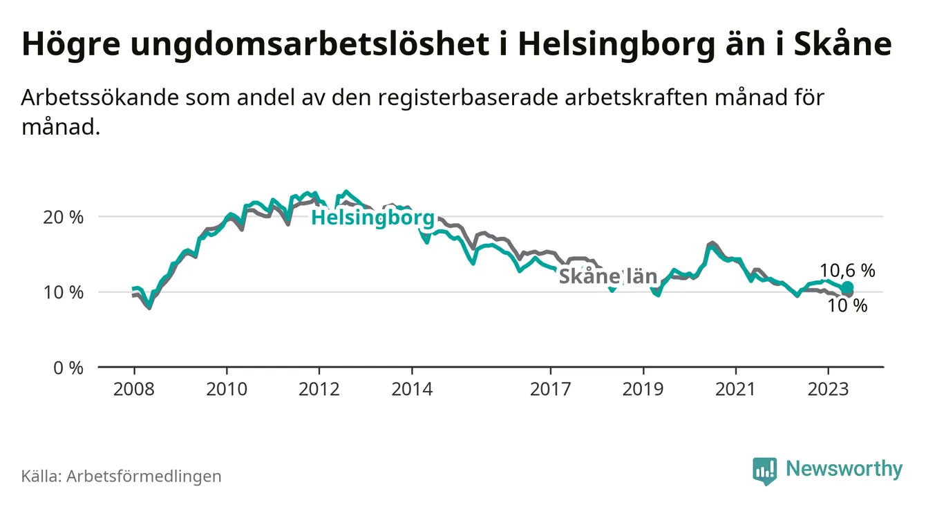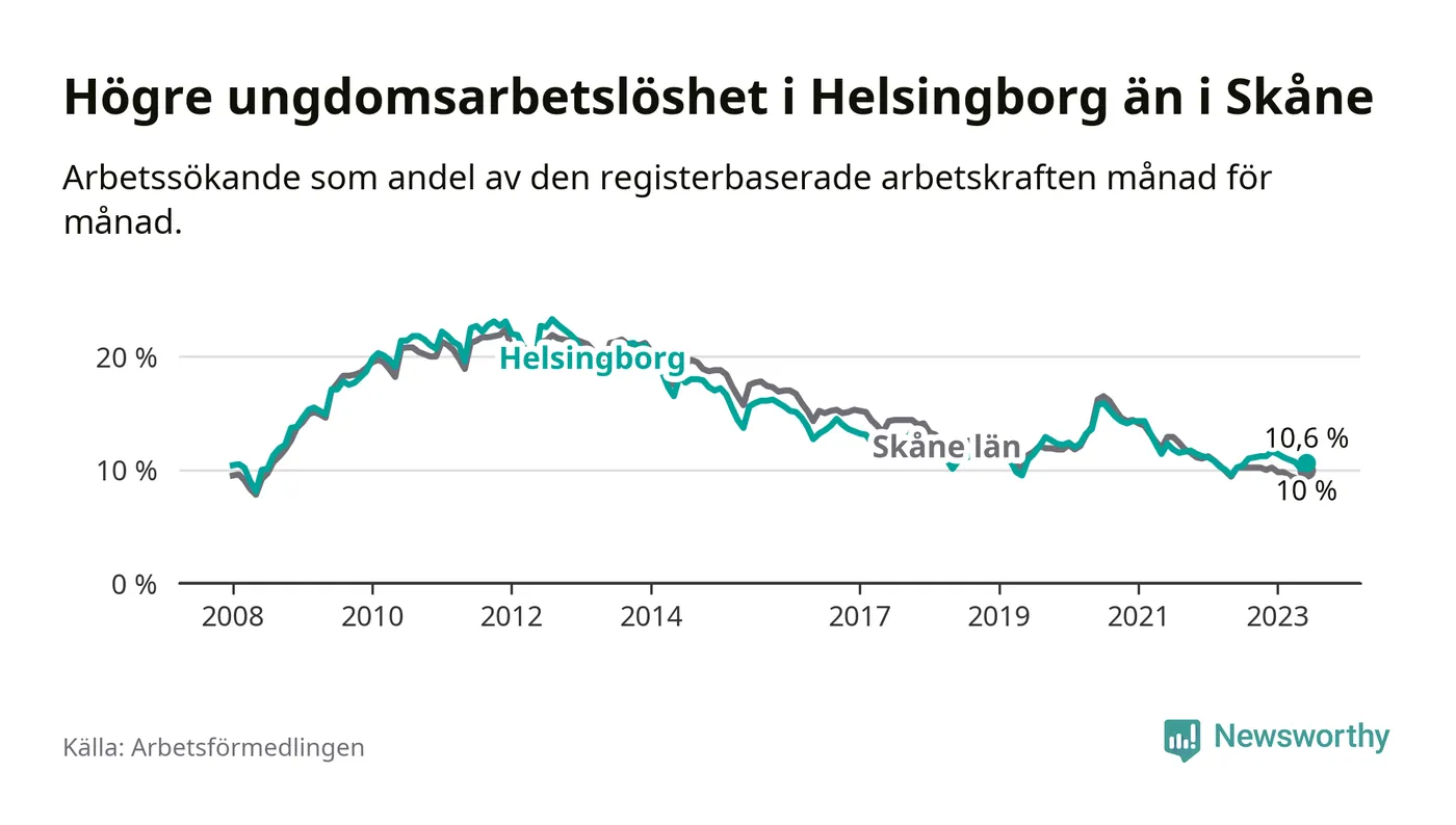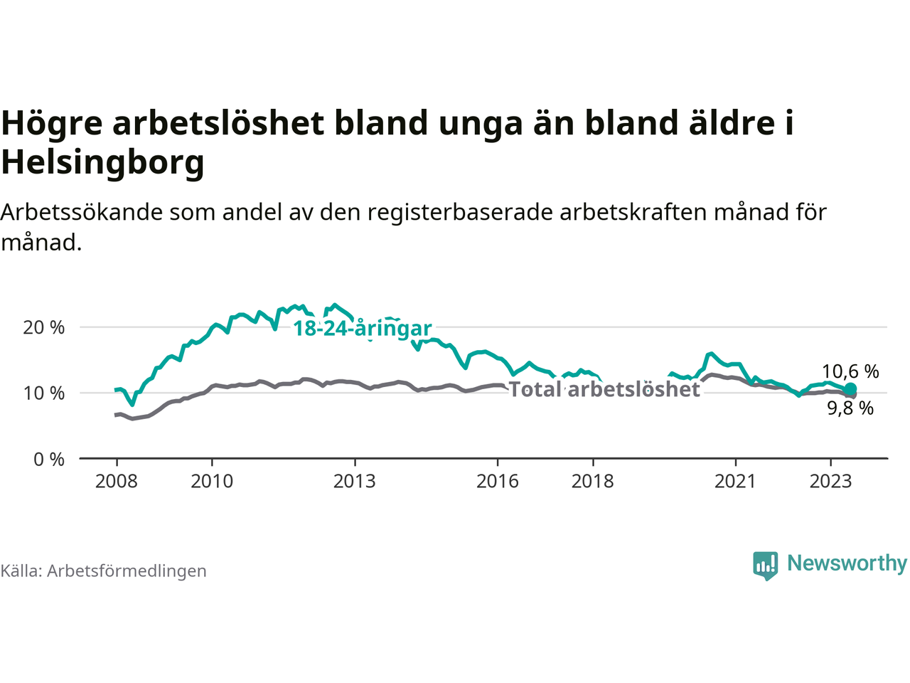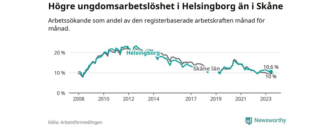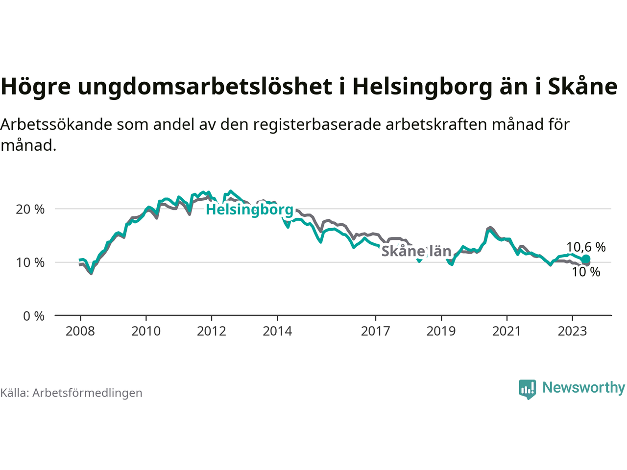 I och med den senaste månadens uppgång har de ungas arbetslöshet i Helsingborg stigit sju månader i följd (upp från 11,2 procent i november 2022 till 10,6 procent nu).