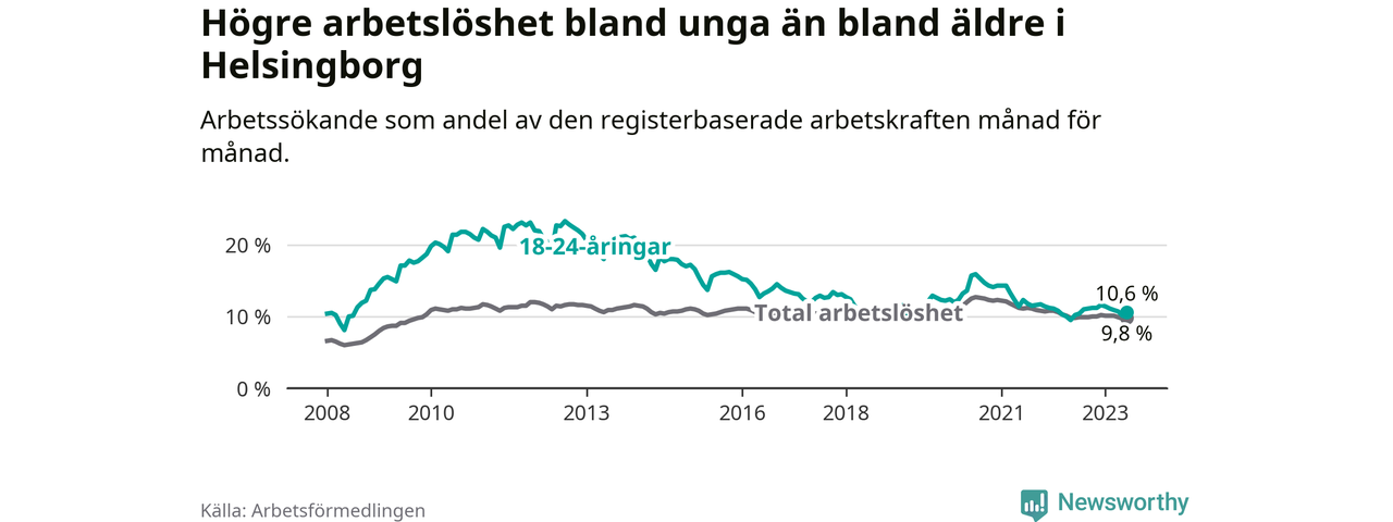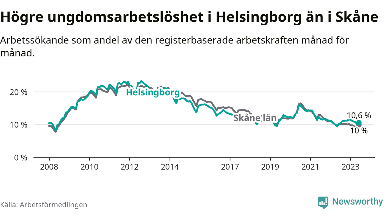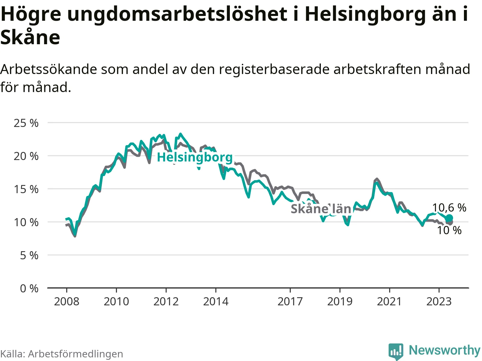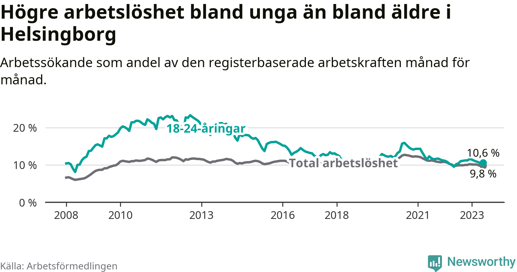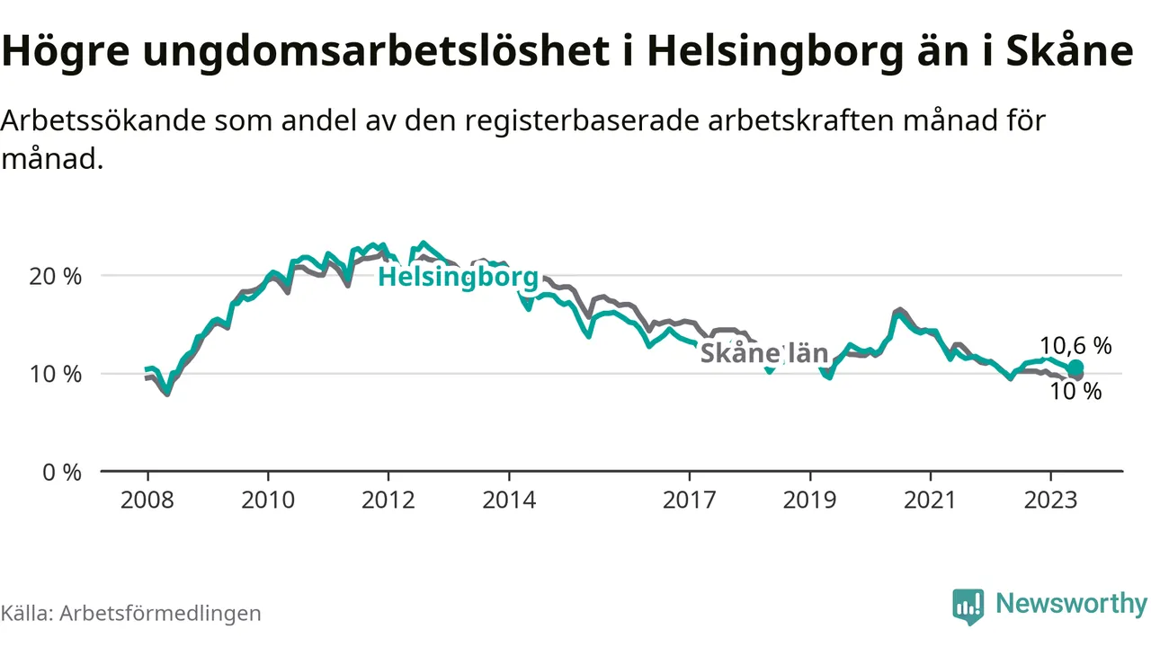 I och med den senaste månadens uppgång har de ungas arbetslöshet i Helsingborg stigit sju månader i följd (upp från 11,2 procent i november 2022 till 10,6 procent nu).