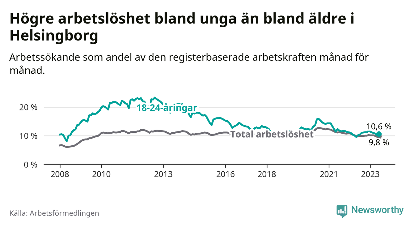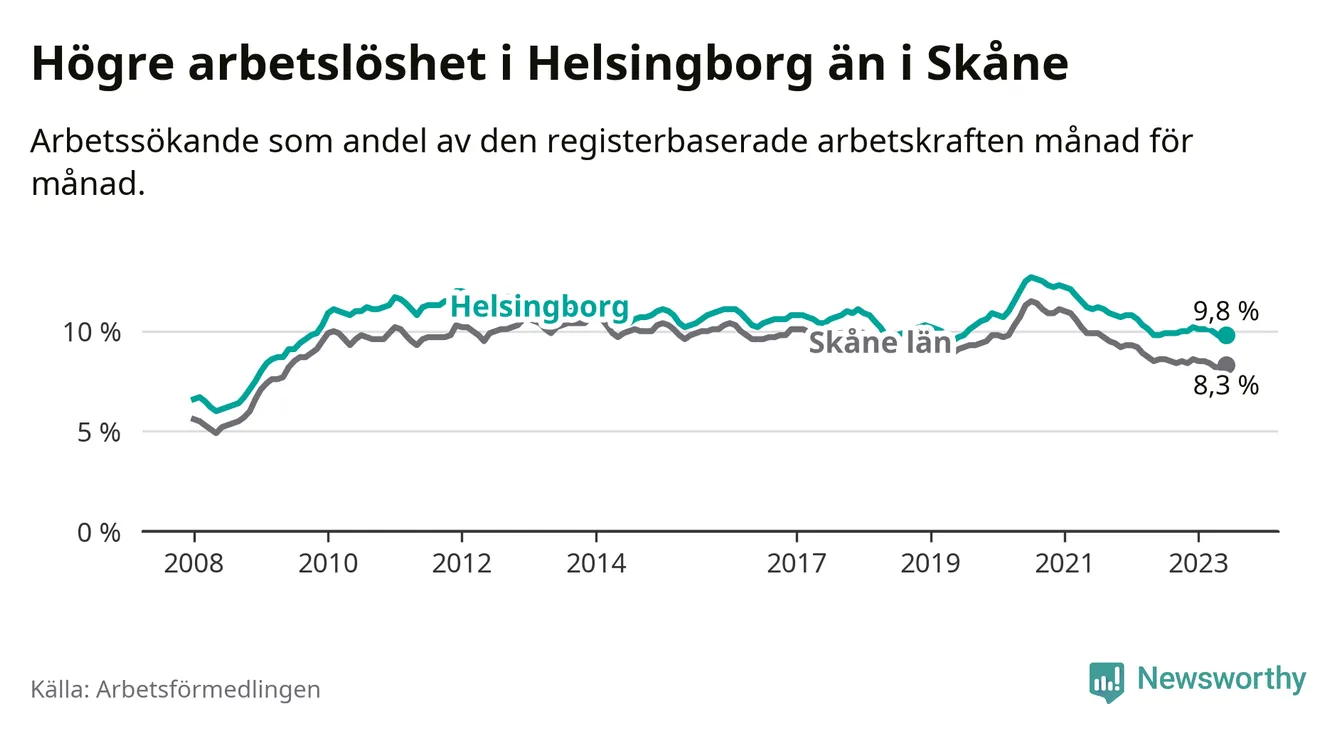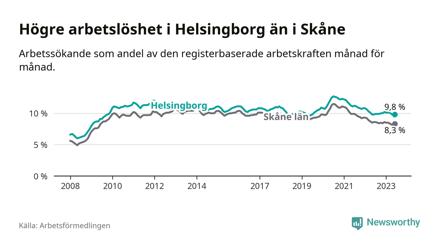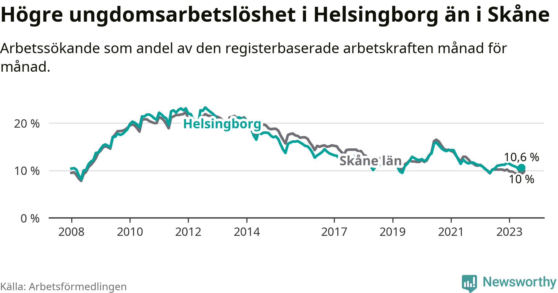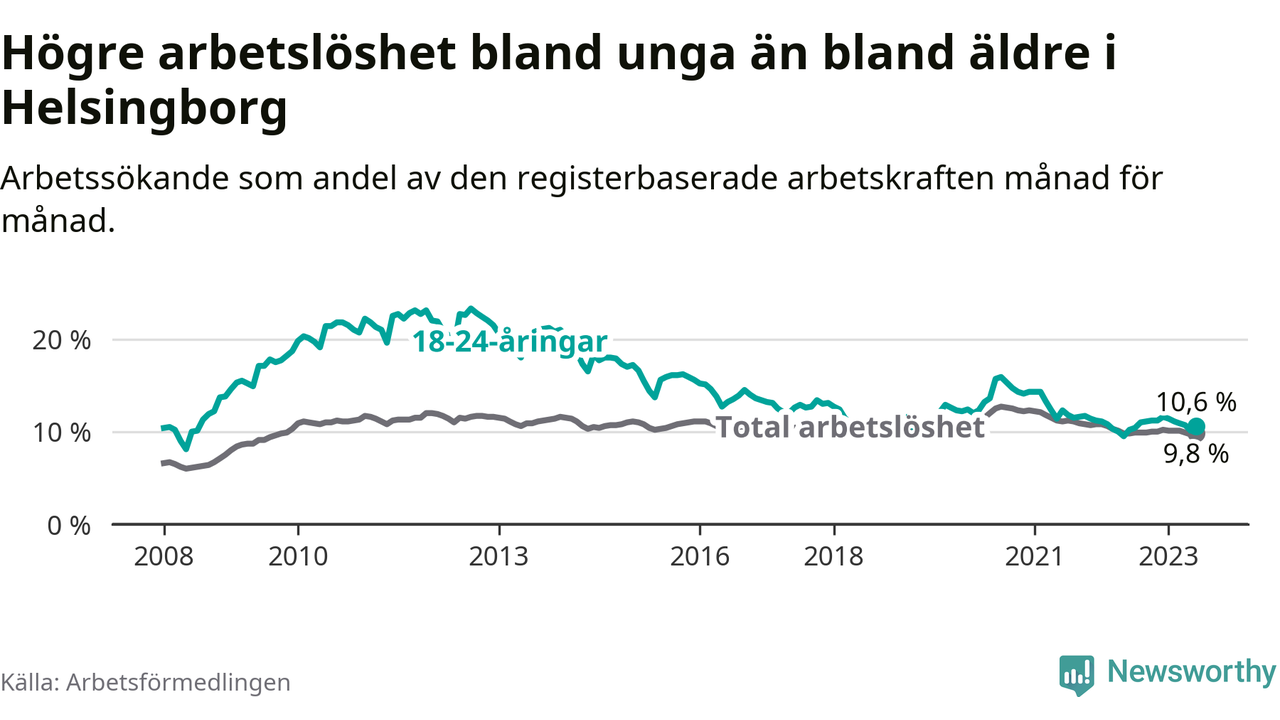 I och med den senaste månadens uppgång har de ungas arbetslöshet i Helsingborg stigit sju månader i följd (upp från 11,2 procent i november 2022 till 10,6 procent nu).