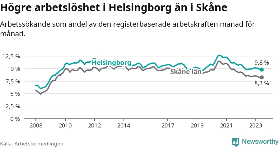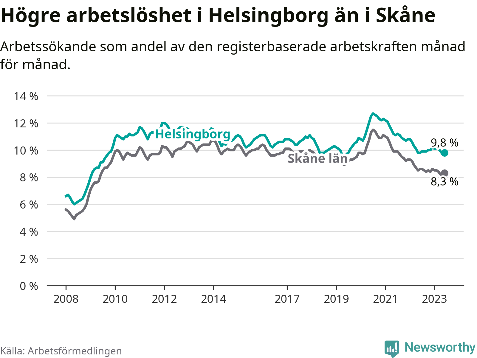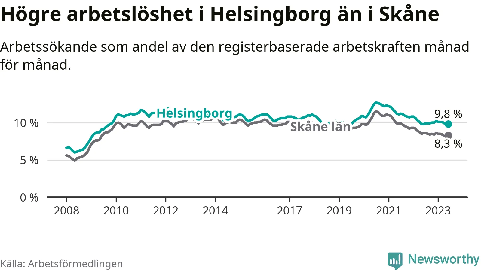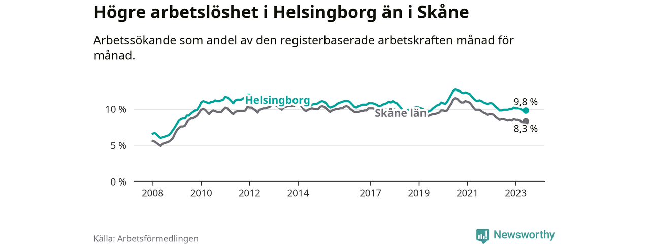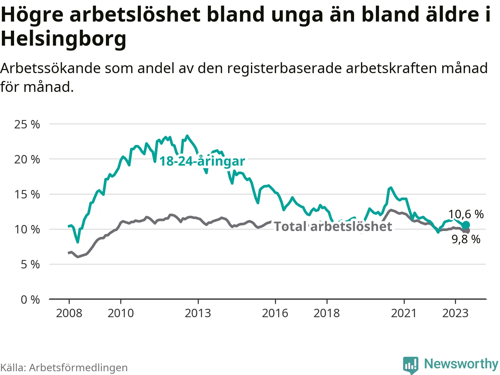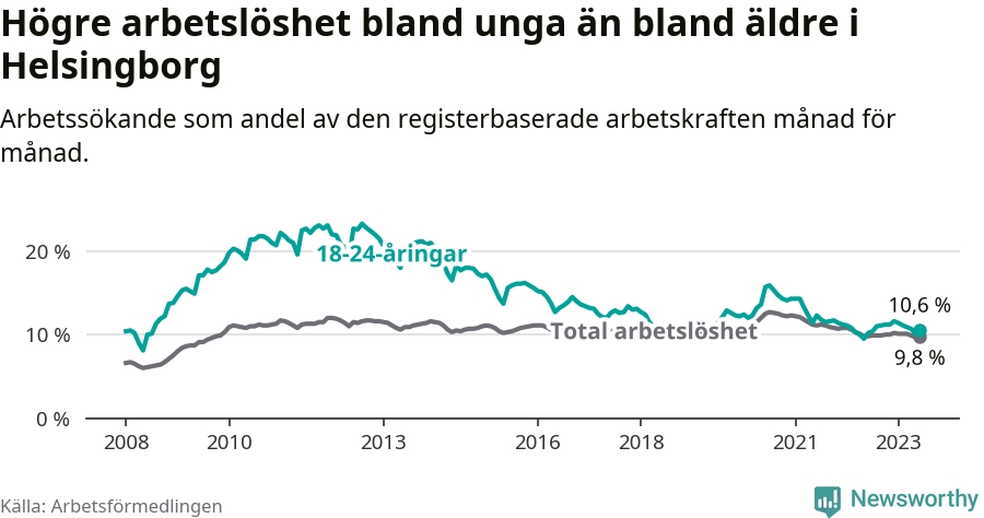 I och med den senaste månadens uppgång har de ungas arbetslöshet i Helsingborg stigit sju månader i följd (upp från 11,2 procent i november 2022 till 10,6 procent nu).