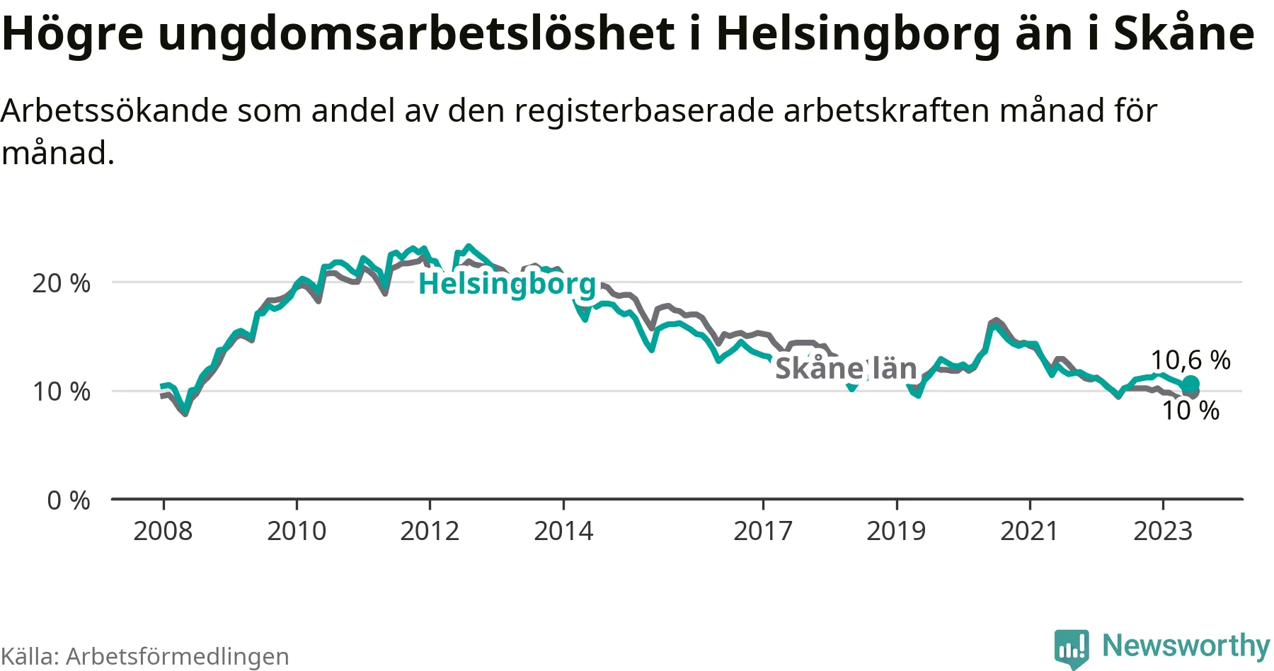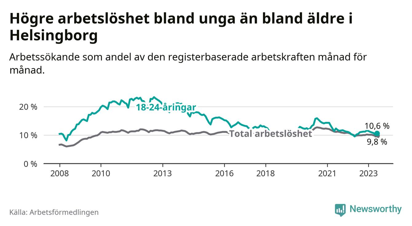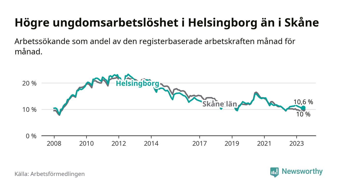 Precis som den totala arbetslösheten ligger ungdomsarbetslösheten i Helsingborg högre än i Skåne som helhet. Skillnaden mellan kommunen och länet är 0,6 procentenheter.
