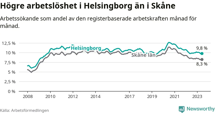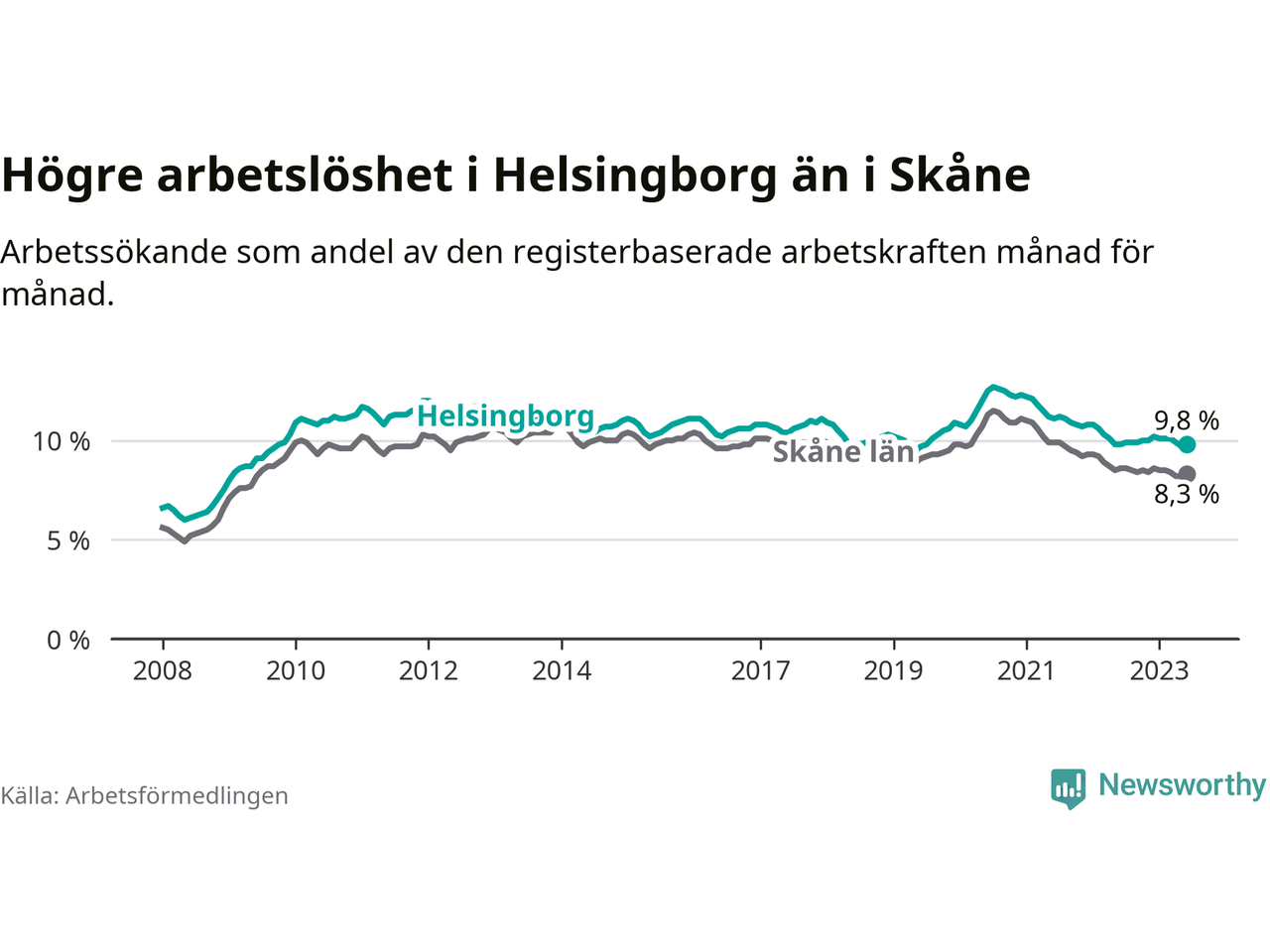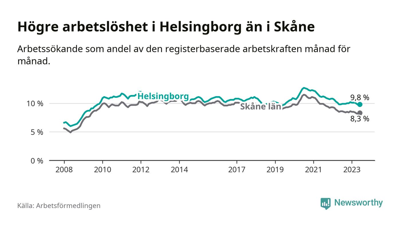 Arbetslösheten i Helsingborg ligger över nivån i hela Skåne län (9,8 procent i kommunen, jämfört med 8,3 procent i hela länet). Vellinge har den lägsta arbetslösheten i länet (3,2 procent), medan Perstorp har den högsta (12,3 procent). För att Helsingborg skulle komma ner i samma arbetslöshetsnivå som Vellinge skulle 4 941 personer behöva sysselsättas.