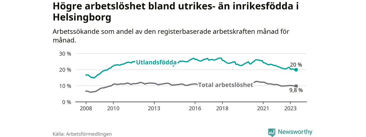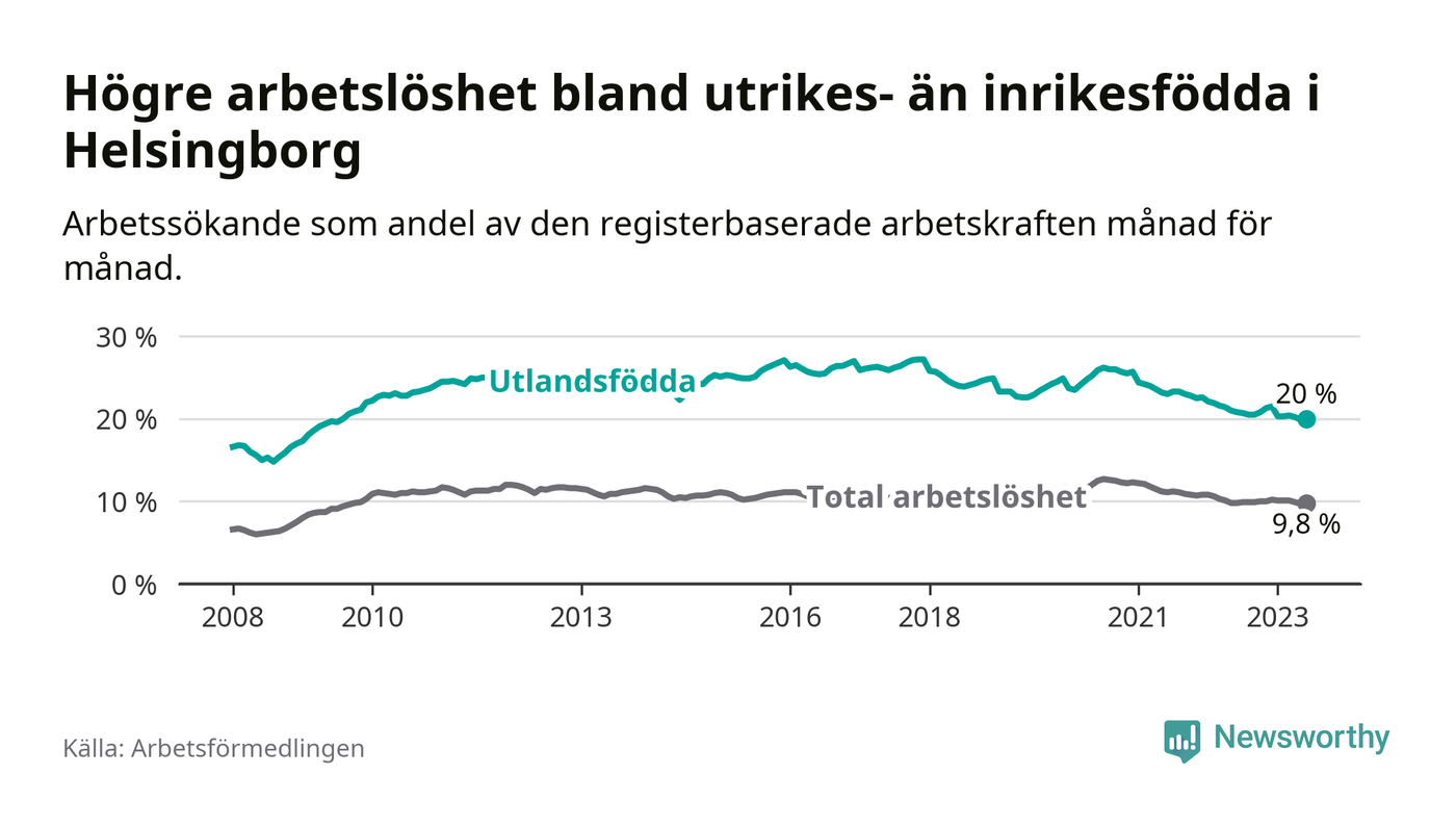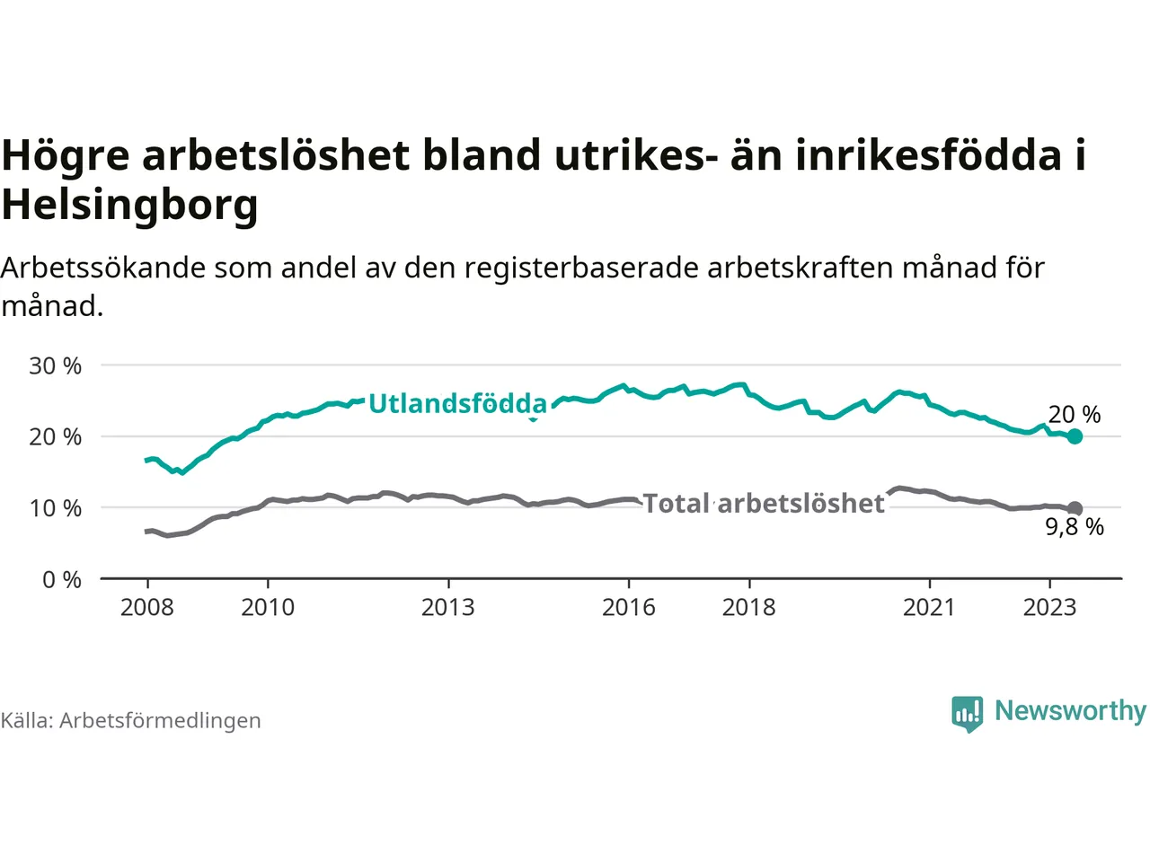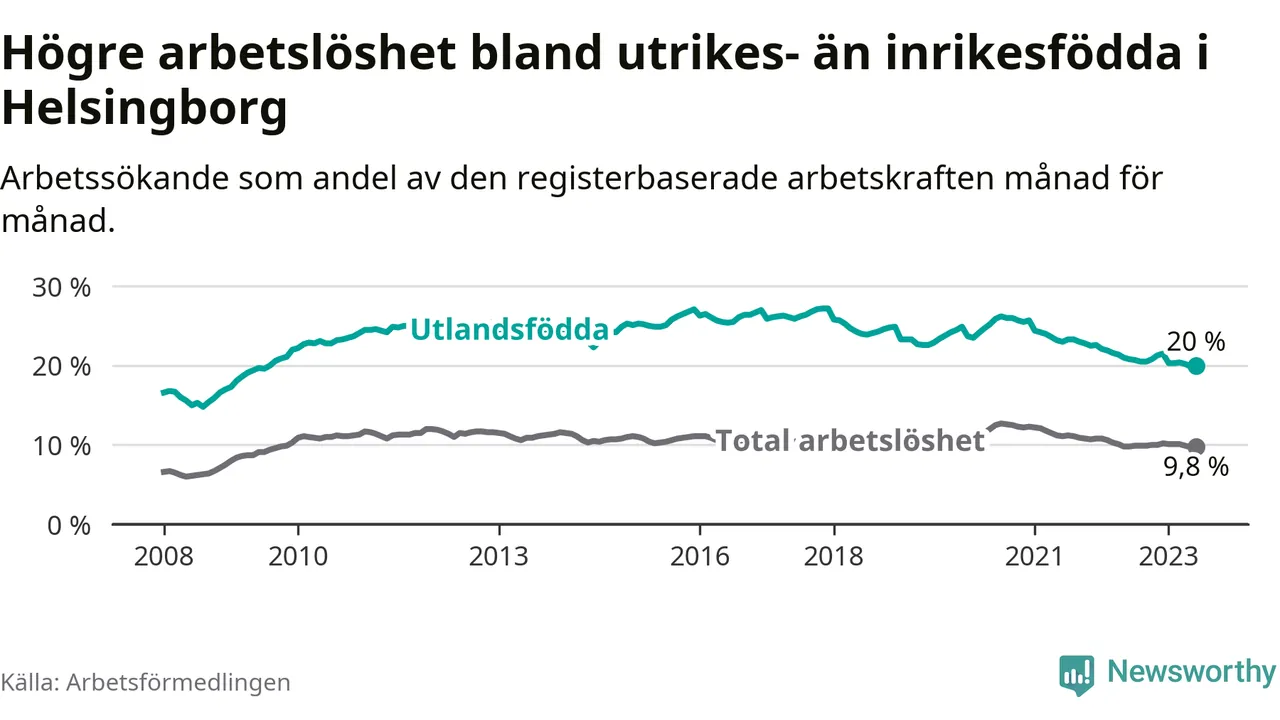 Skillnaden i arbetslöshet mellan utrikesfödda och hela befolkningen är 10,2 procentenheter i Helsingborg. Det är en mindre skillnad än för ett år sedan (−0,8 procentenheter).
