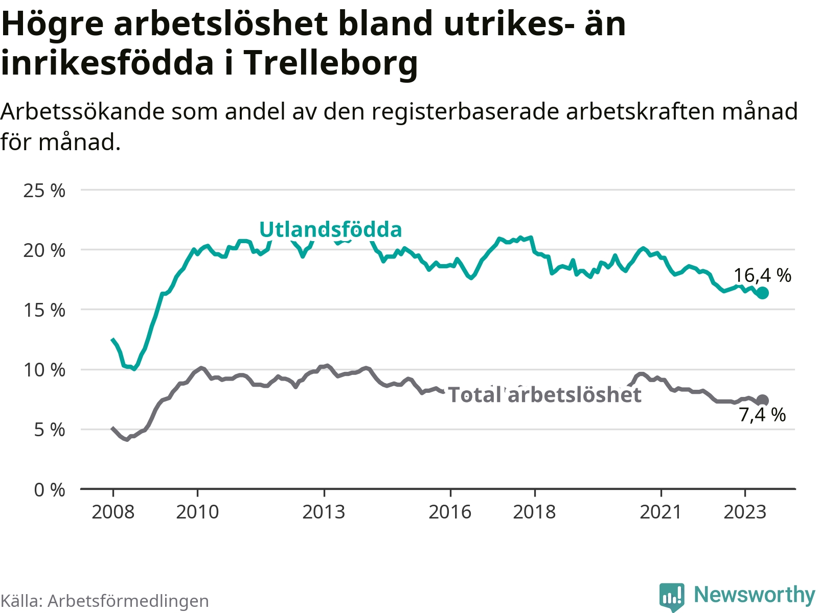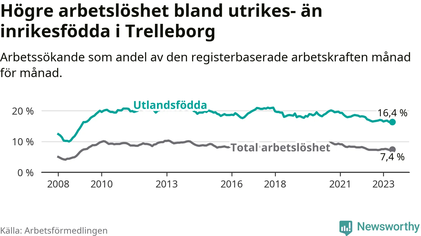Arbetslösheten bland utlandsfödda var 16,4 procent i Trelleborg under juni månad, motsvarande 769 av 4 689 personer. Det är 0,3 procentenheter färre än vid samma tidpunkt i fjol (+26 om man räknar personer). Därmed har de utlandsföddas arbetslöshet varit lägre än vid samma tidpunkt i fjol i över två år i sträck. Sedan mars 2021 har arbetslösheten bland utlandsfödda minskat från 18,7 till 16,4 procent.