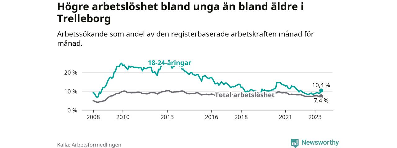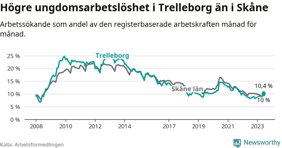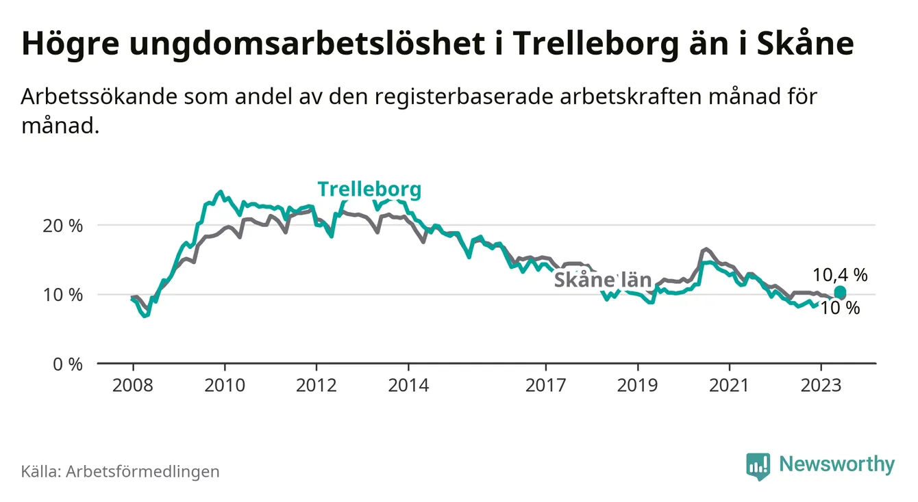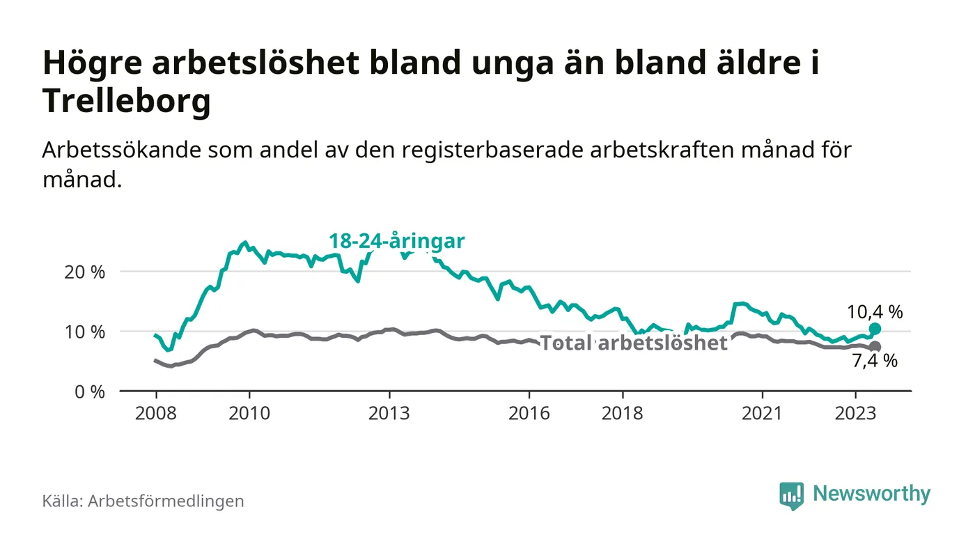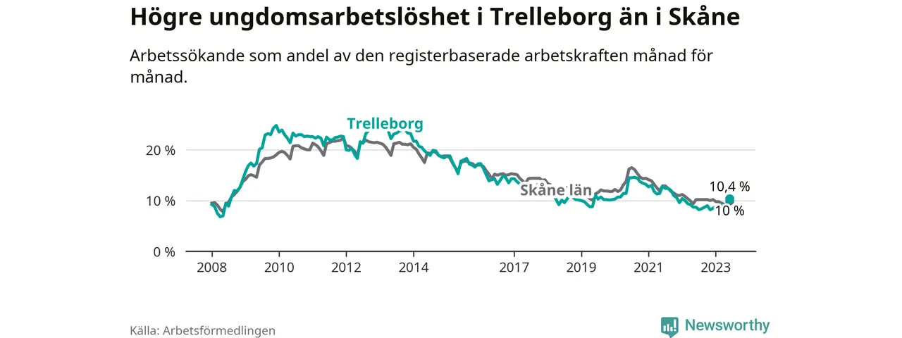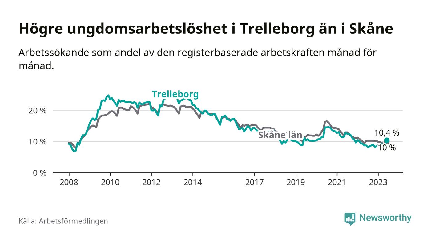 Medan Trelleborg har lägre total arbetslöshet än Skåne, ligger ungdomsarbetslösheten 0,4 procentenheter högre i Trelleborg.