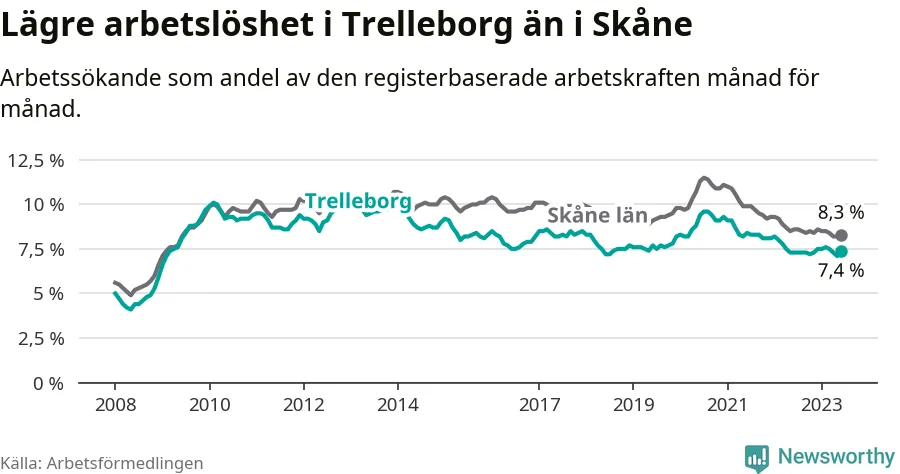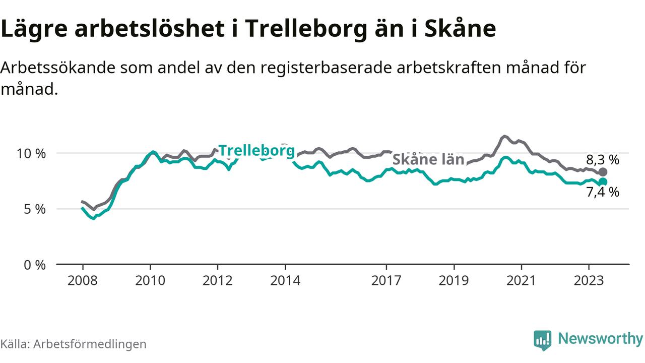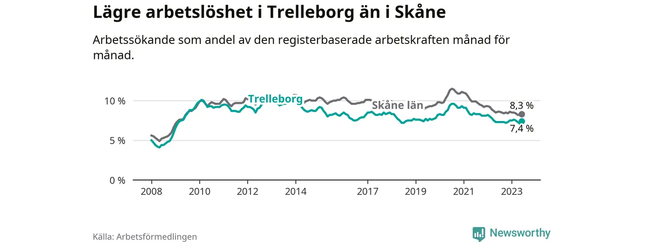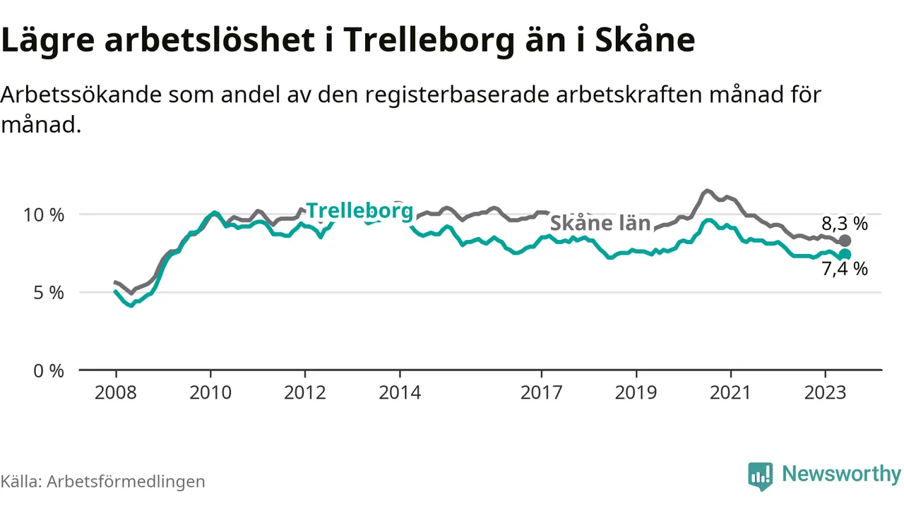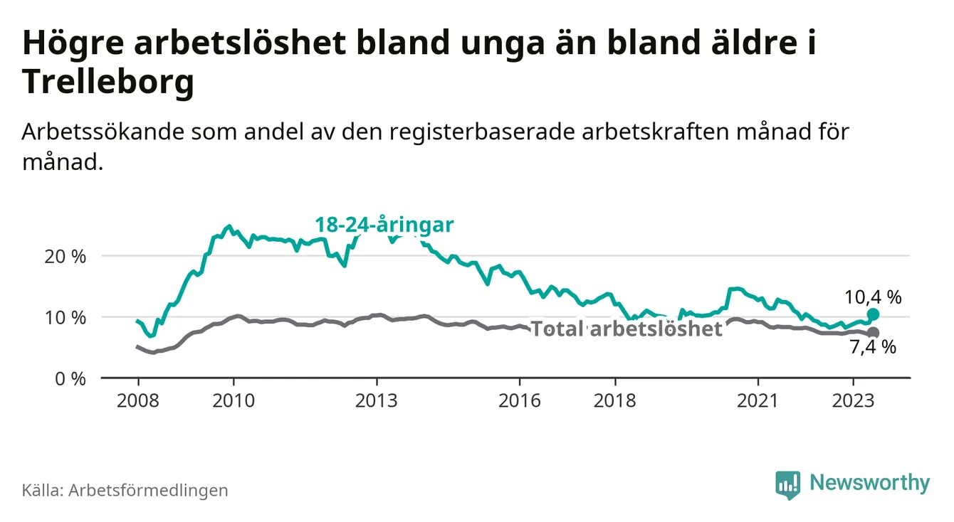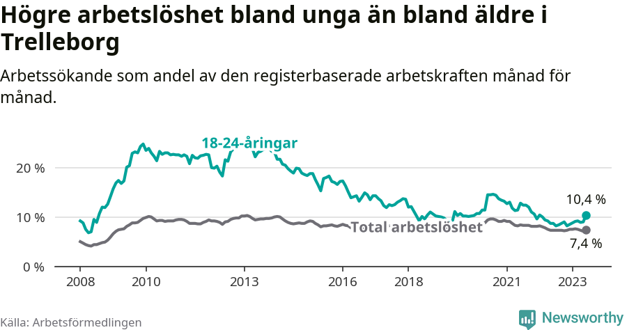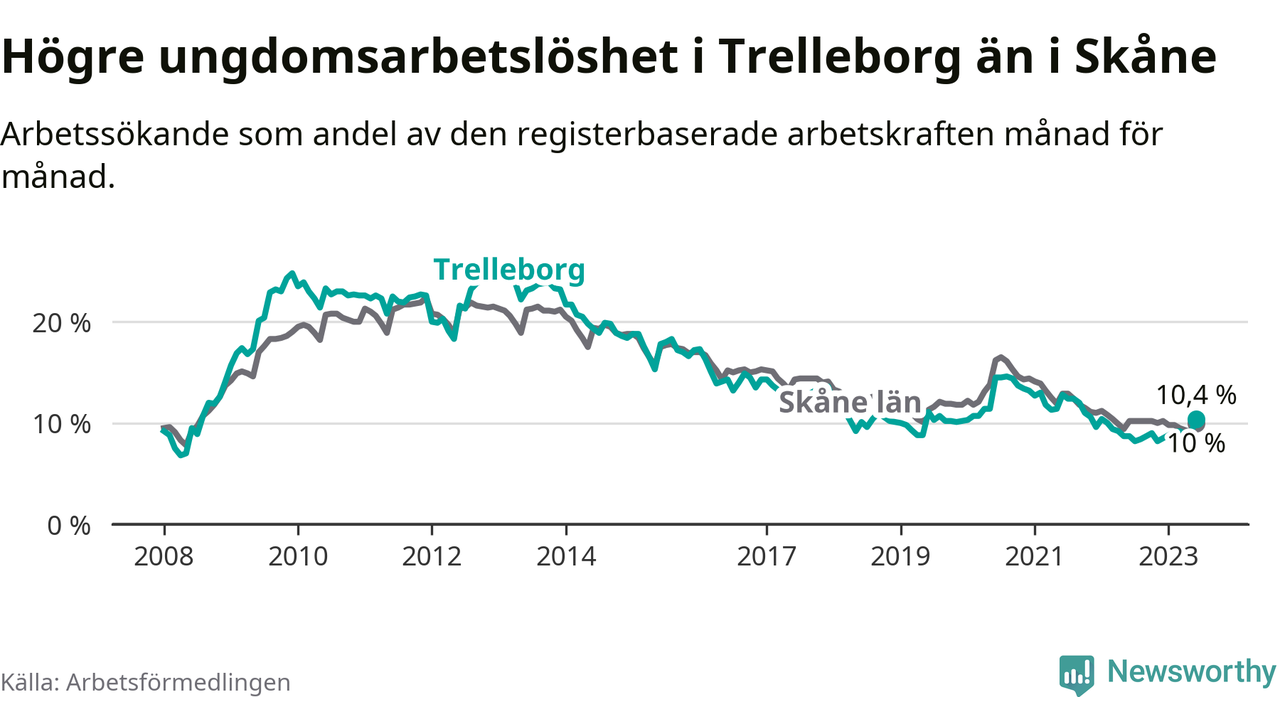 Medan Trelleborg har lägre total arbetslöshet än Skåne, ligger ungdomsarbetslösheten 0,4 procentenheter högre i Trelleborg.