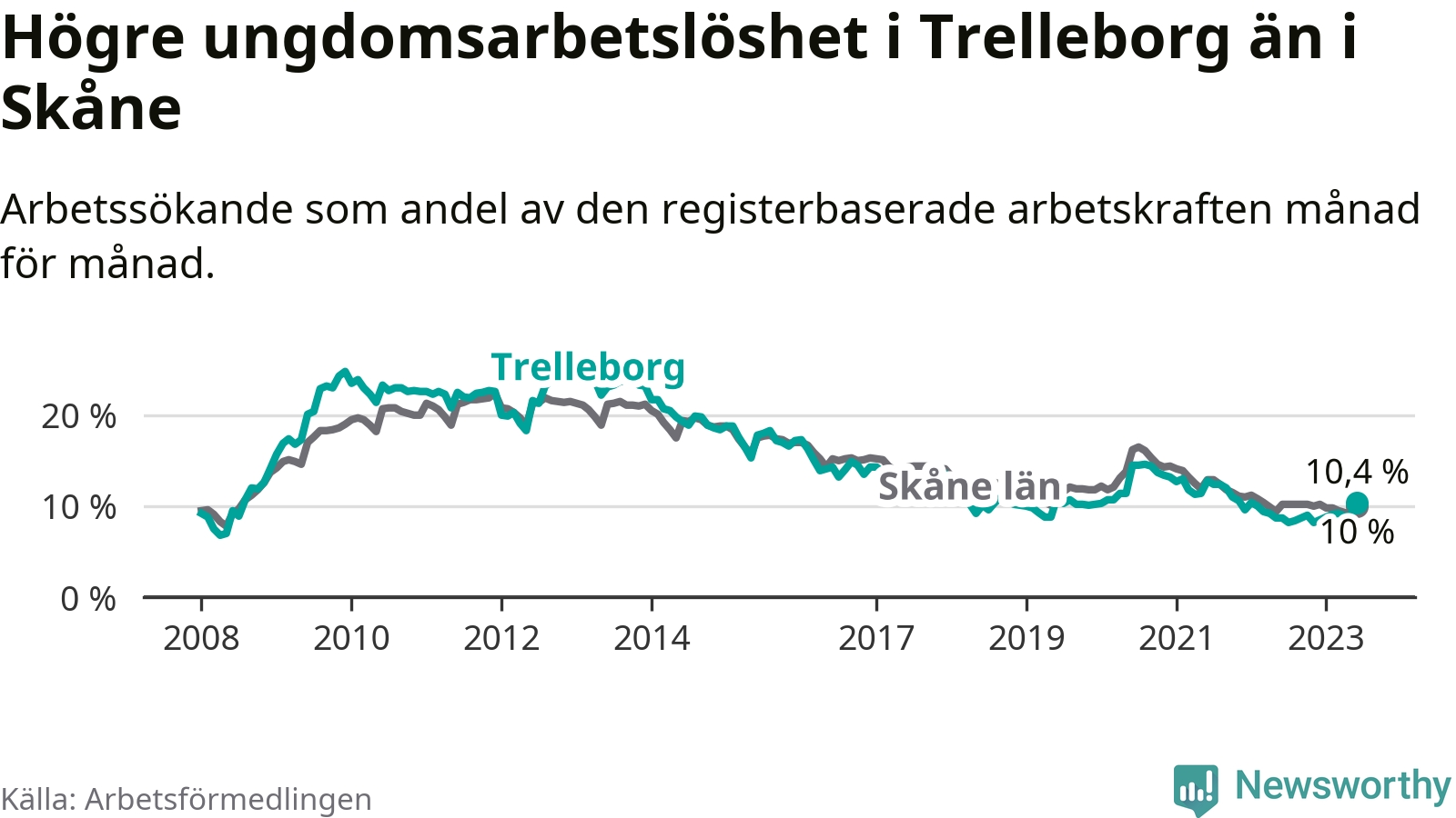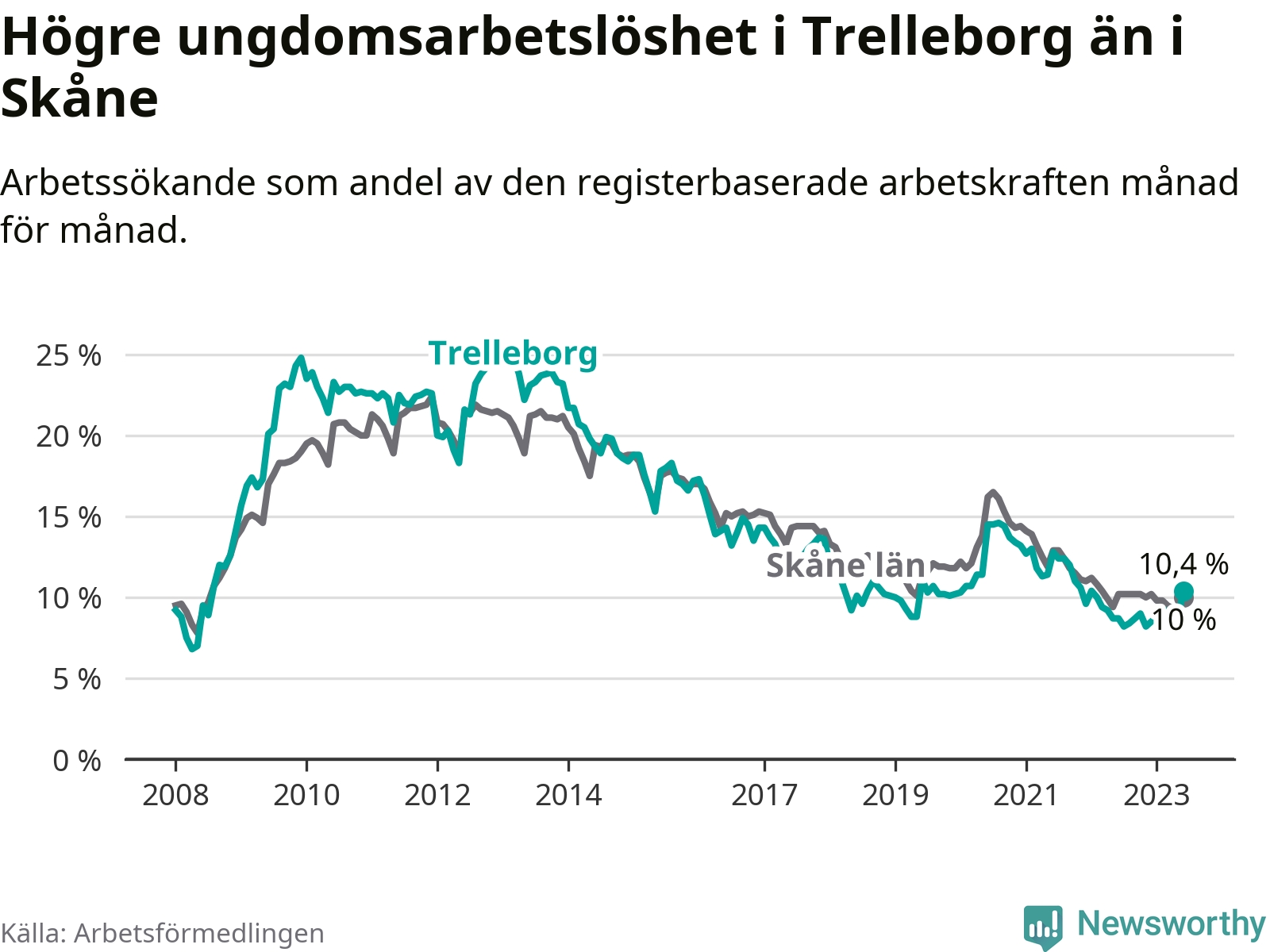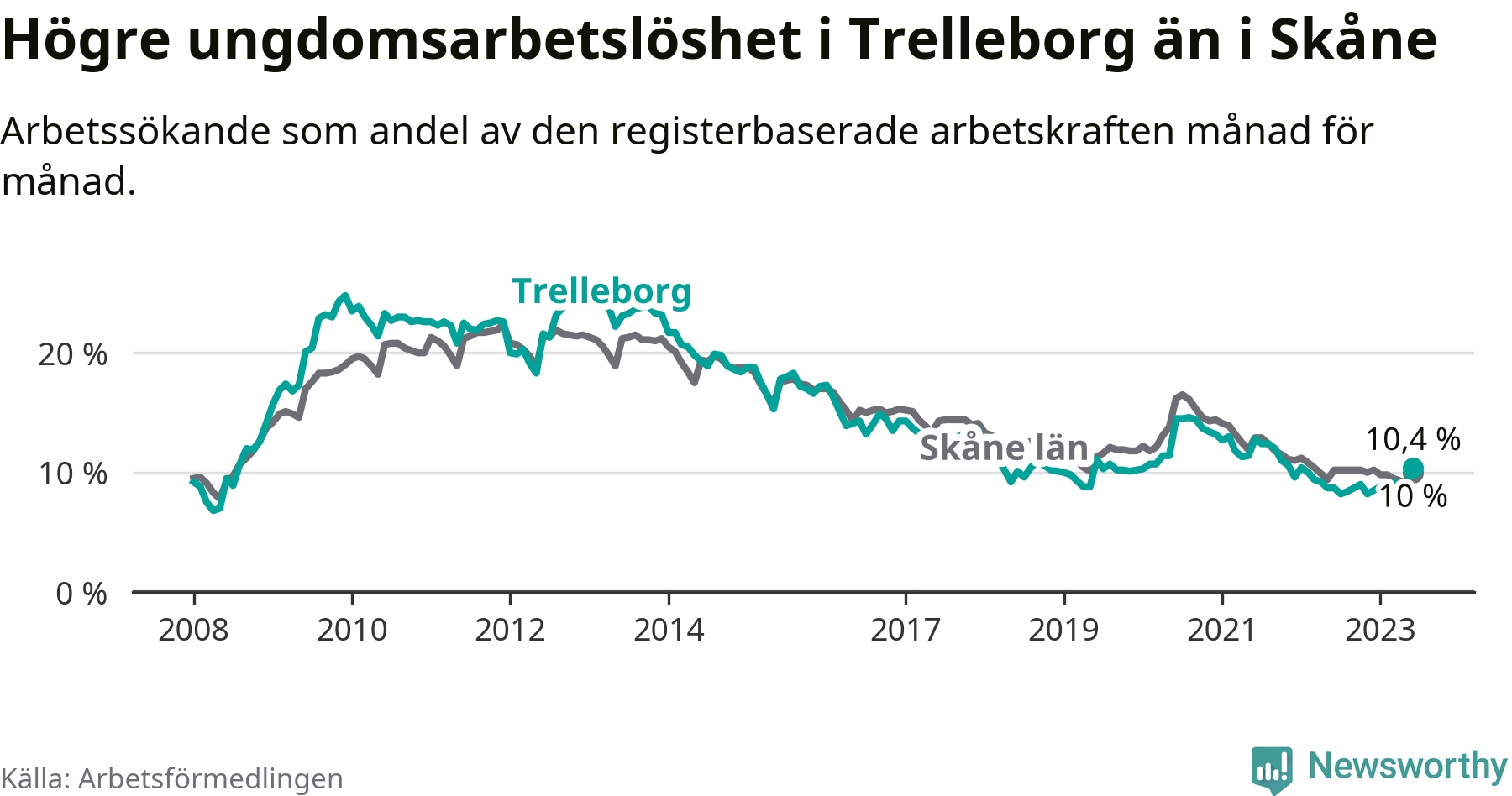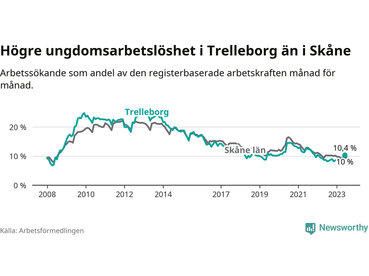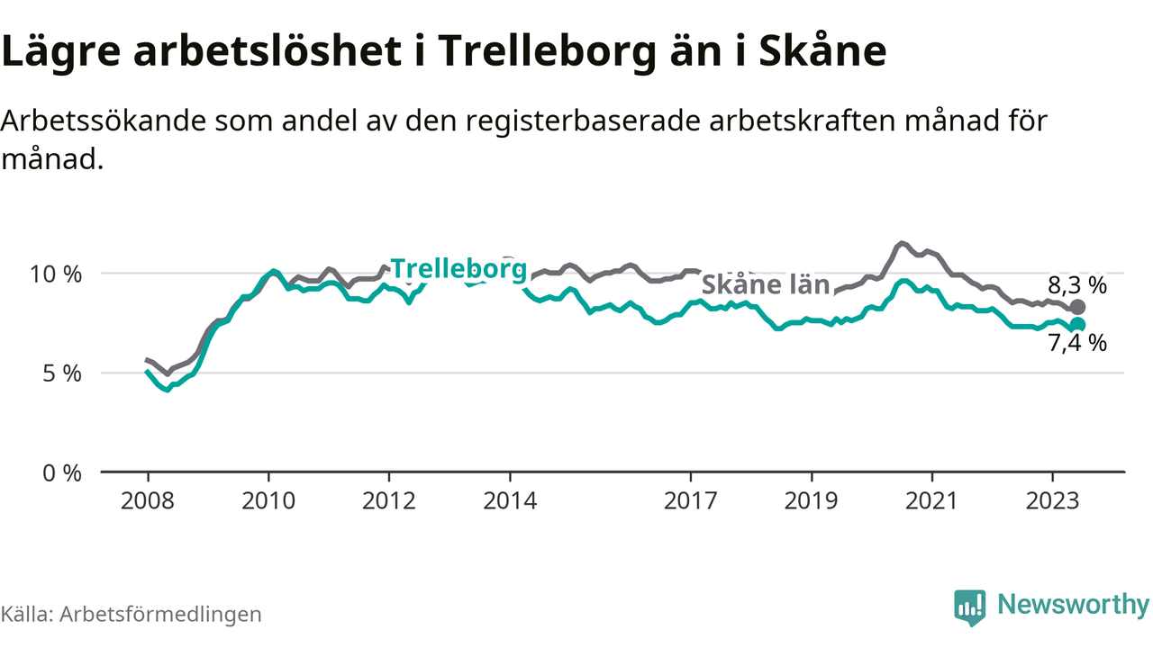 Medan Trelleborg har lägre total arbetslöshet än Skåne, ligger ungdomsarbetslösheten 0,4 procentenheter högre i Trelleborg.
