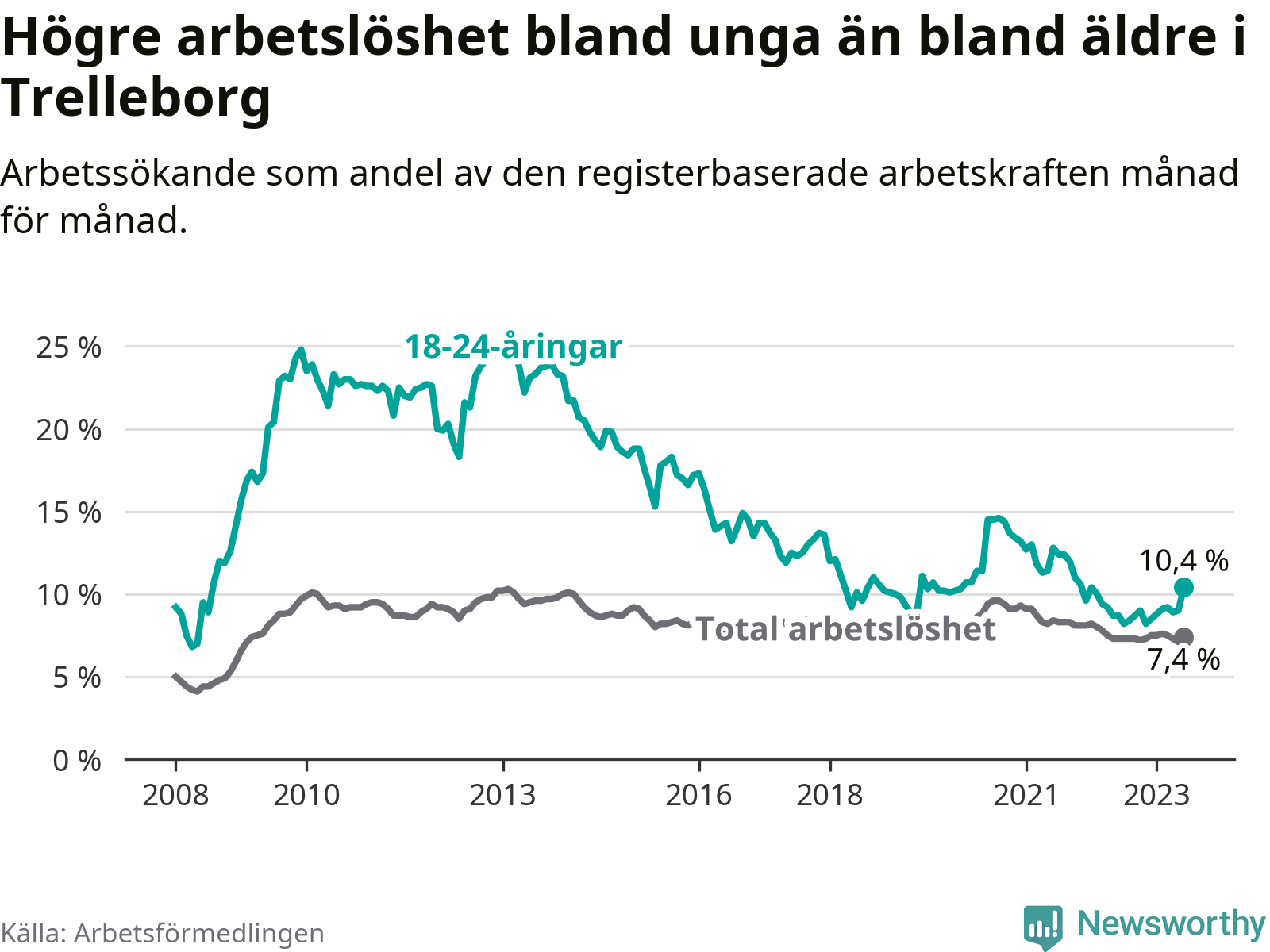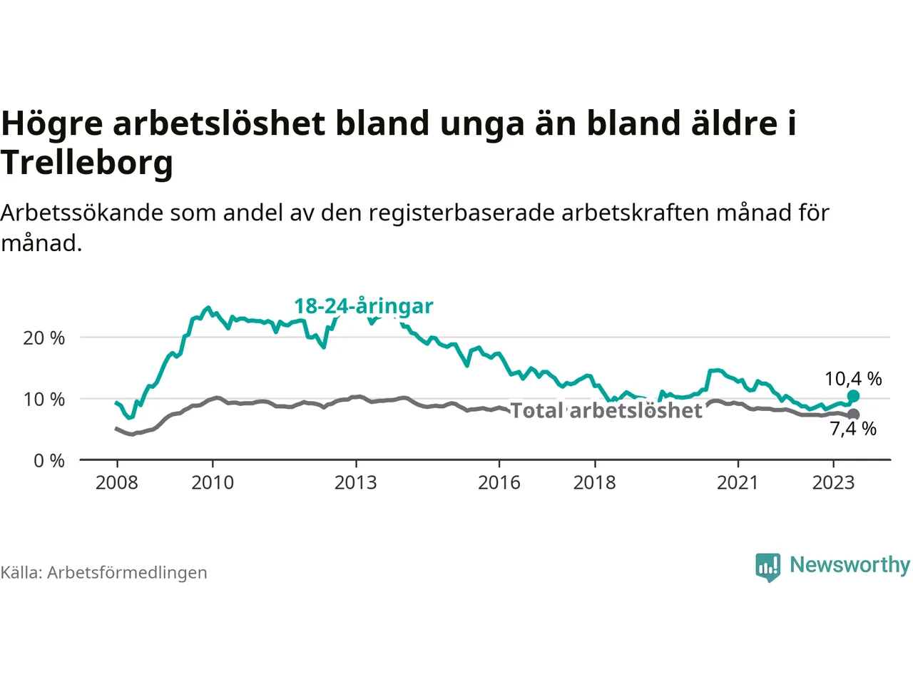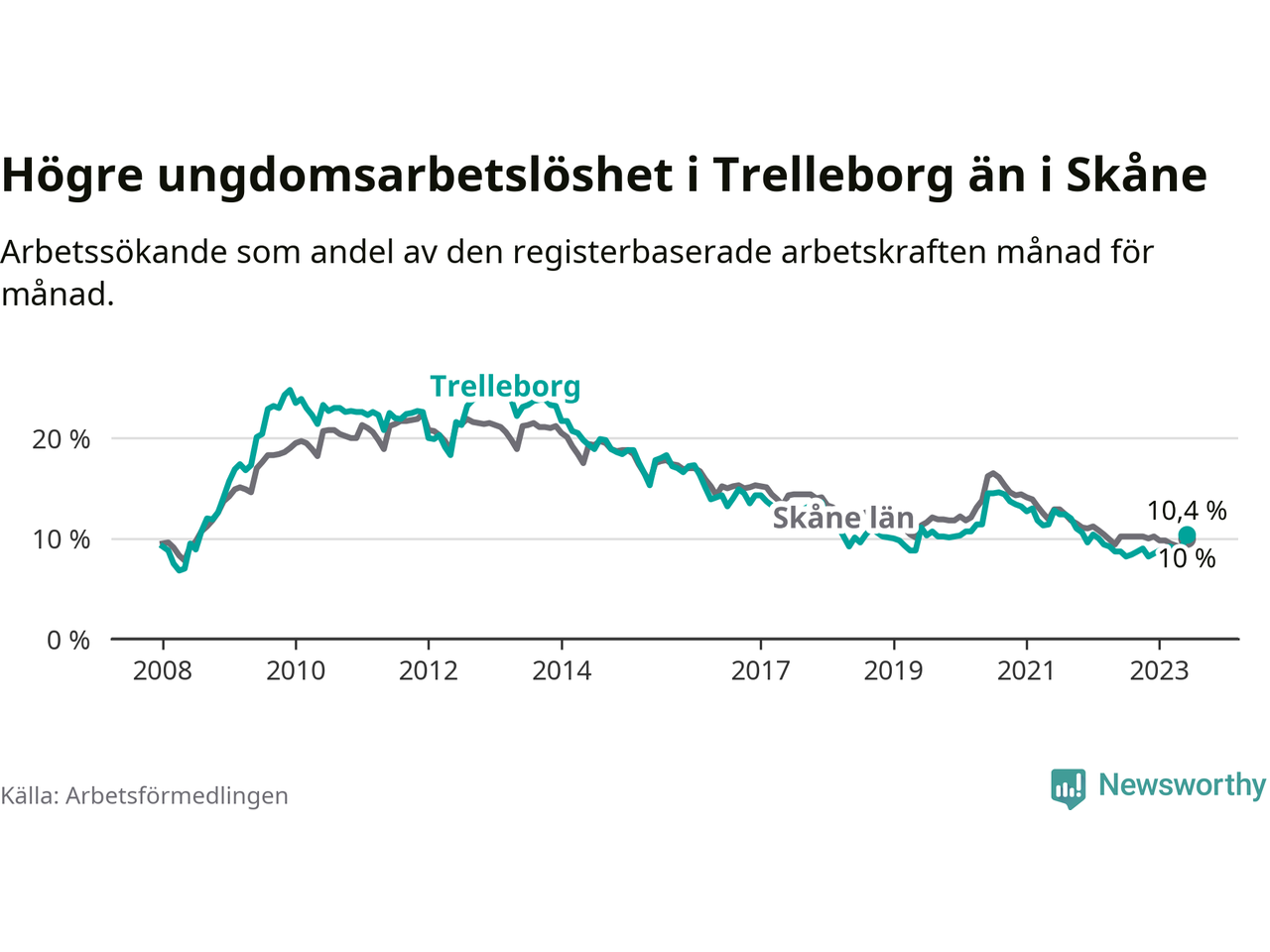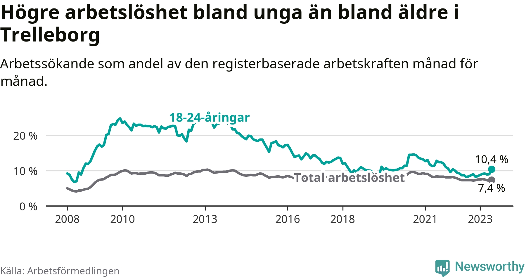 Medan Trelleborg har lägre total arbetslöshet än Skåne, ligger ungdomsarbetslösheten 0,4 procentenheter högre i Trelleborg.